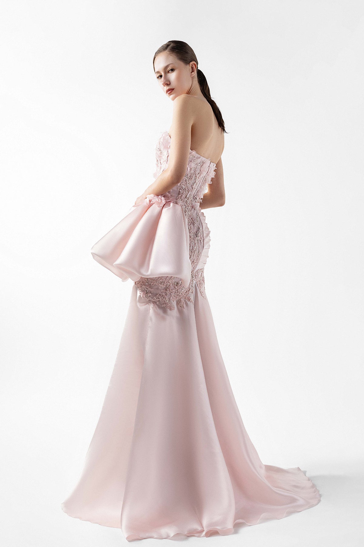 Light pink organza mermaid dress. Featuring a delicate strapless bodice with exquisite floral lace embellishments and subtle draping. Complemented with a peplum at the waist that enhances the silhouette and creates a stunning curve-enhancing hip detail. Completed with a flows into a multi-layered organza skirt.