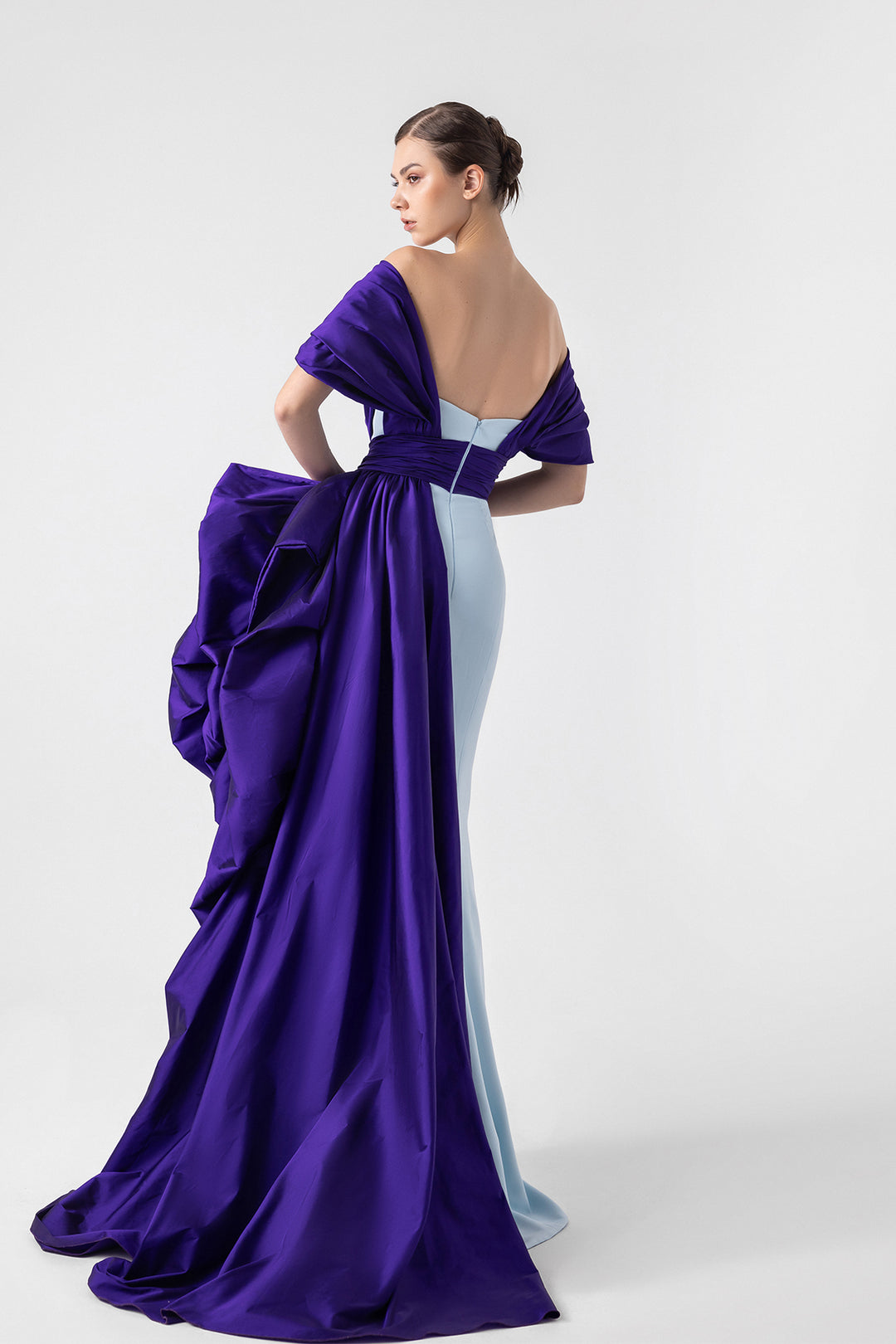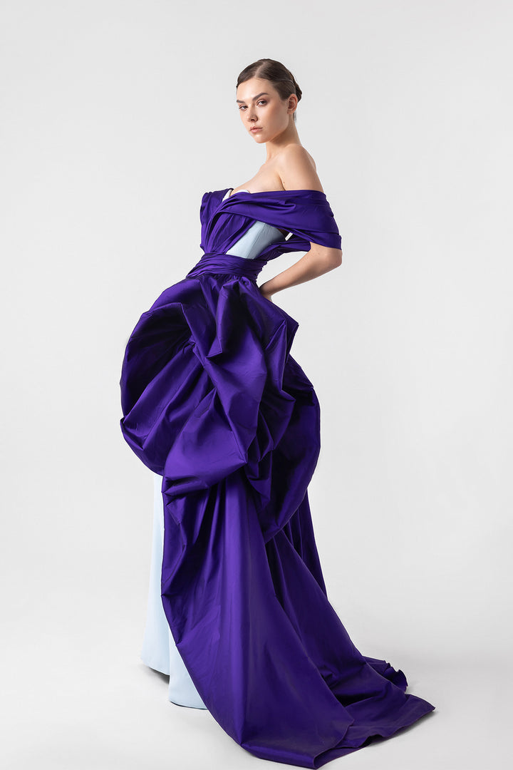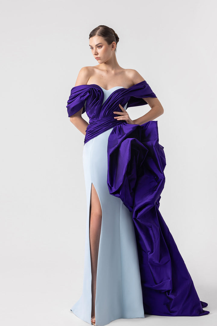 Ice blue crepe & purple taffeta overlay dress. Featuring off-the-shoulder neckline and thigh-high slit. Complemented with voluminous ruffle that cascades from the waist to the hem.