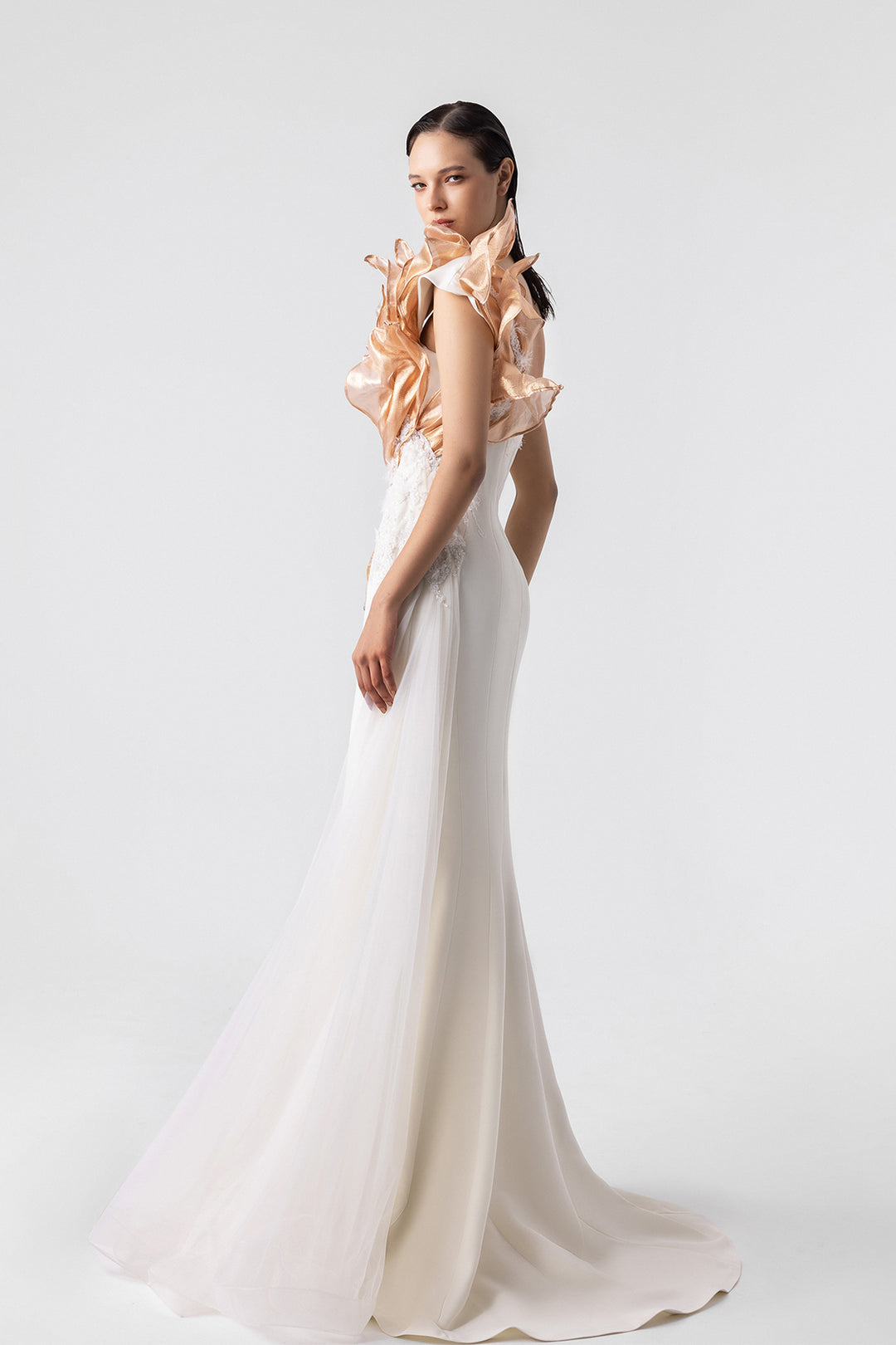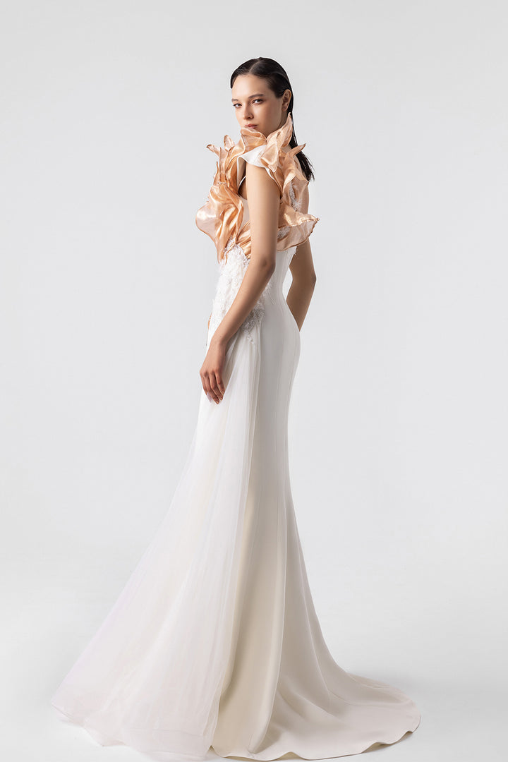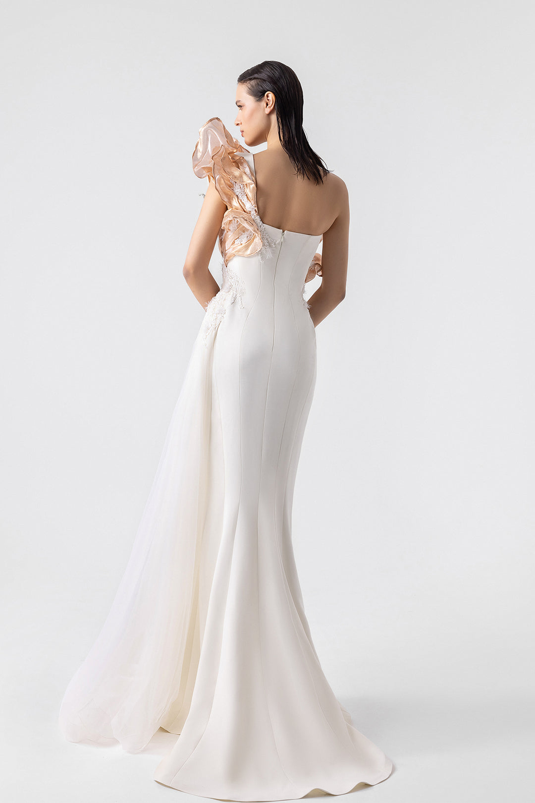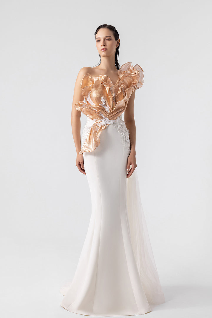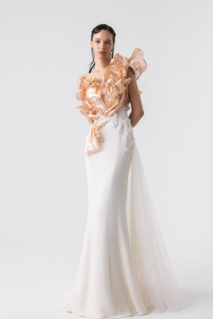 Bronze and off-white one-shoulder mermaid dress. Featuring sheer tulle. Complemented by a crepe base.
