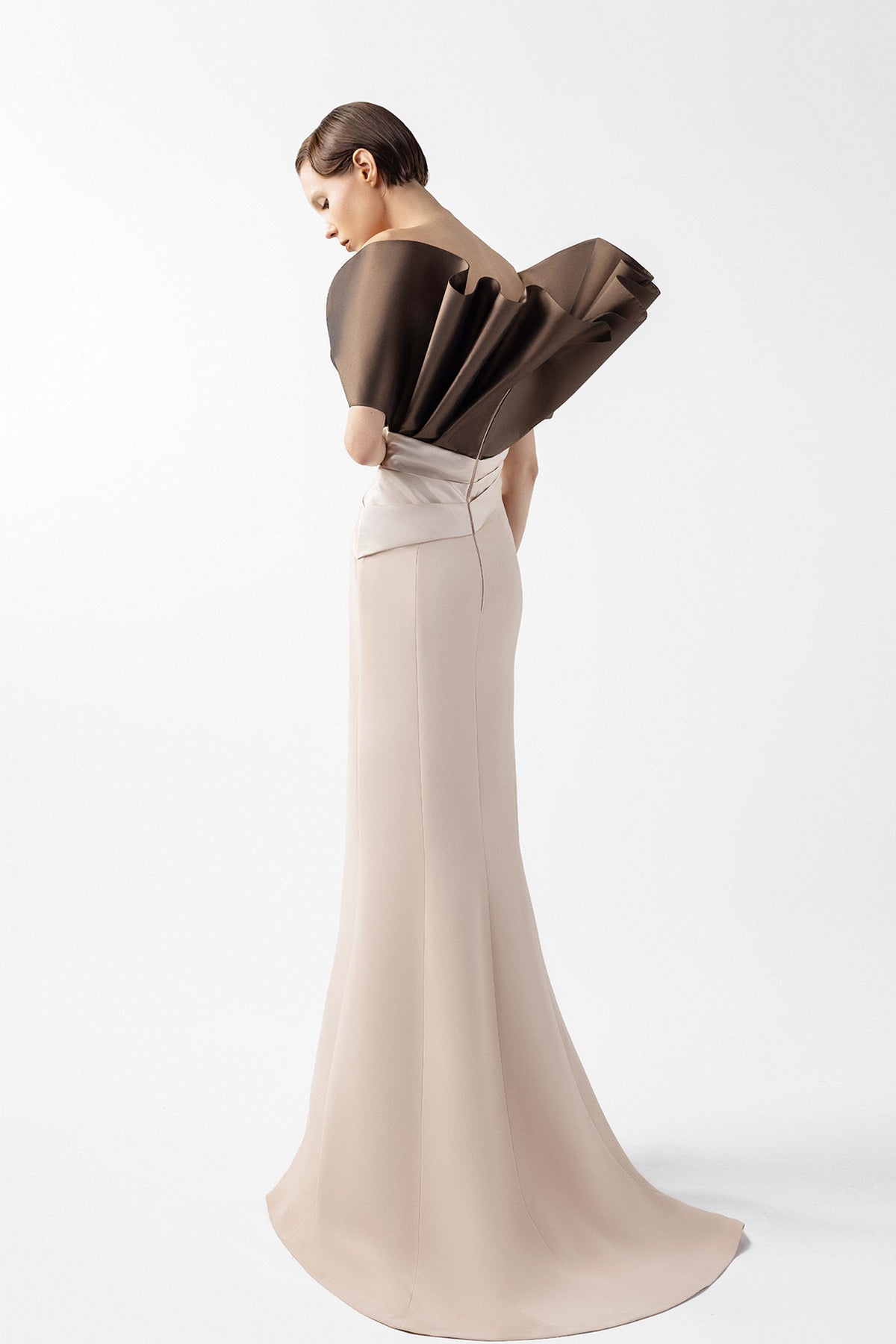 Nude and metallic brown refined structure and softness taffeta dress. Featuring a sculpted bodice with folded contours around the neckline that creates an abstract blooming effect. Complemented with a crepe wrap the body is in fluid lines with contrast of sharp volume and smooth draping dress.
