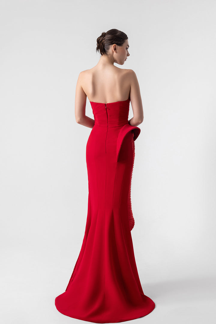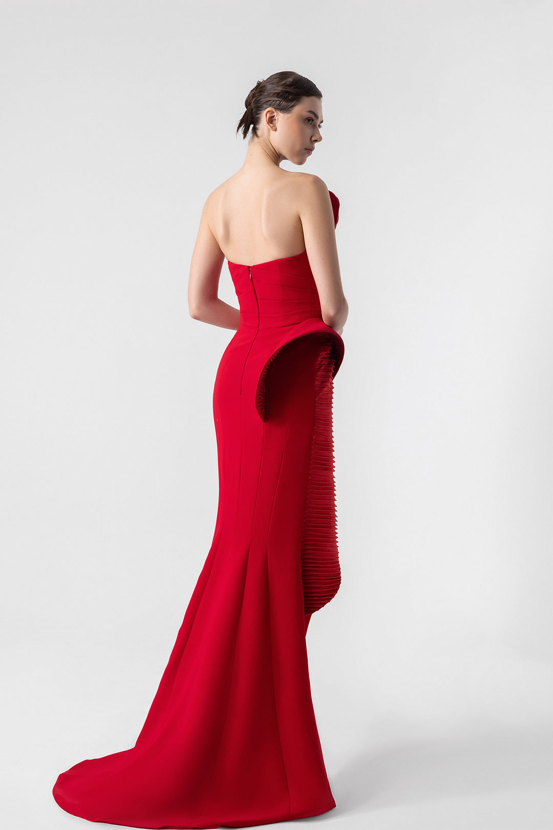 Red strapless lamé organza dress. Featuring sculptural, three-dimensional shapes along the bodice. Complemented by a layered crepe skirt with a high slit. The ribbed bust into cascading crepe drapery.