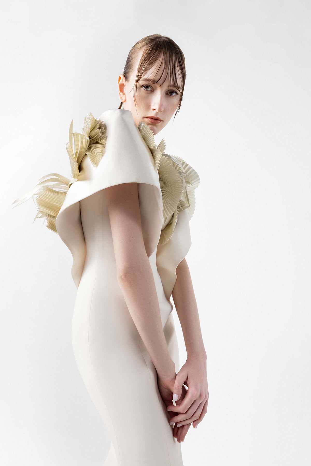 Creamy and gold crepe dress. Featuring sweeping architectural shoulders that flow into pleated lamé organza accents. Complemented by sculptural fans hand-formed to suggest delicate movement fluttering petals or radiant wings framing the neckline and shoulders with a modern yet ethereal energy. Complemented with a silhouette that flows seamlessly into a floor-sweeping mermaid cut.