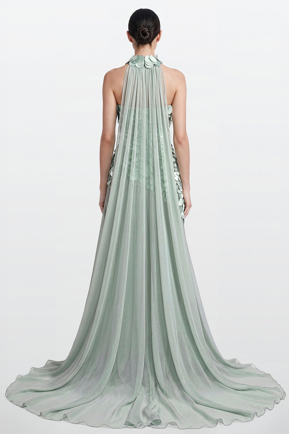 Strapless column gown crafted in crepe featuring sculptural circular scale embellishments across the bodice that create a striking dimensional texture. The silhouette transitions into a fluid pleated chiffon skirt with a front slit, while a halter neckline extends into a long flowing cape at the back for an elegant, elongated finish.