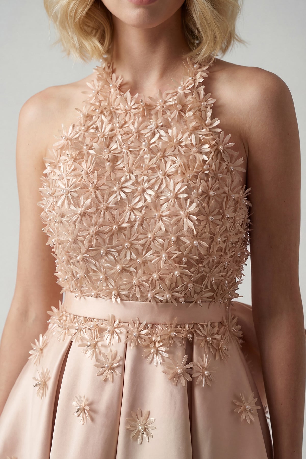 Light blush mikado midi dress featuring a structured halter bodice adorned with laser-cut floral appliqués, hand-embroidered with crystals and pearls. The design is finished with a voluminous pleated mikado skirt and a statement bow at the back, with a subtle back slit for ease of movement.