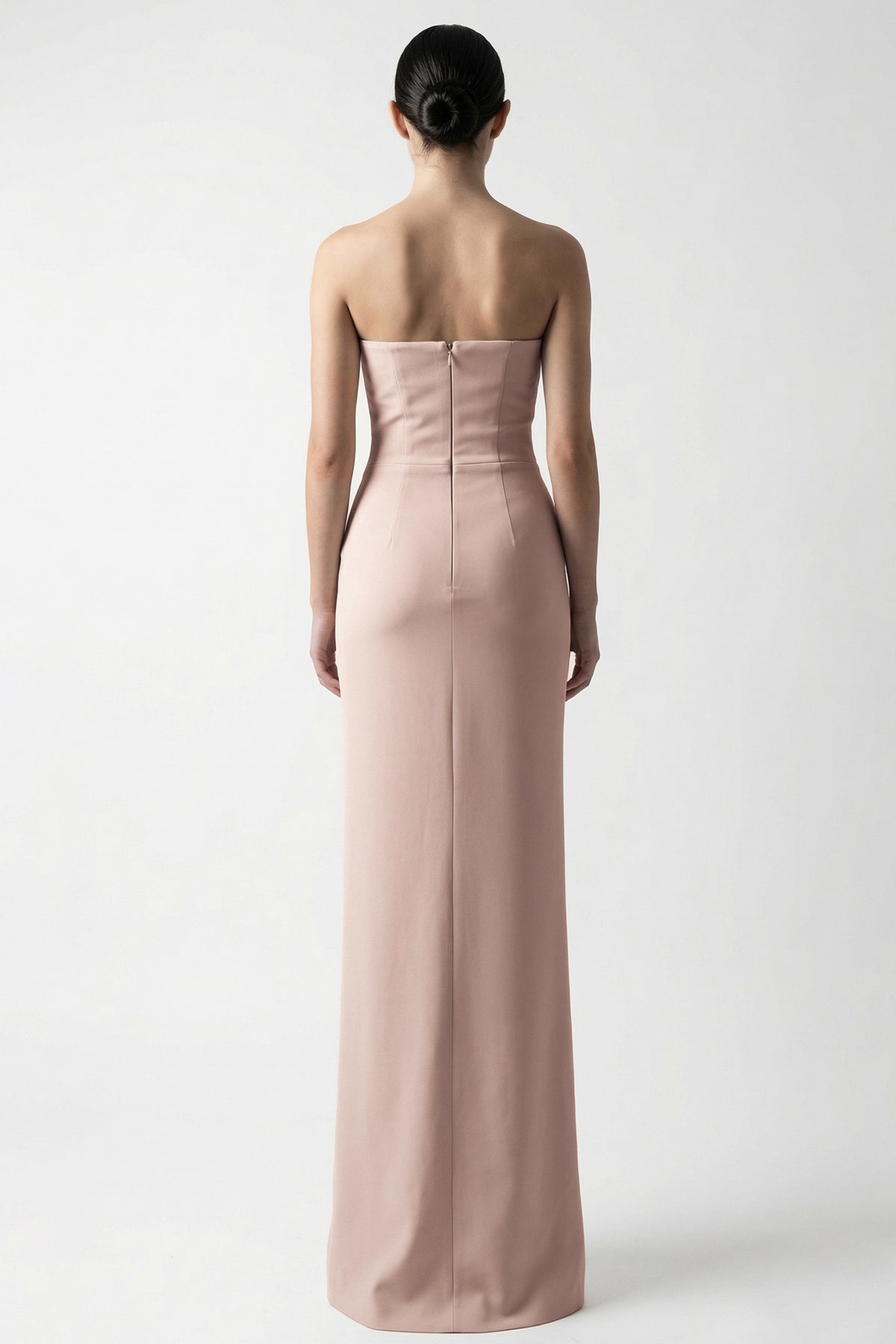 Strapless crepe gown with a softly draped waist and a sleek floor-length silhouette. The look is styled with a detachable capelet adorned with layered floral appliqués embellished with Swarovski crystals and leather petals. An oversized bow at the neckline completes the statement shoulder detail.