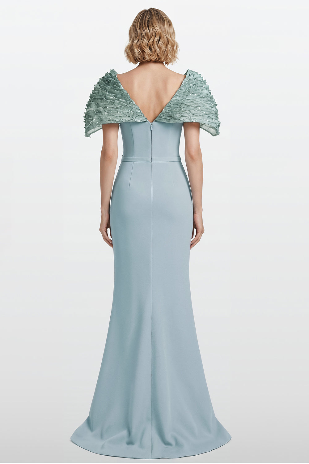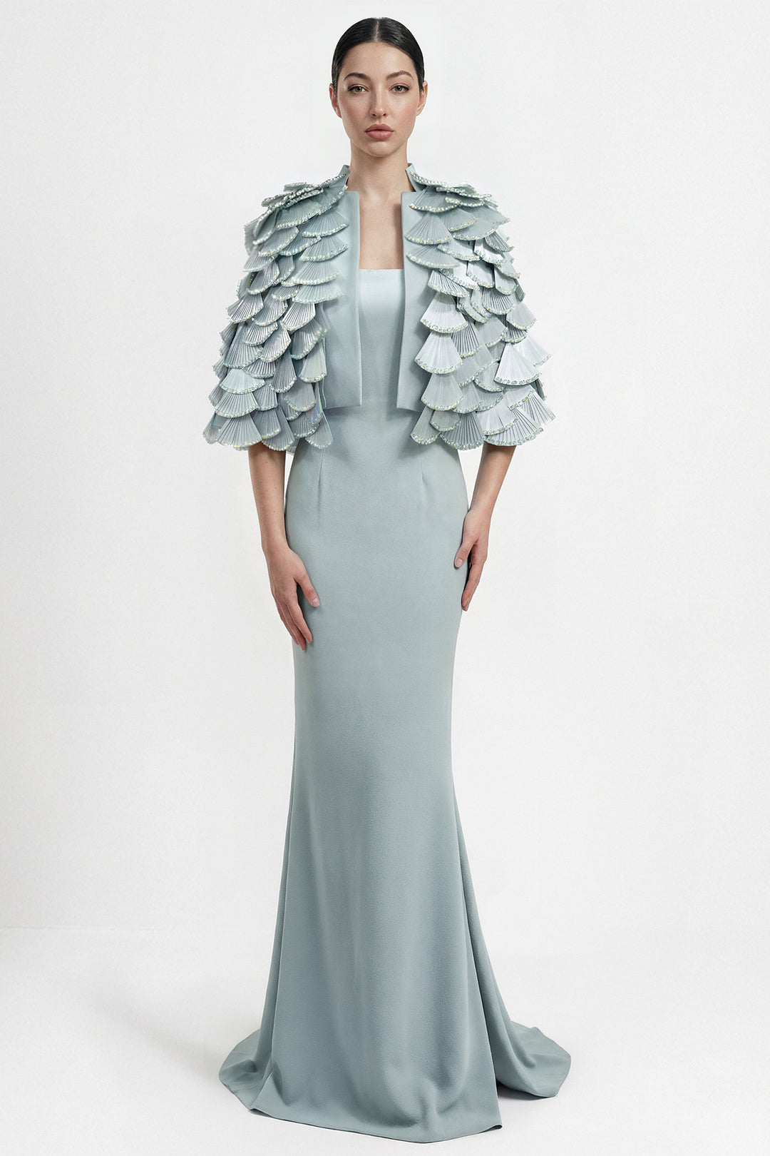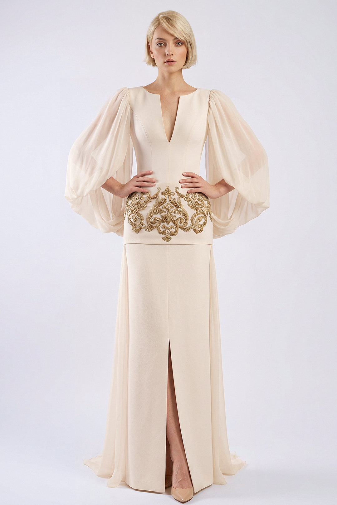 Embroidered Peplum Crepe Gown with Cape Sleeves