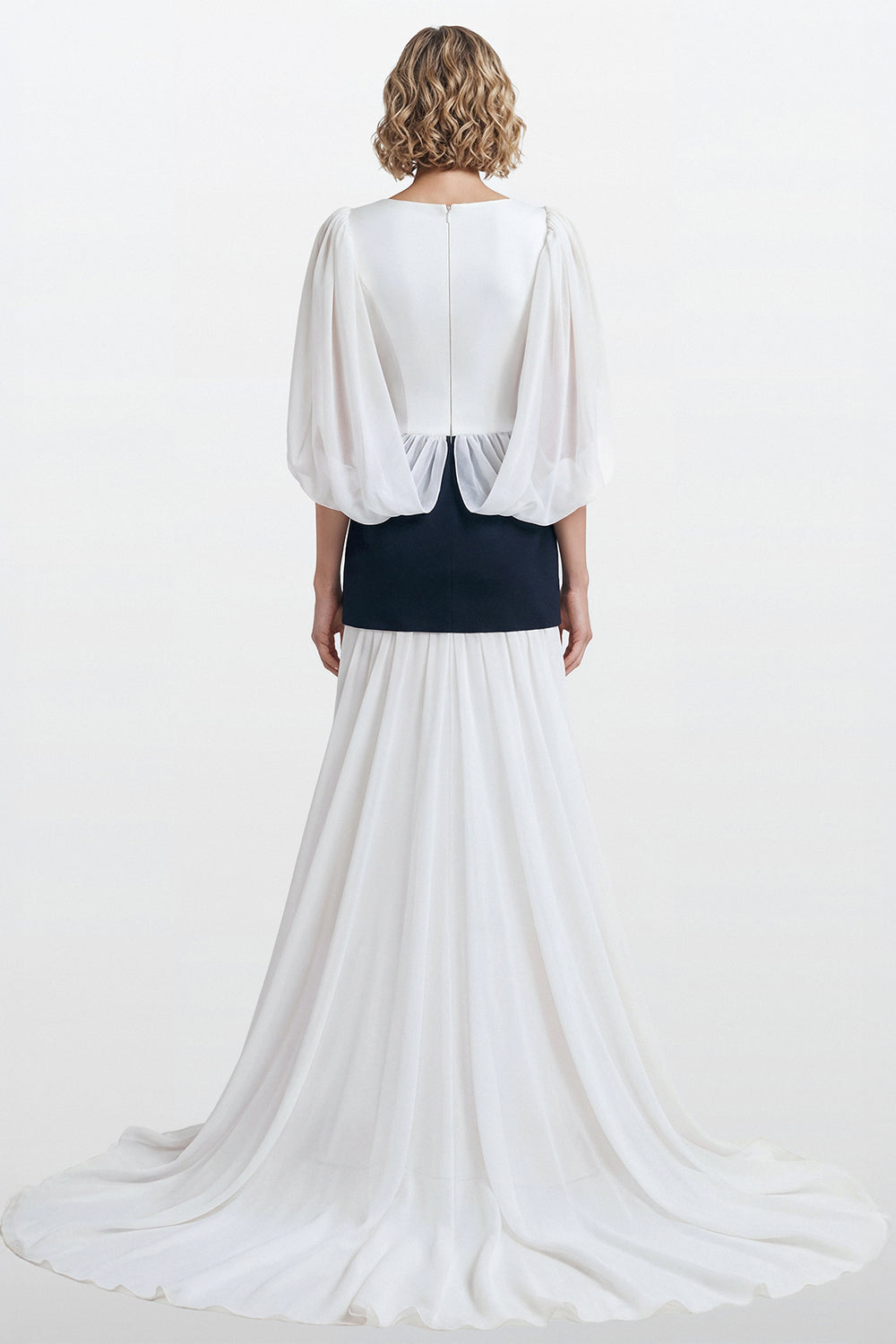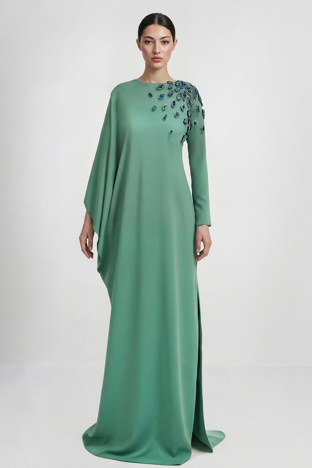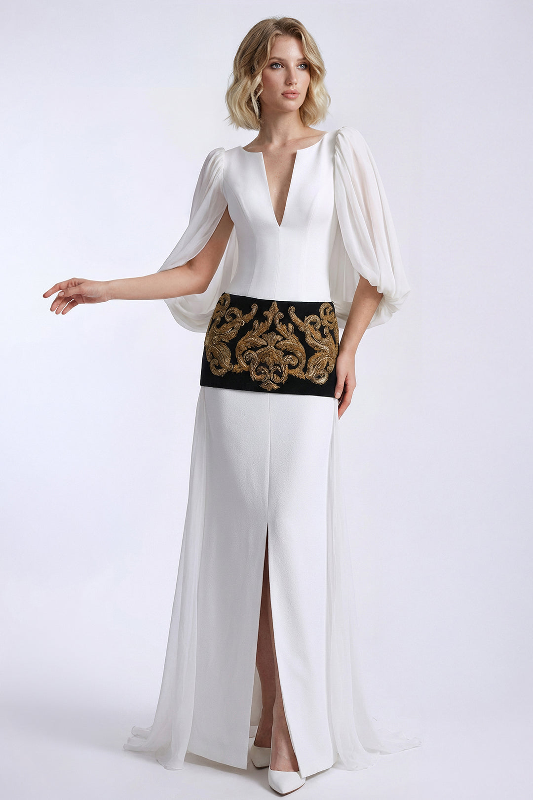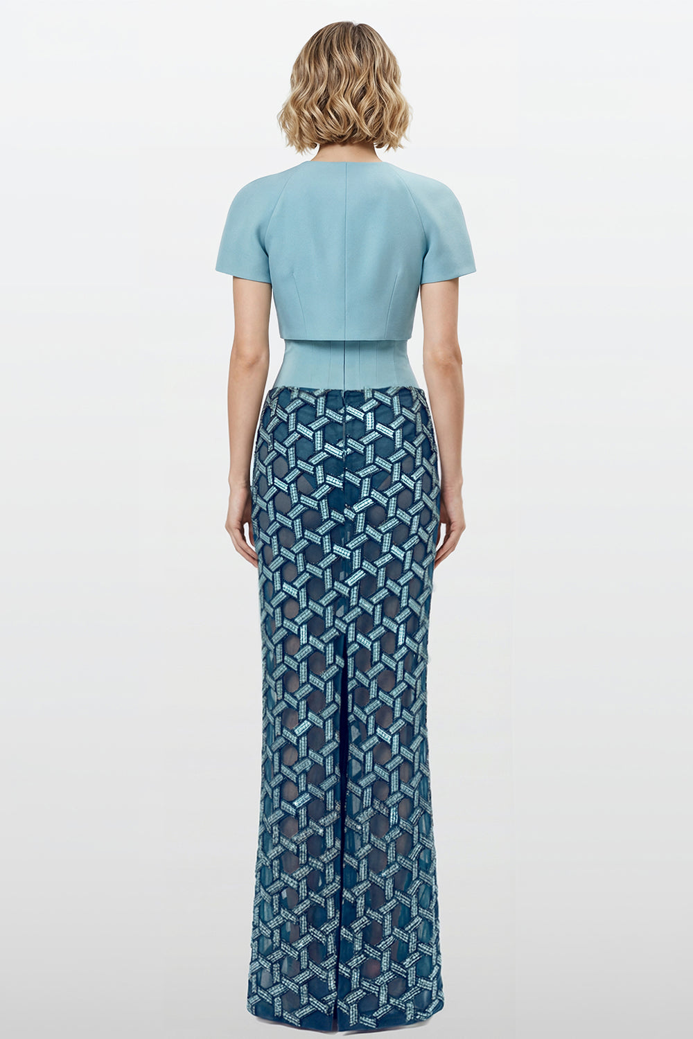 Embroidered Peplum Crepe Gown with Cape Sleeves