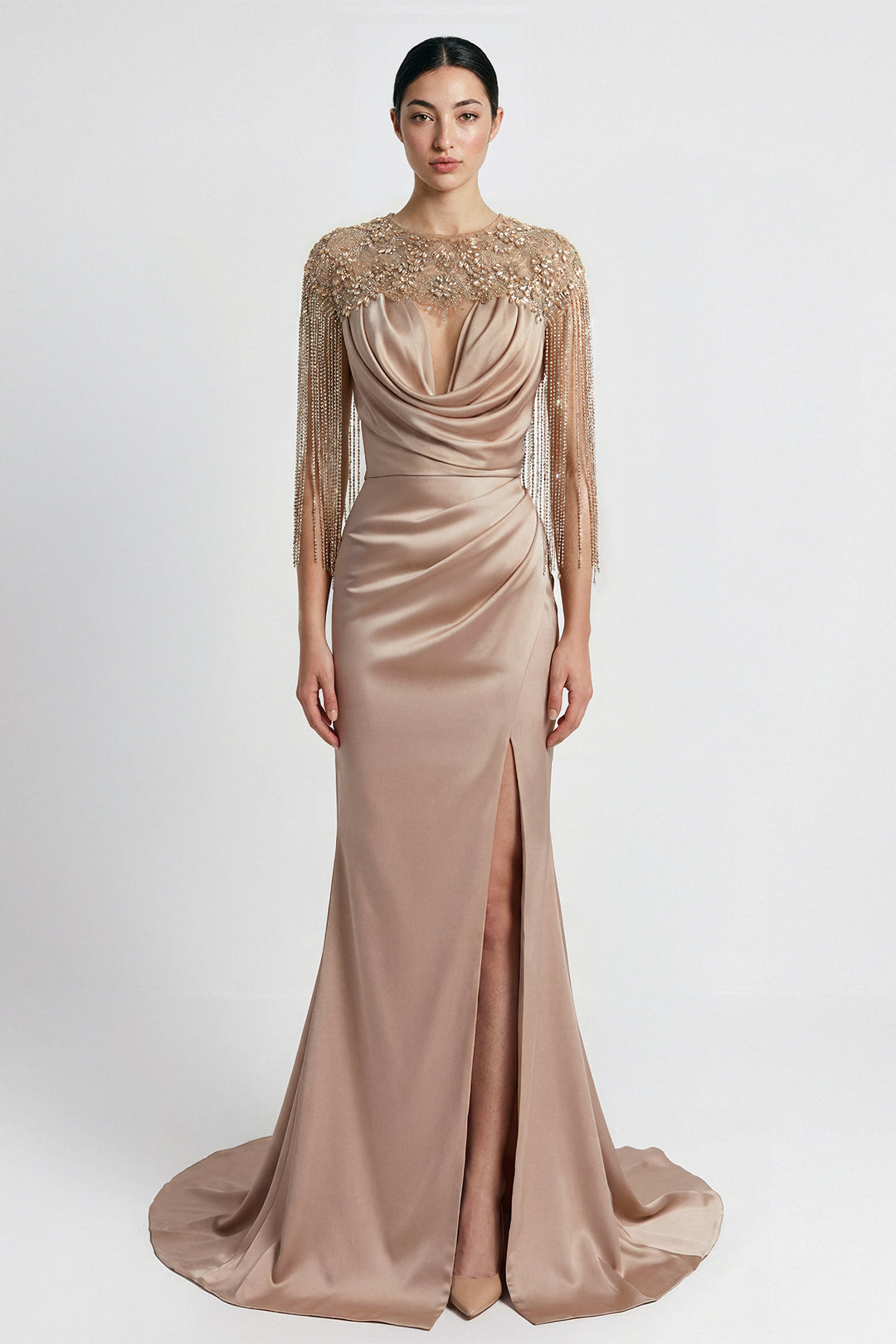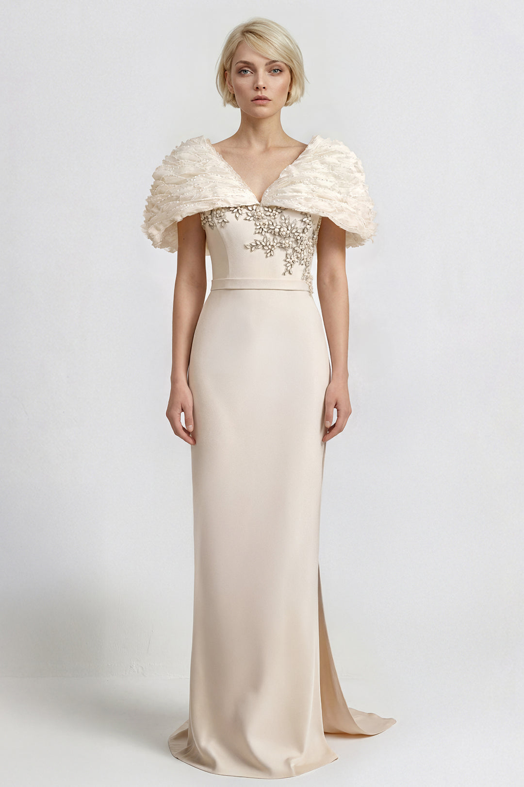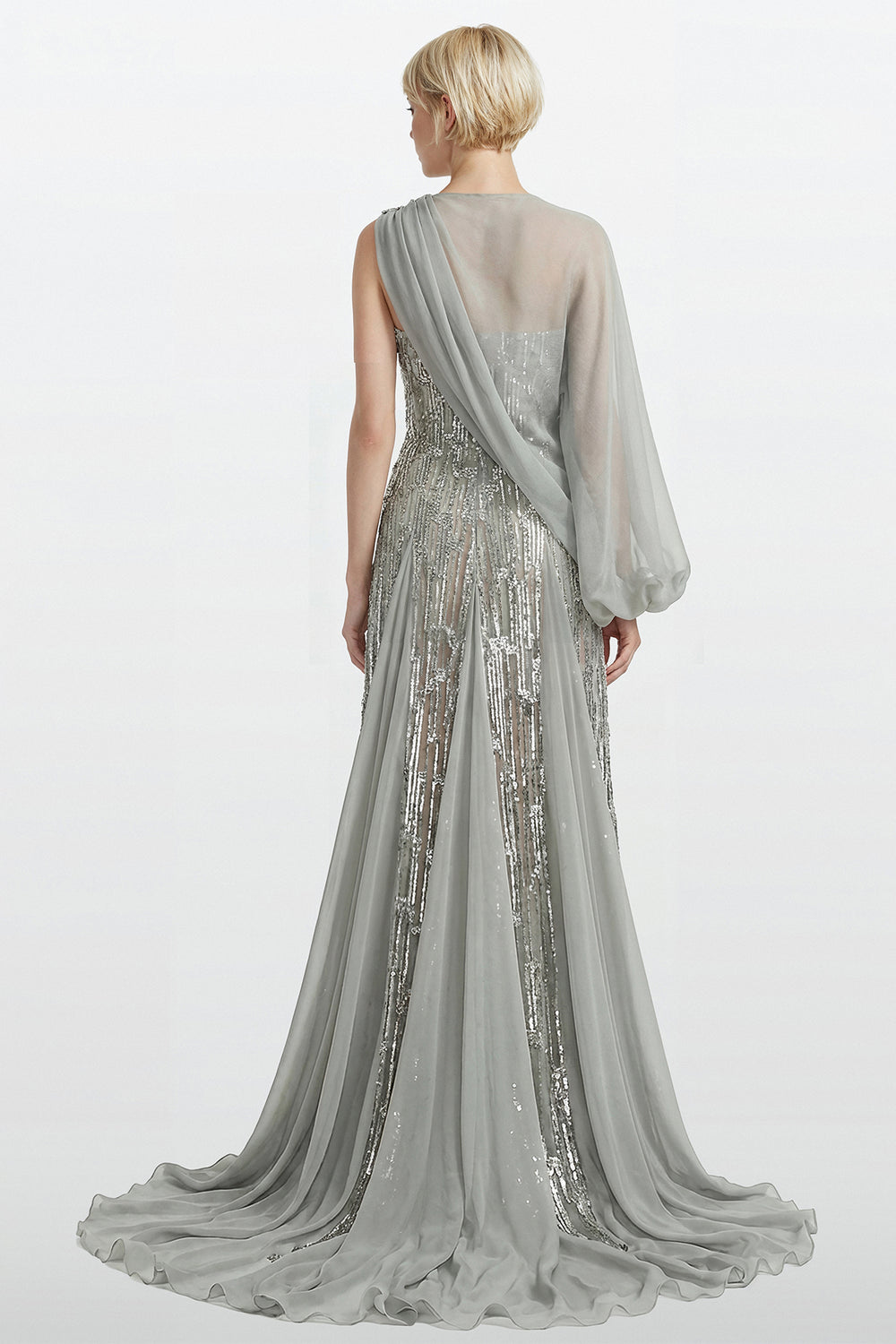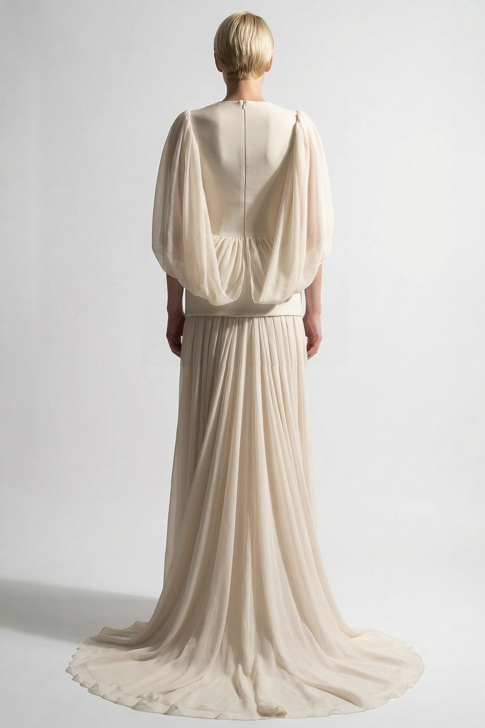 Draped Crepe Gown with Embroidered Shoulder Sleeves