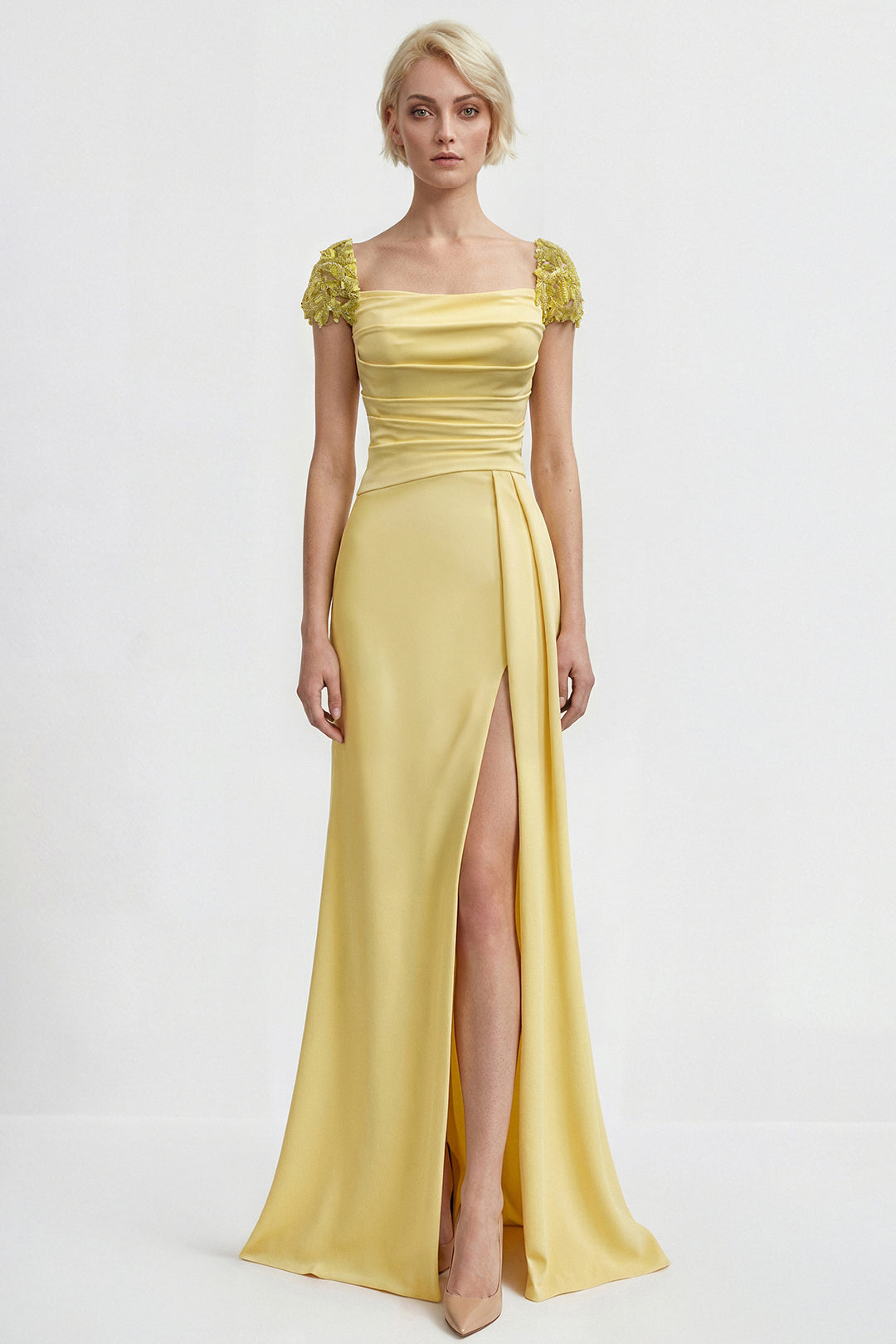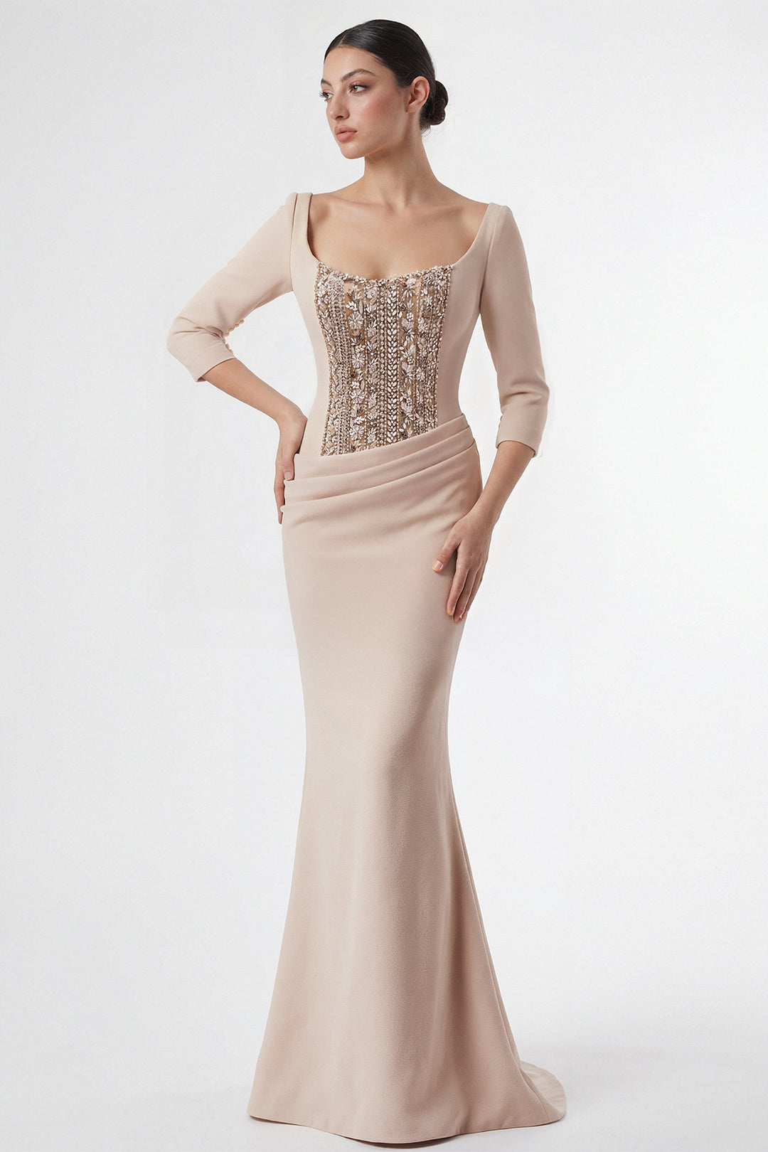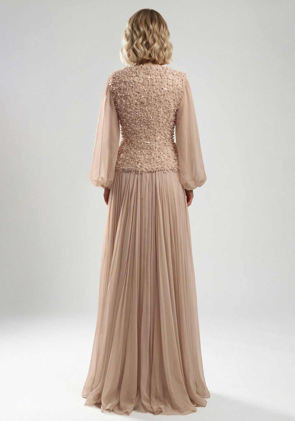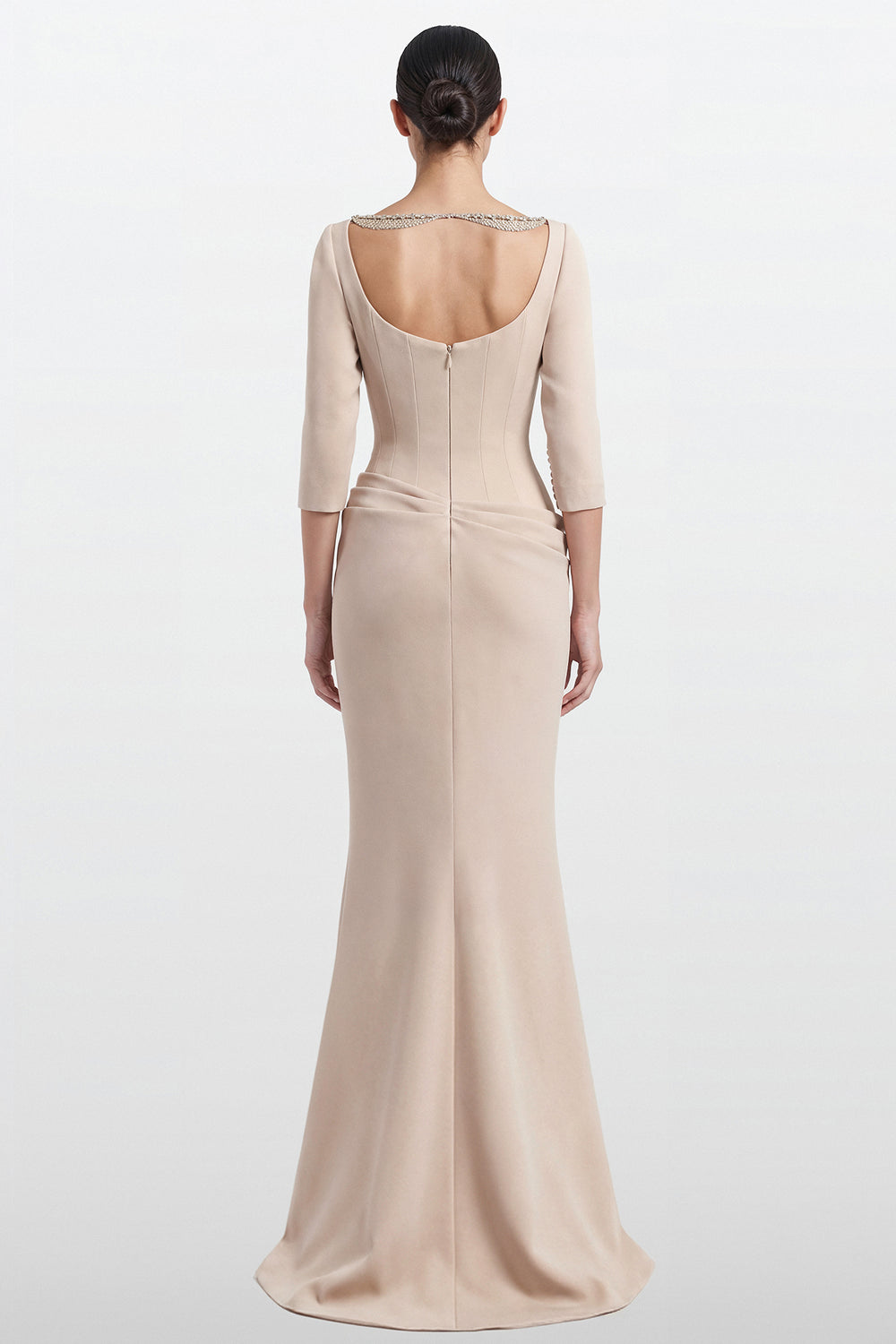 Draped Crepe Gown with Embroidered Shoulder Sleeves