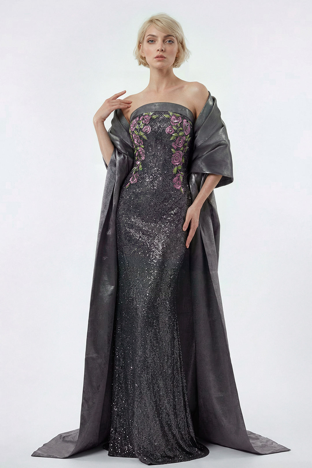 Anthracite Lamé Swarovski Gown with Removable Bow Cape