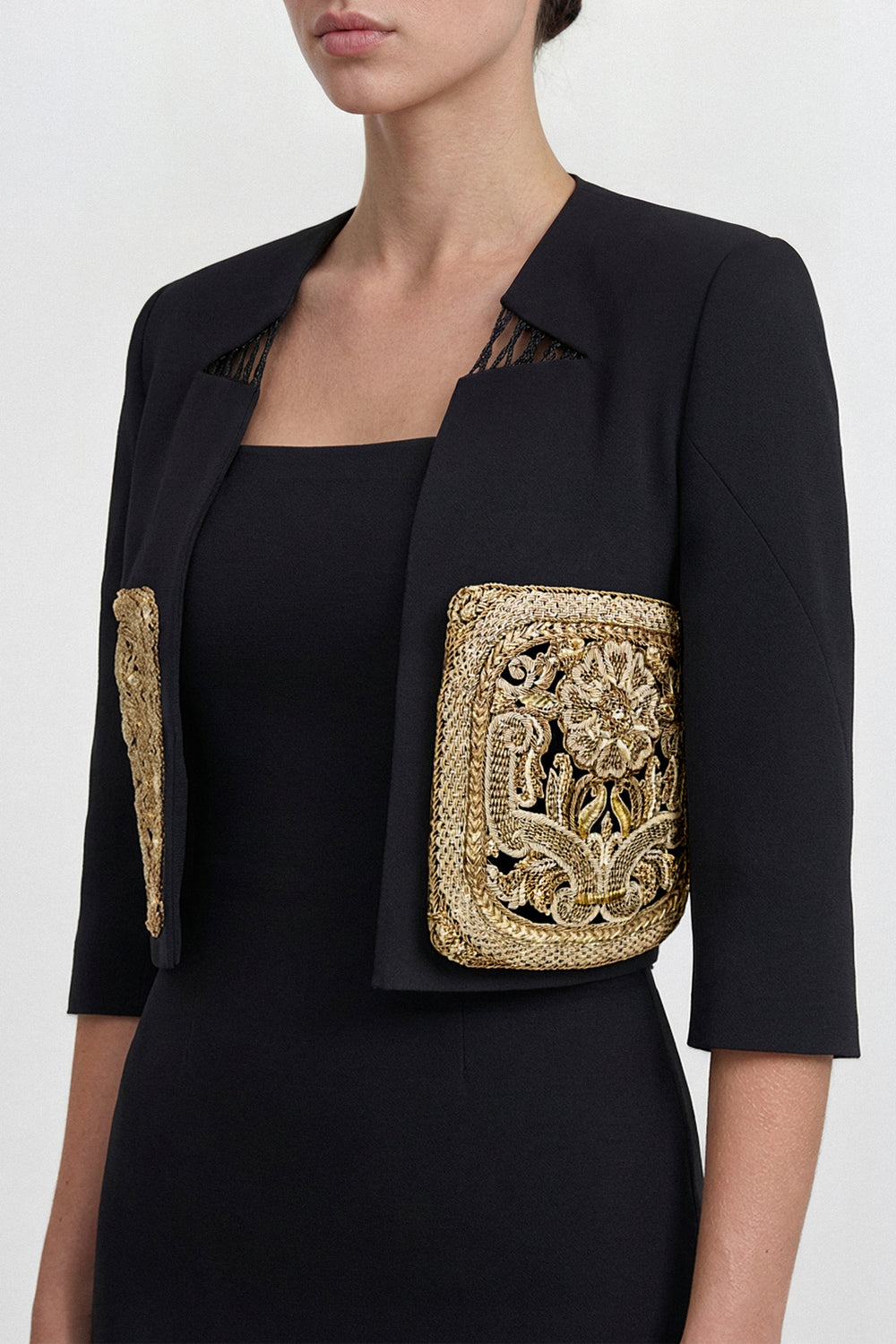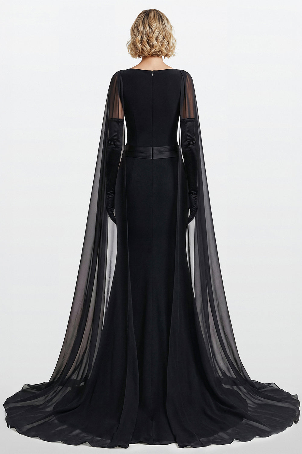 Crepe Dress with Metallic Collar and Chiffon Cape