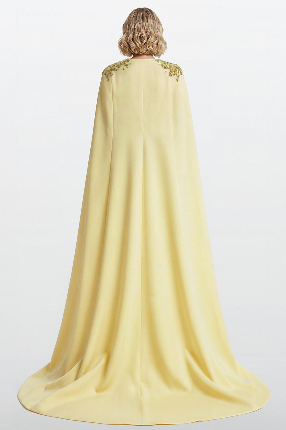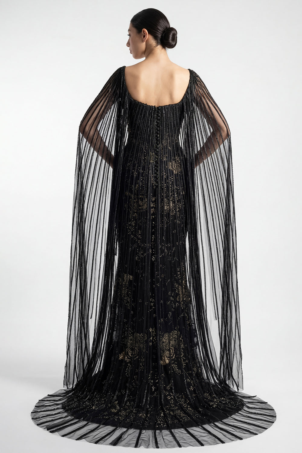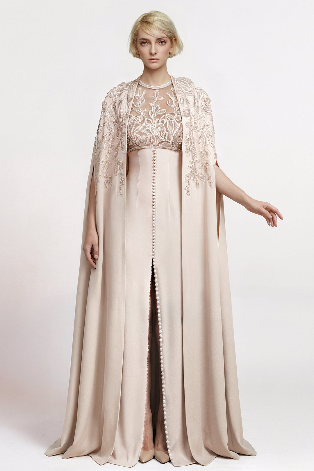 Embroidered Illusion Crepe Gown with Embroidered Cape