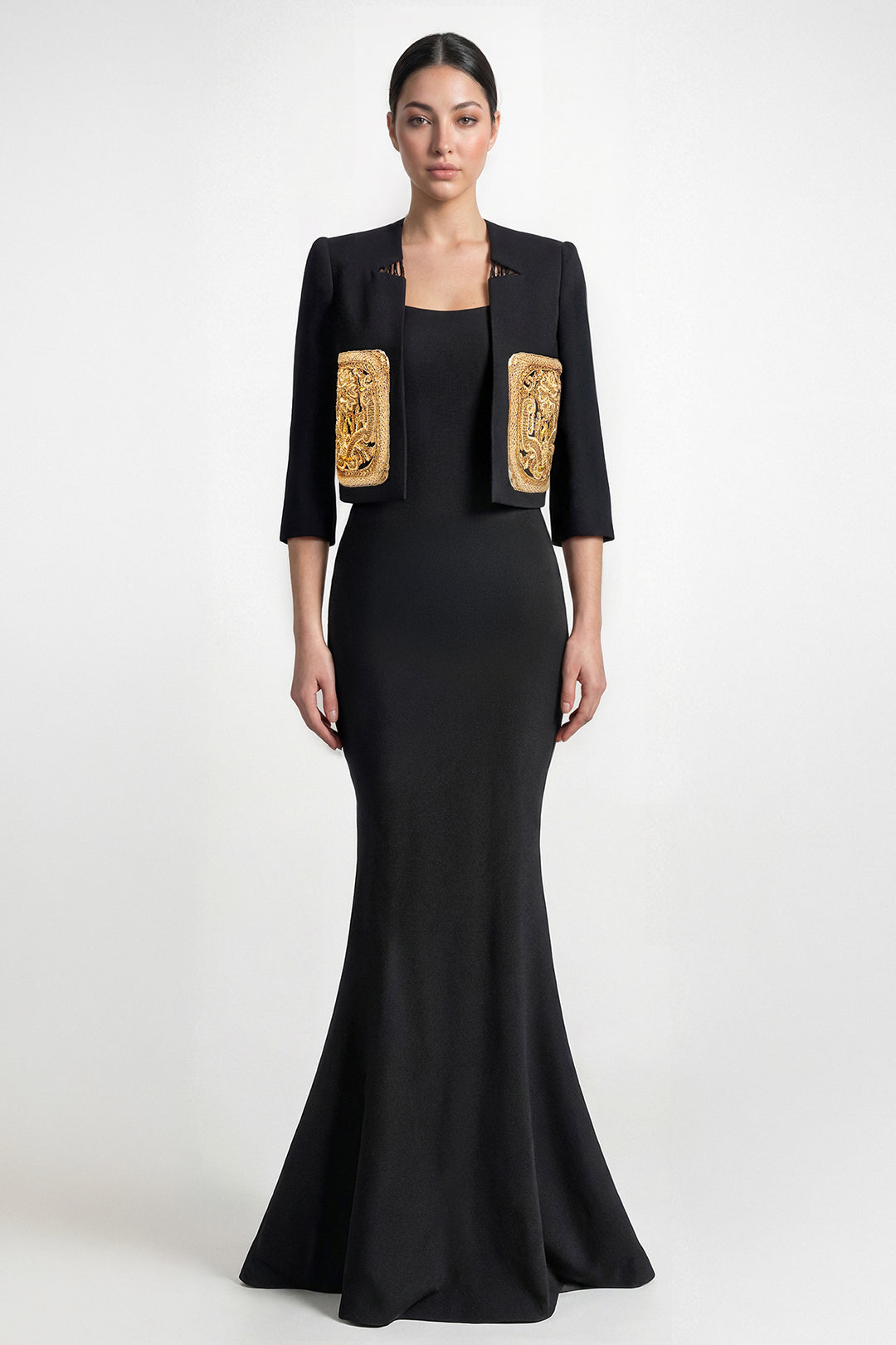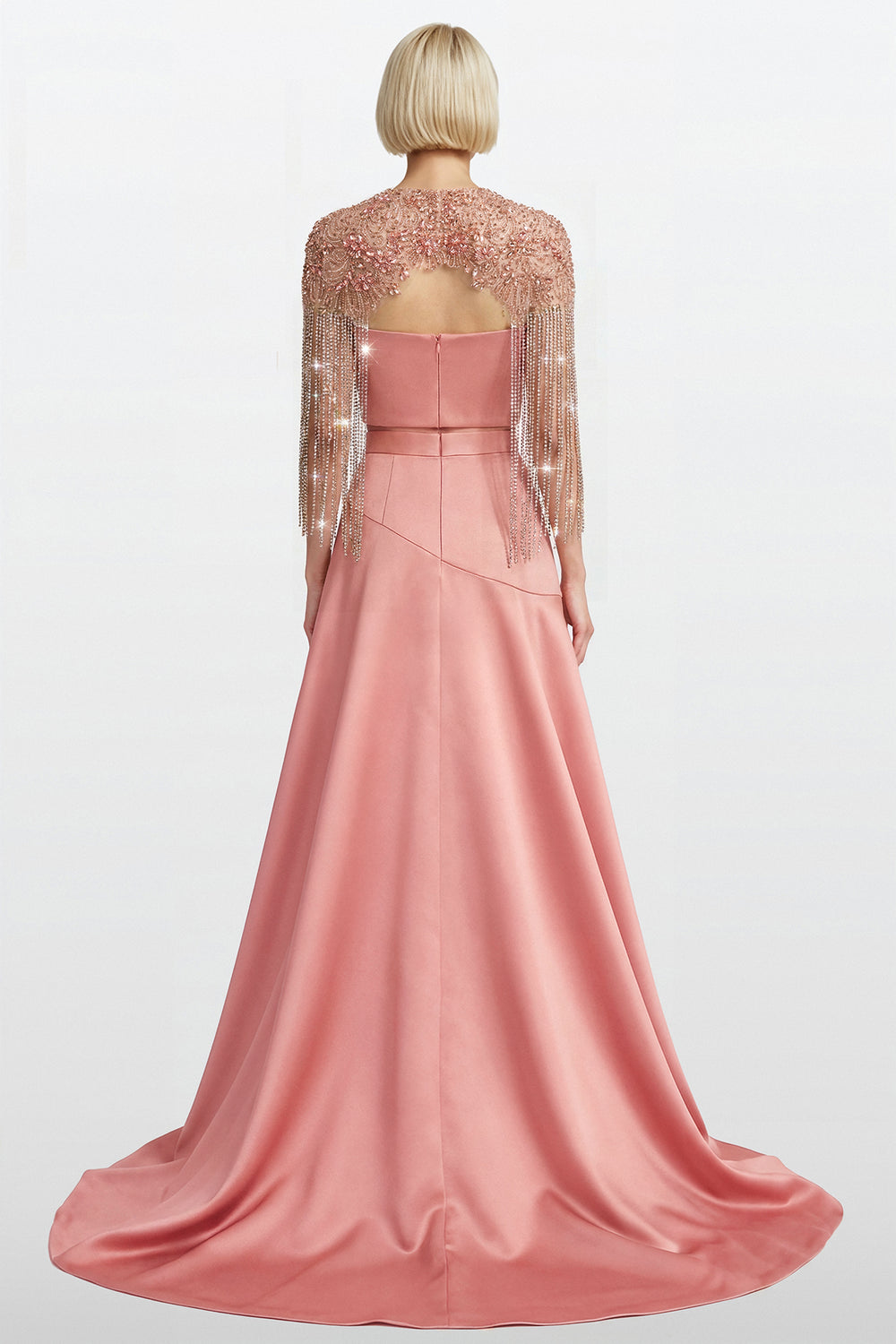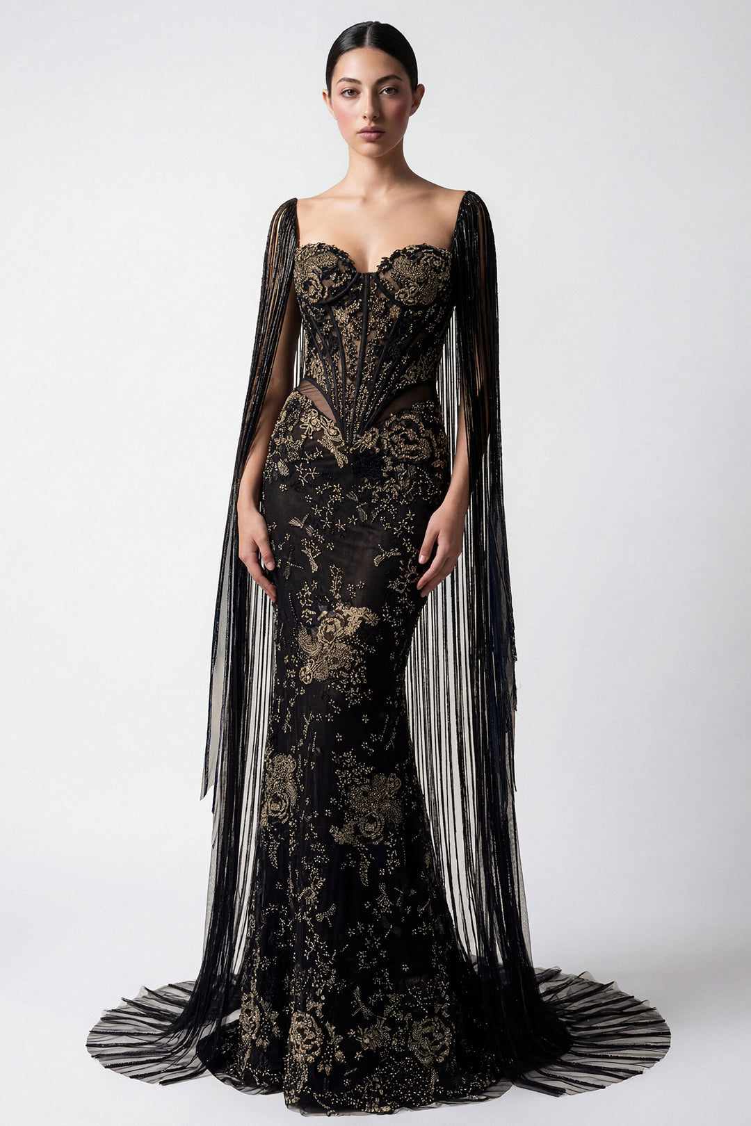 Embroidered Illusion Crepe Gown with Embroidered Cape
