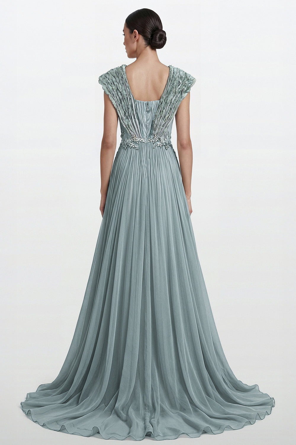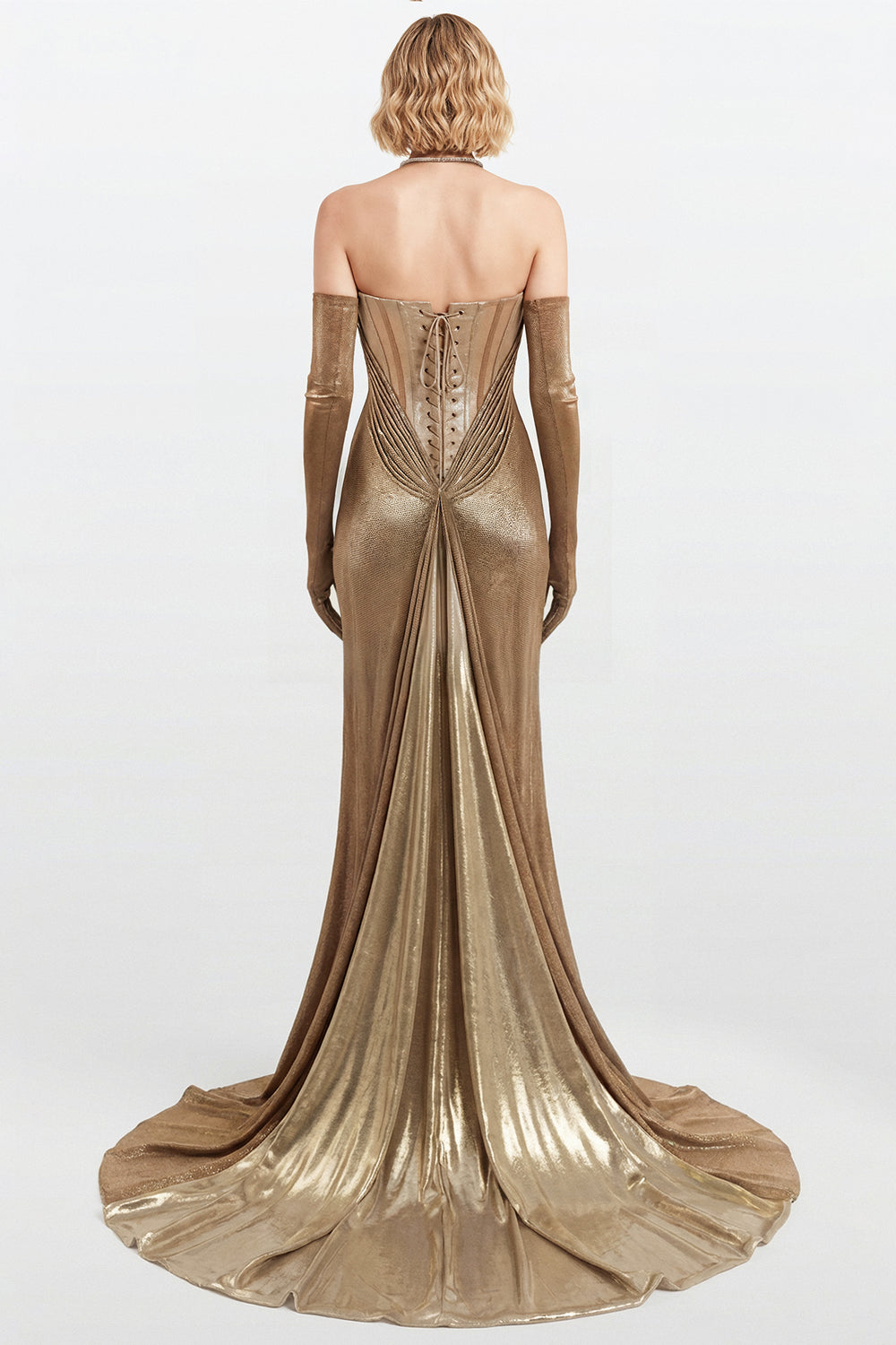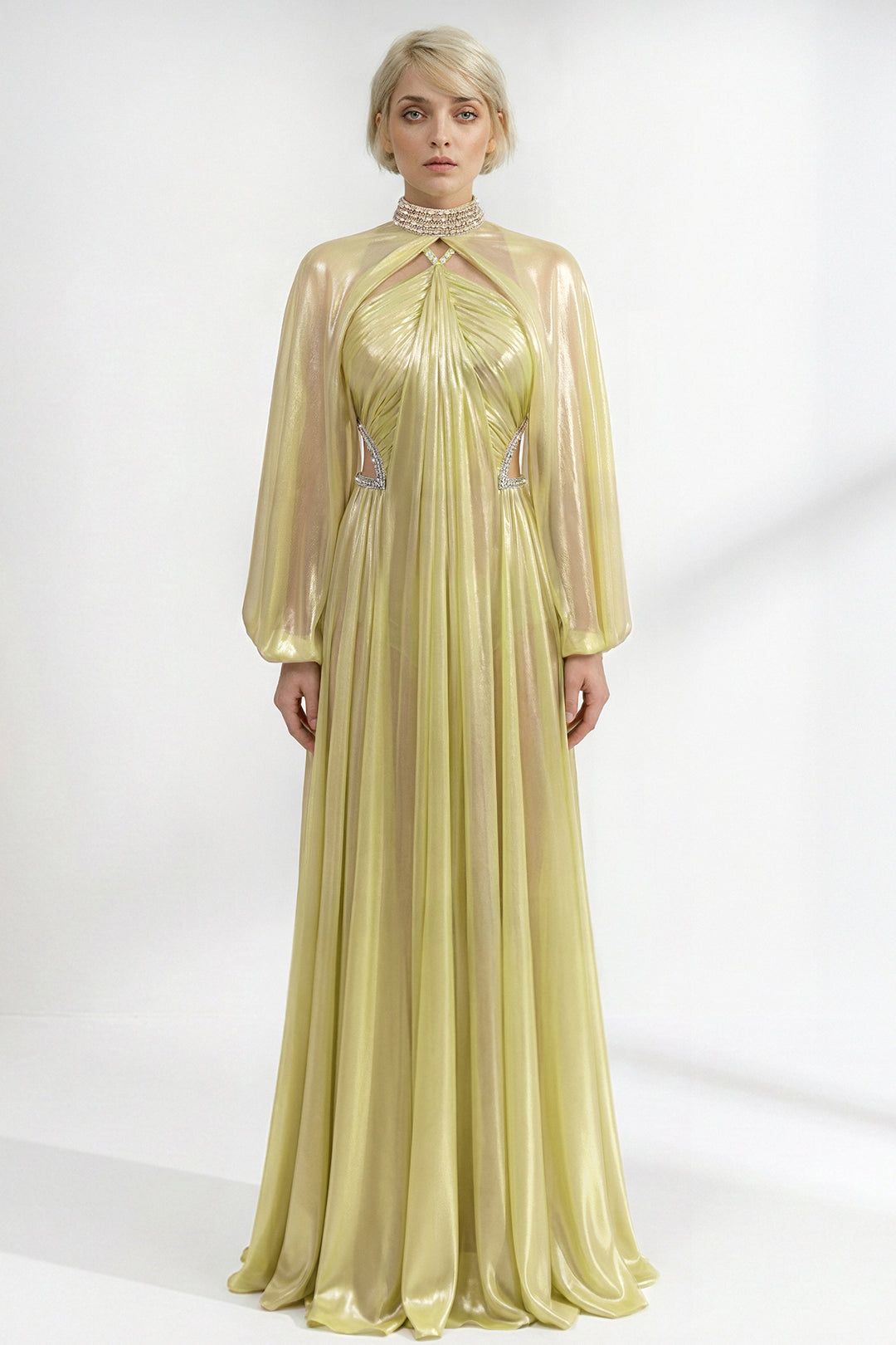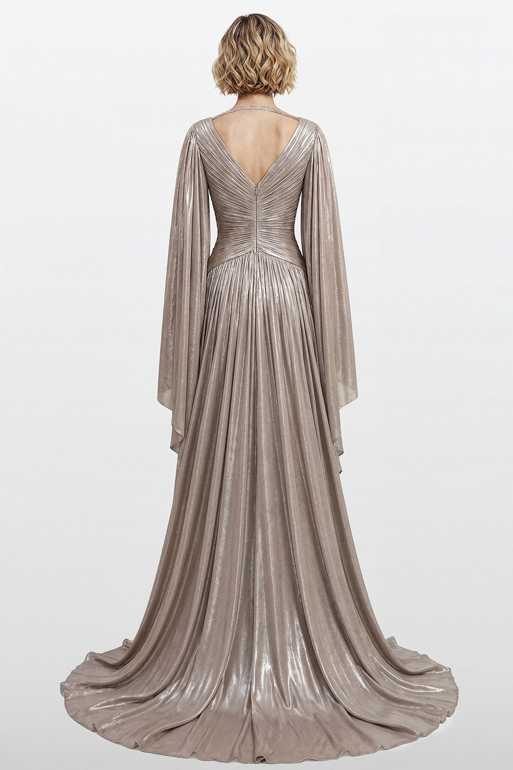 Metallic Pleated Lamé Gown with Draped Sleeves