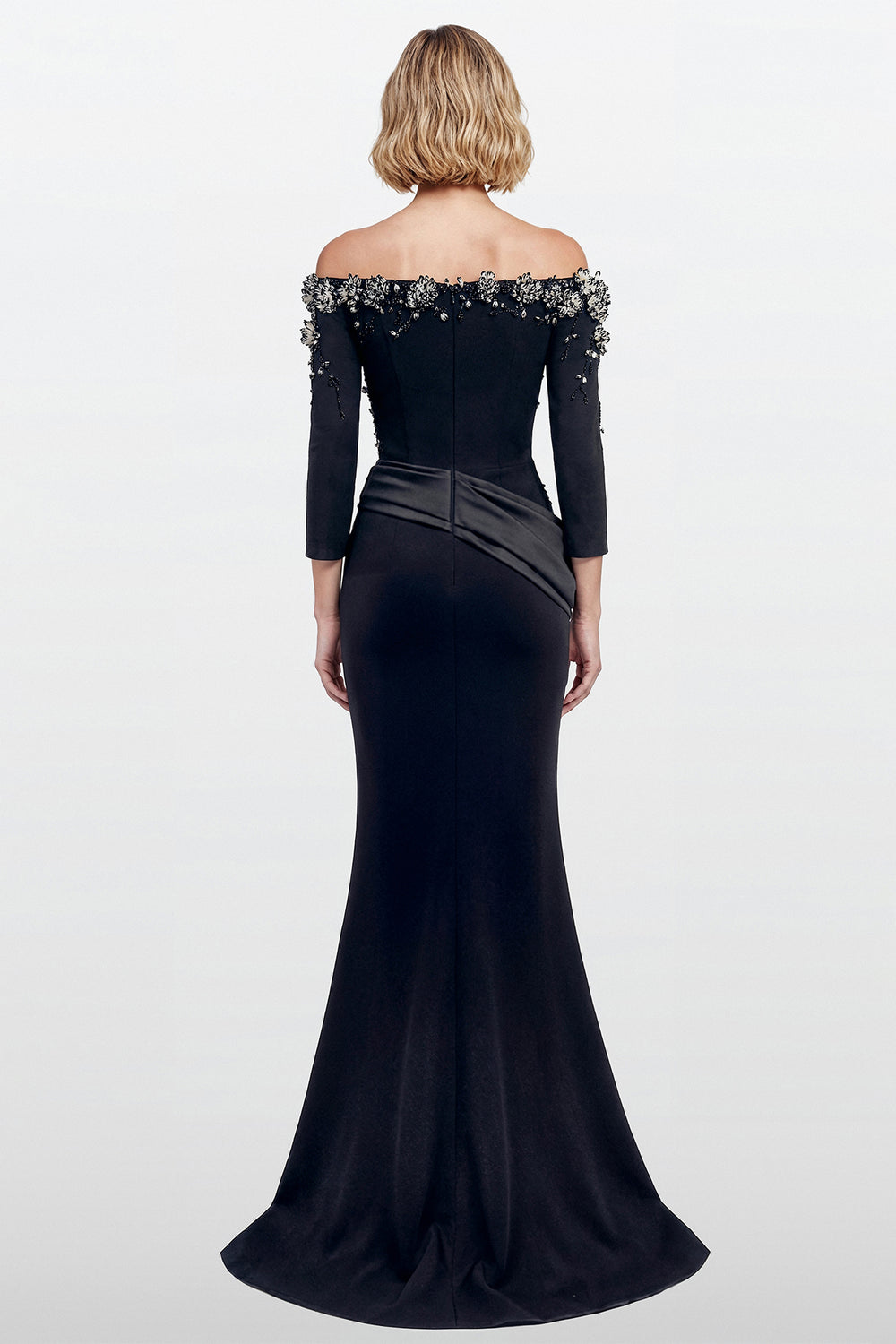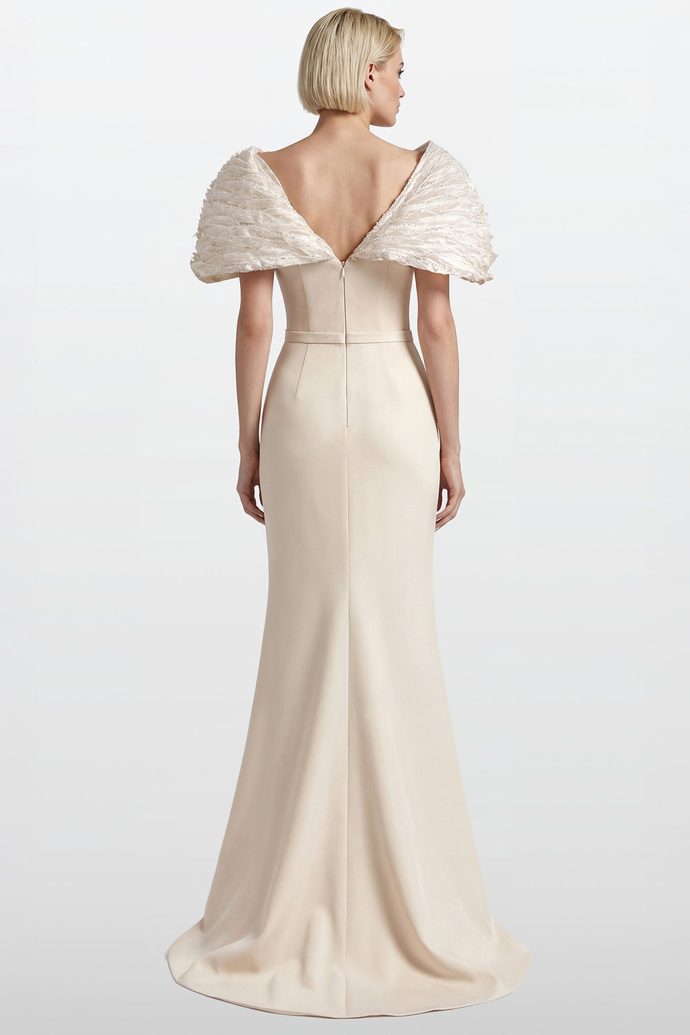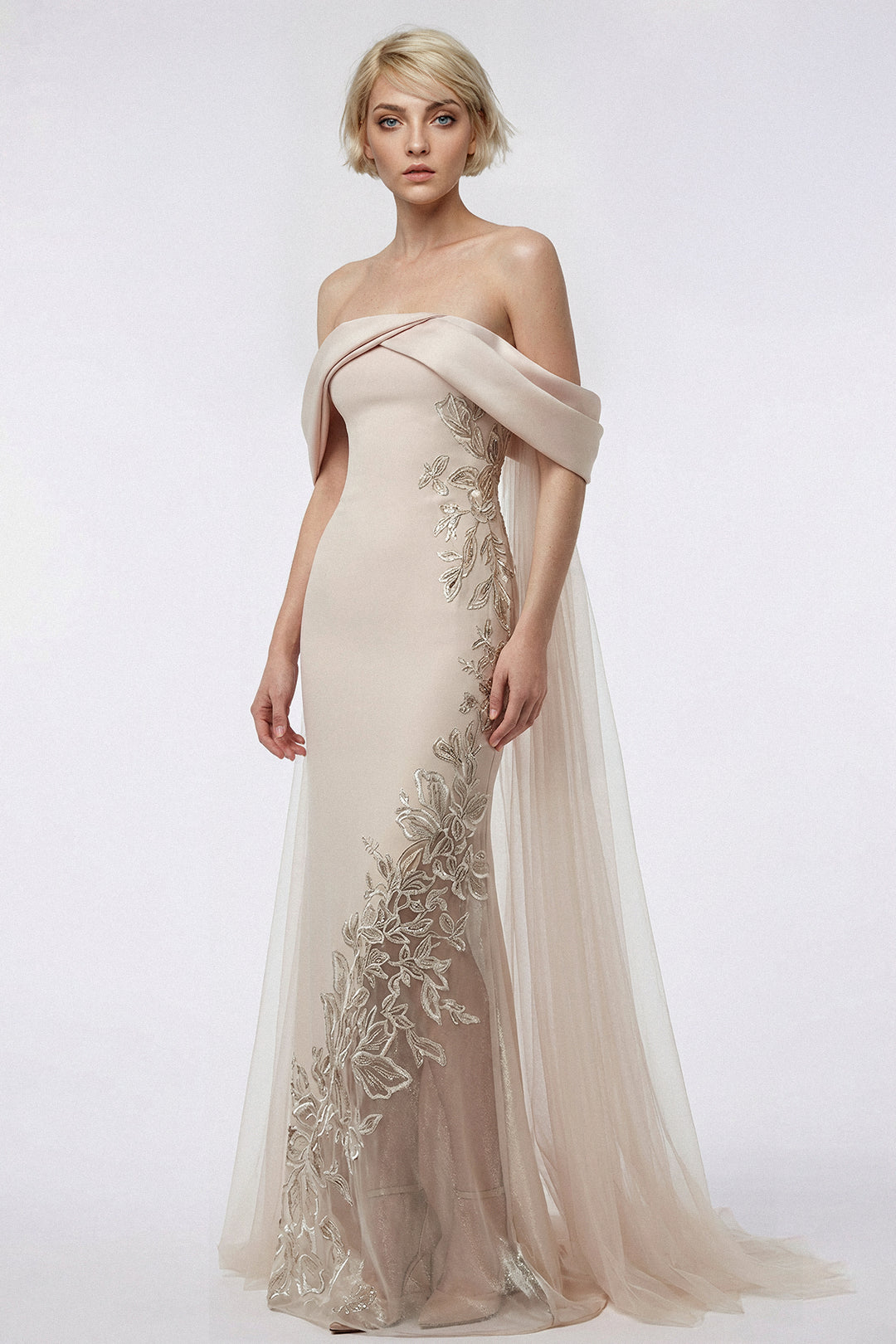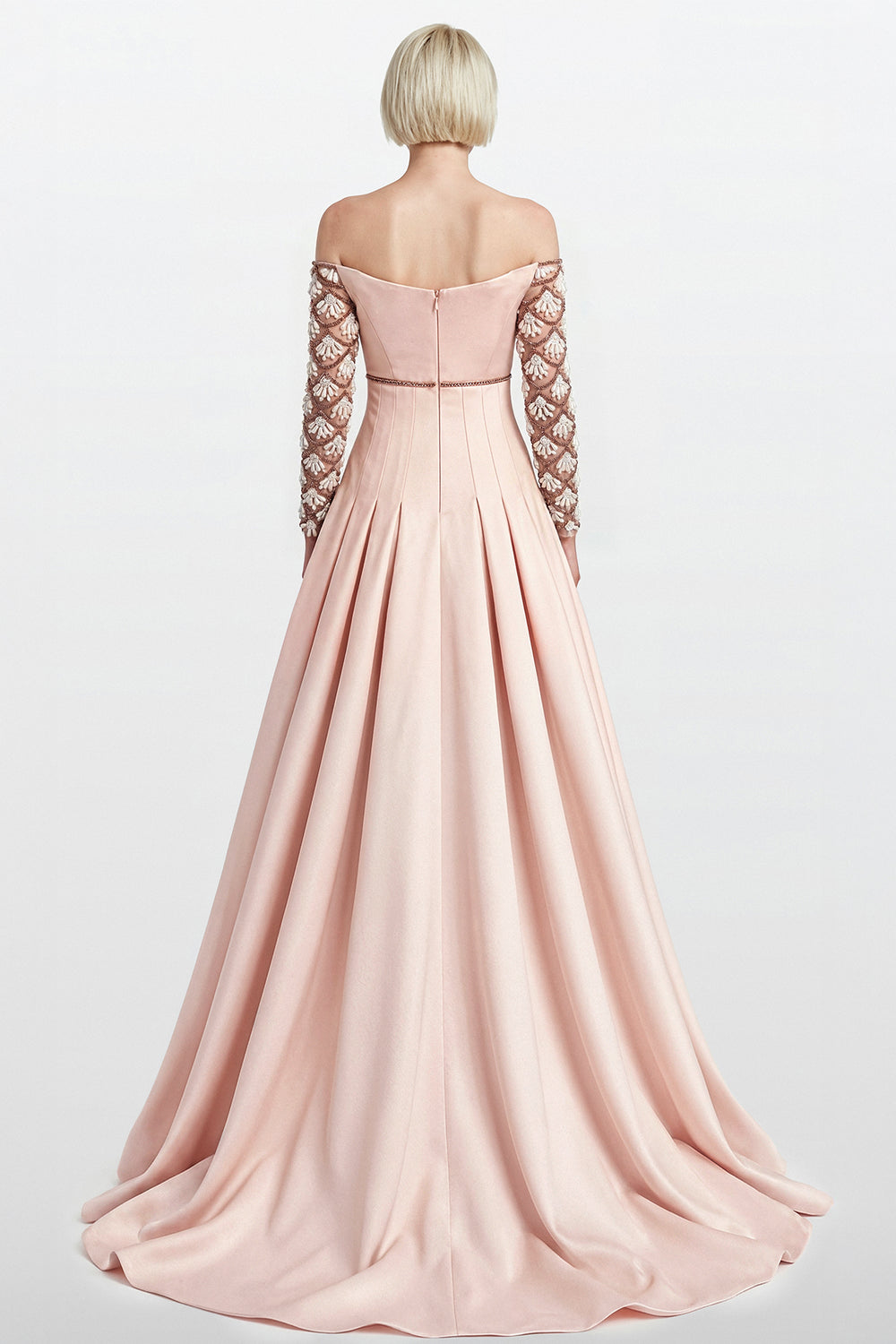 Off-Shoulder Crepe Gown with Embroidered Sleeves