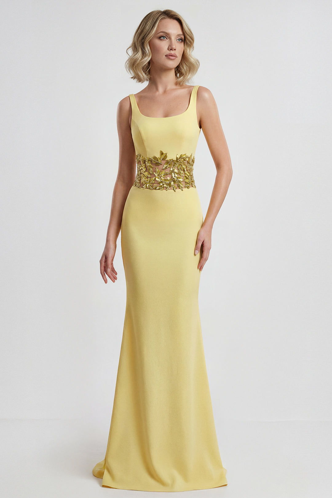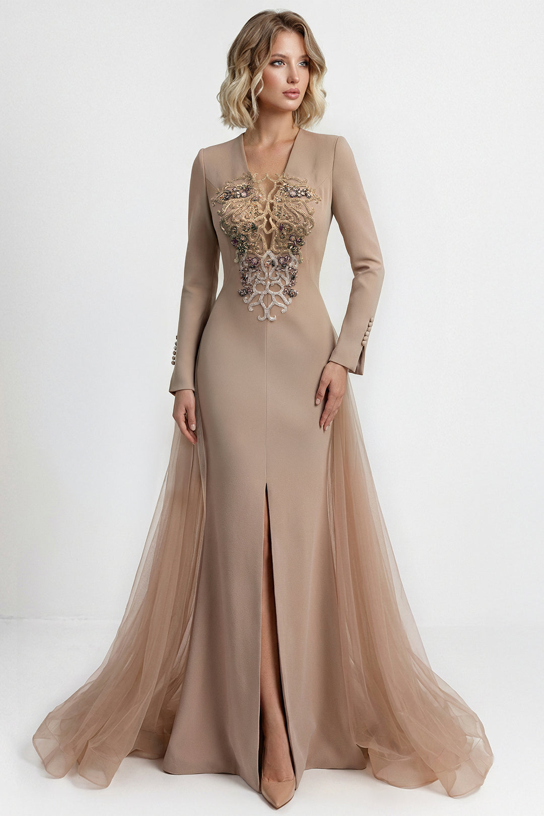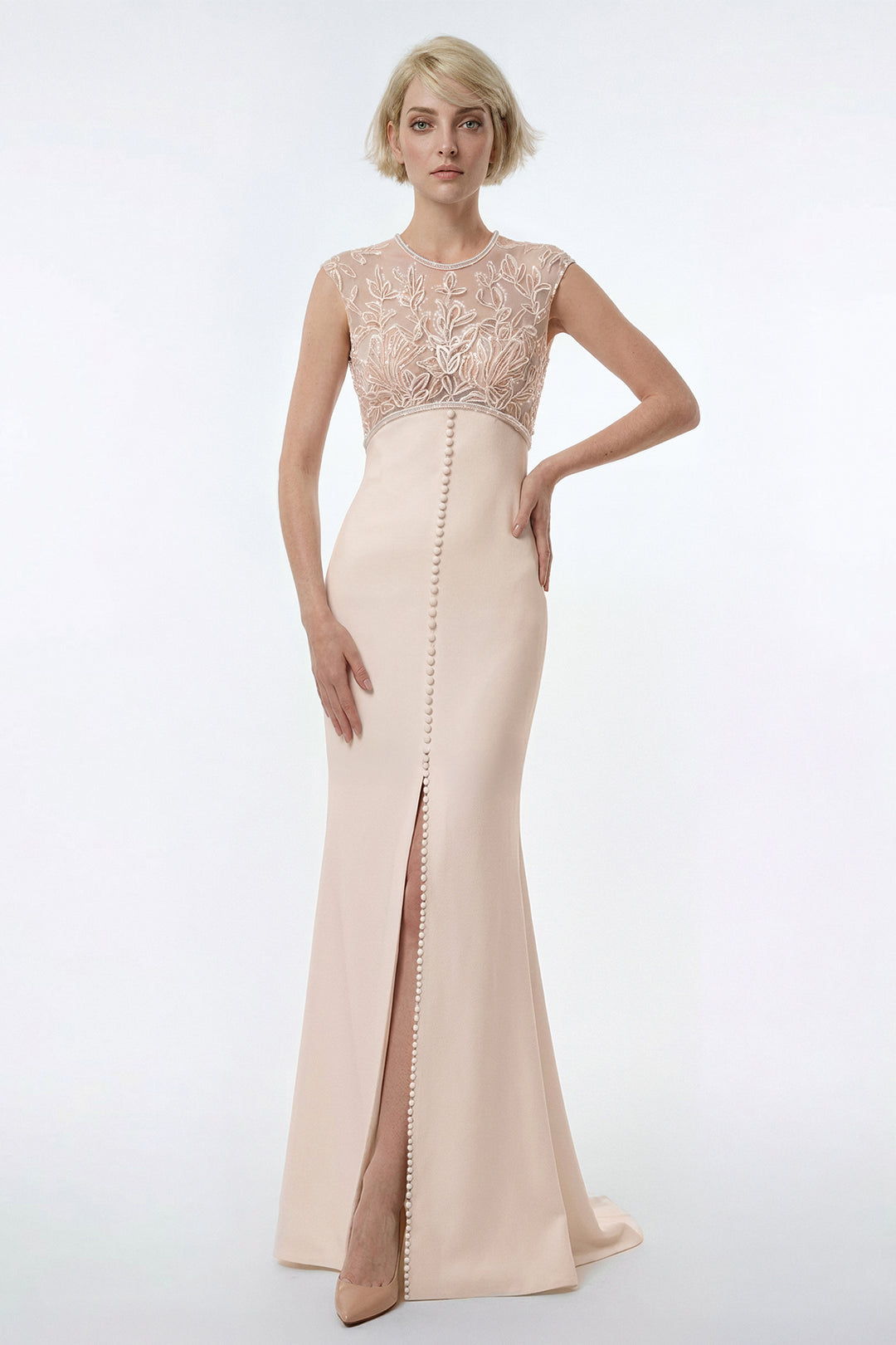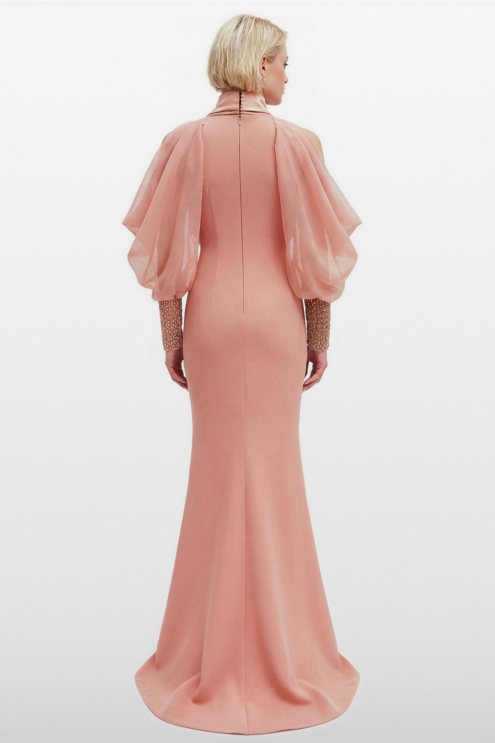 Off-Shoulder Crepe Gown with Embroidered Sleeves