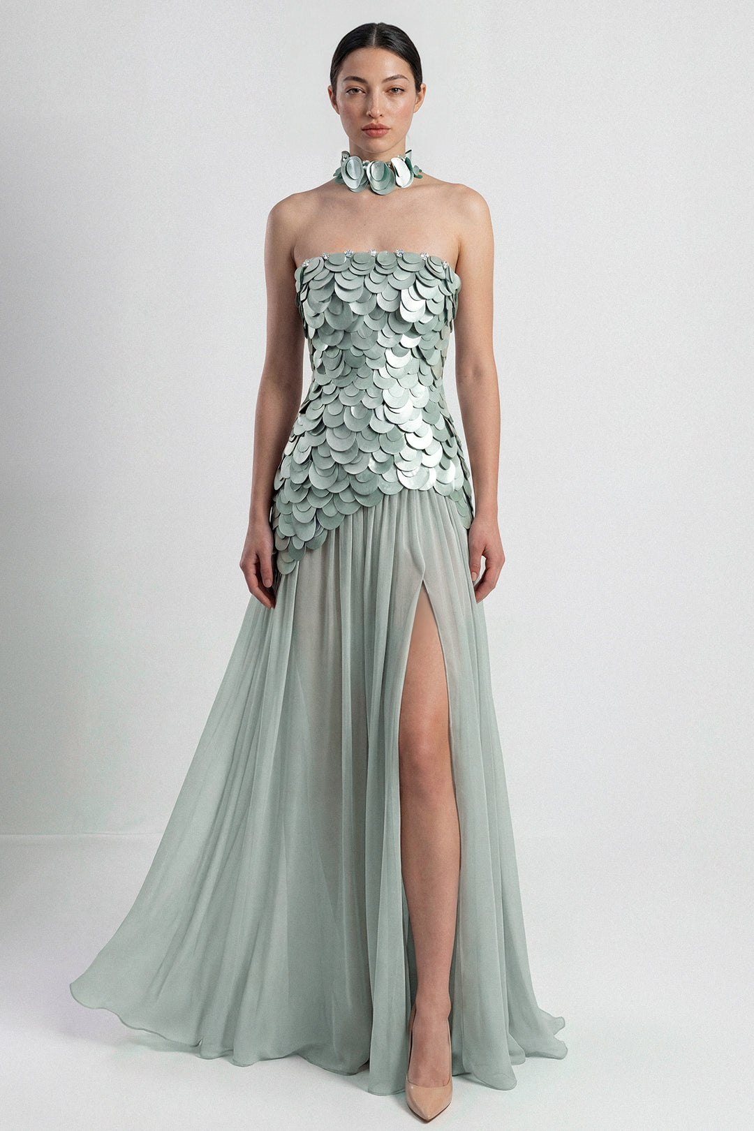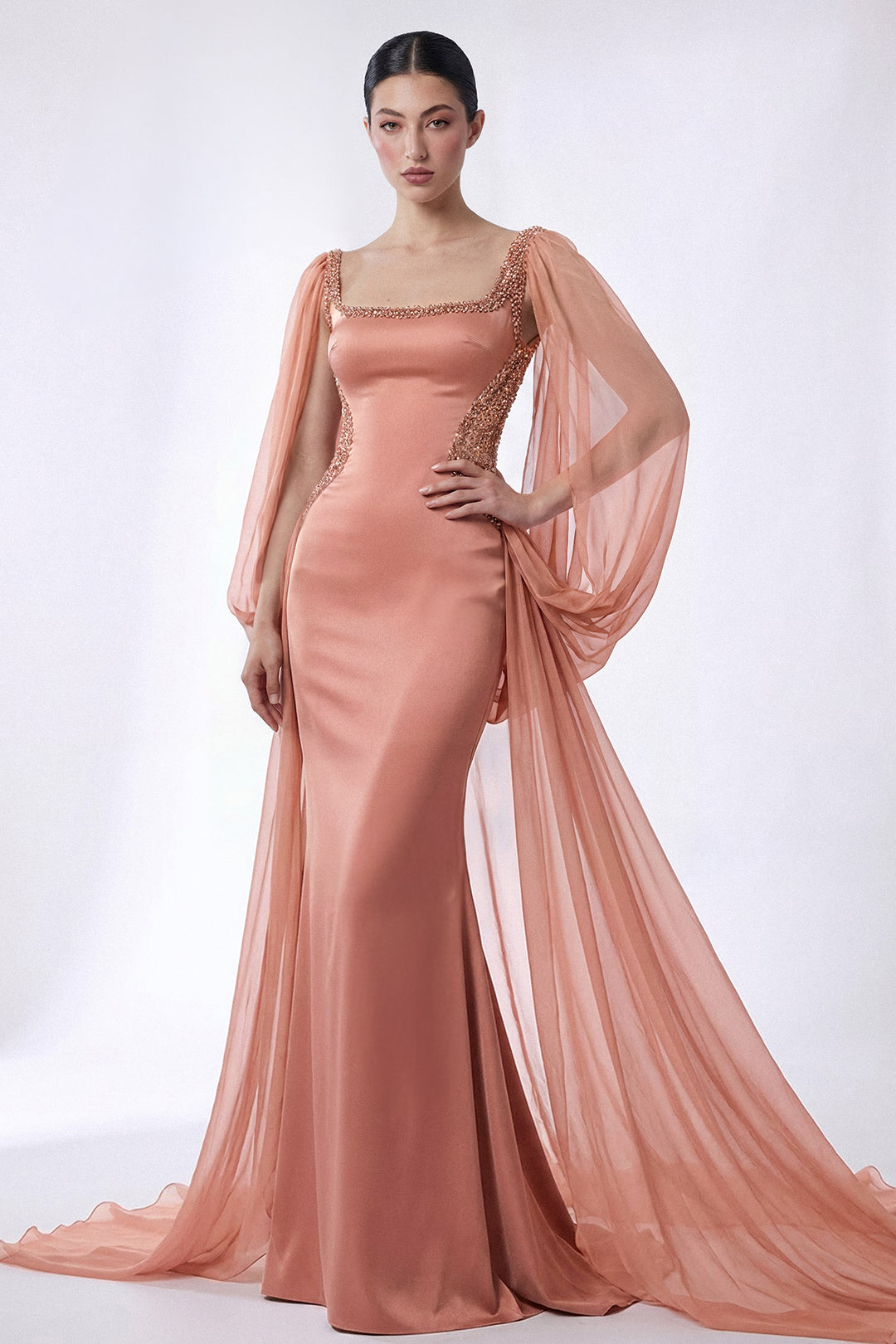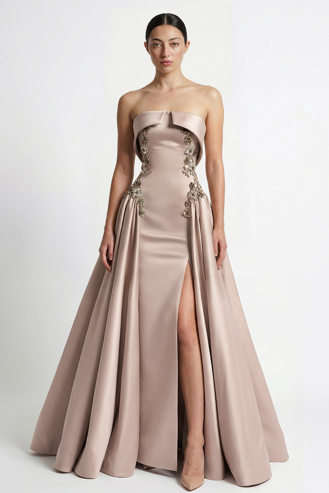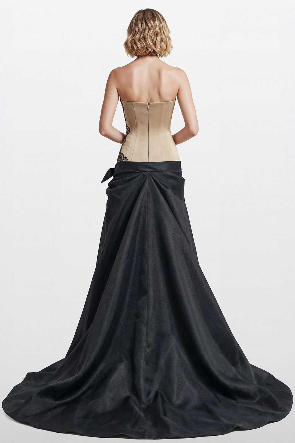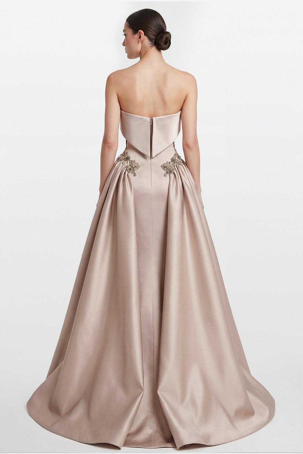 Strapless Embroidered Gown with Draped Chiffon Cape