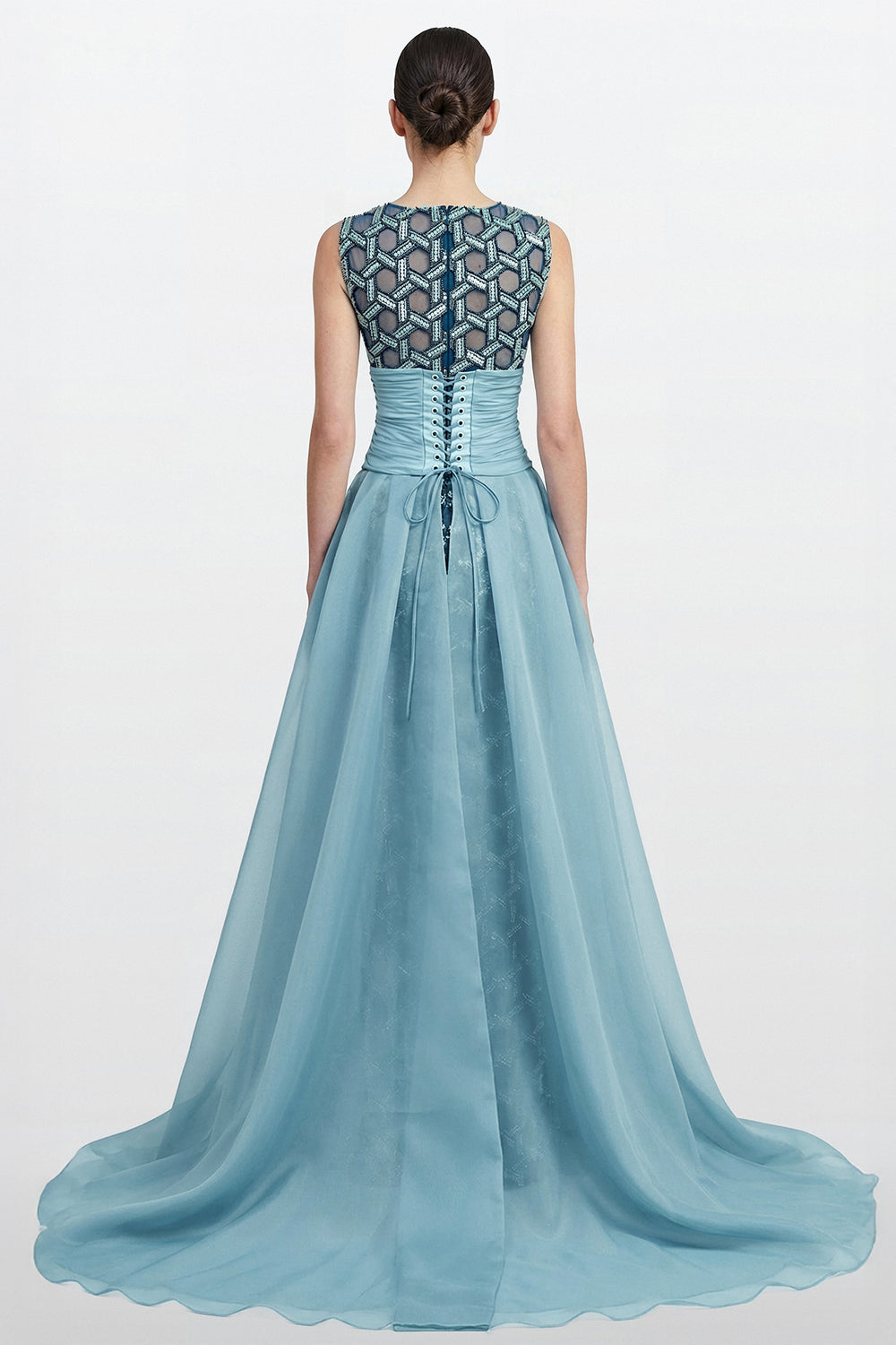 Off-Shoulder Corset Gown with Pleated Embellished Skirt
