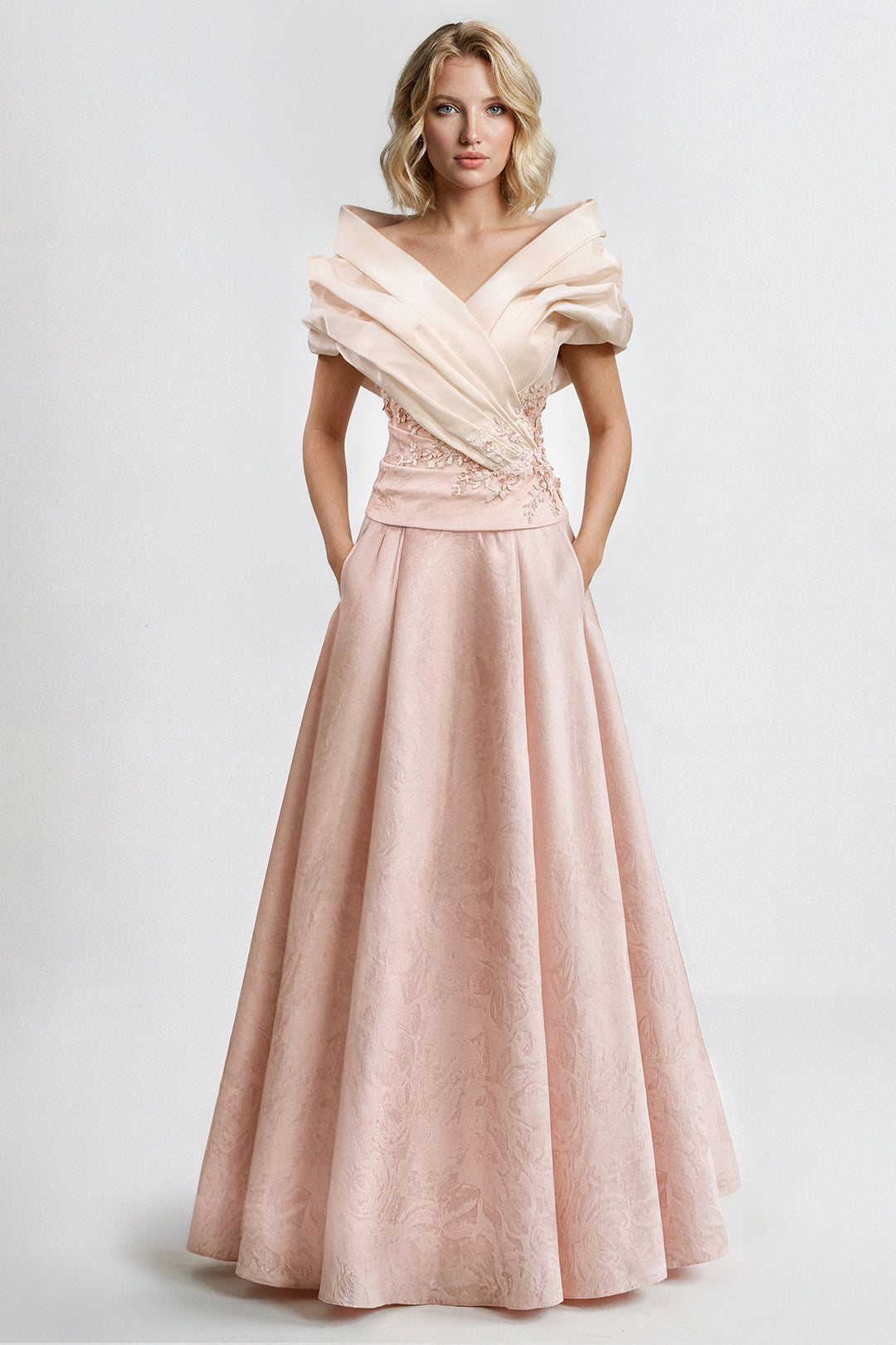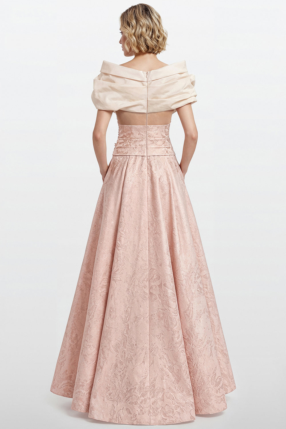Draped Taffeta Bodice Gown with Jacquard Skirt