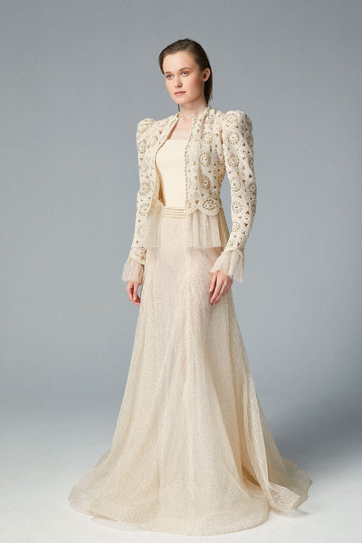 Embroidered Long-Sleeved Top with Crepe Skirt