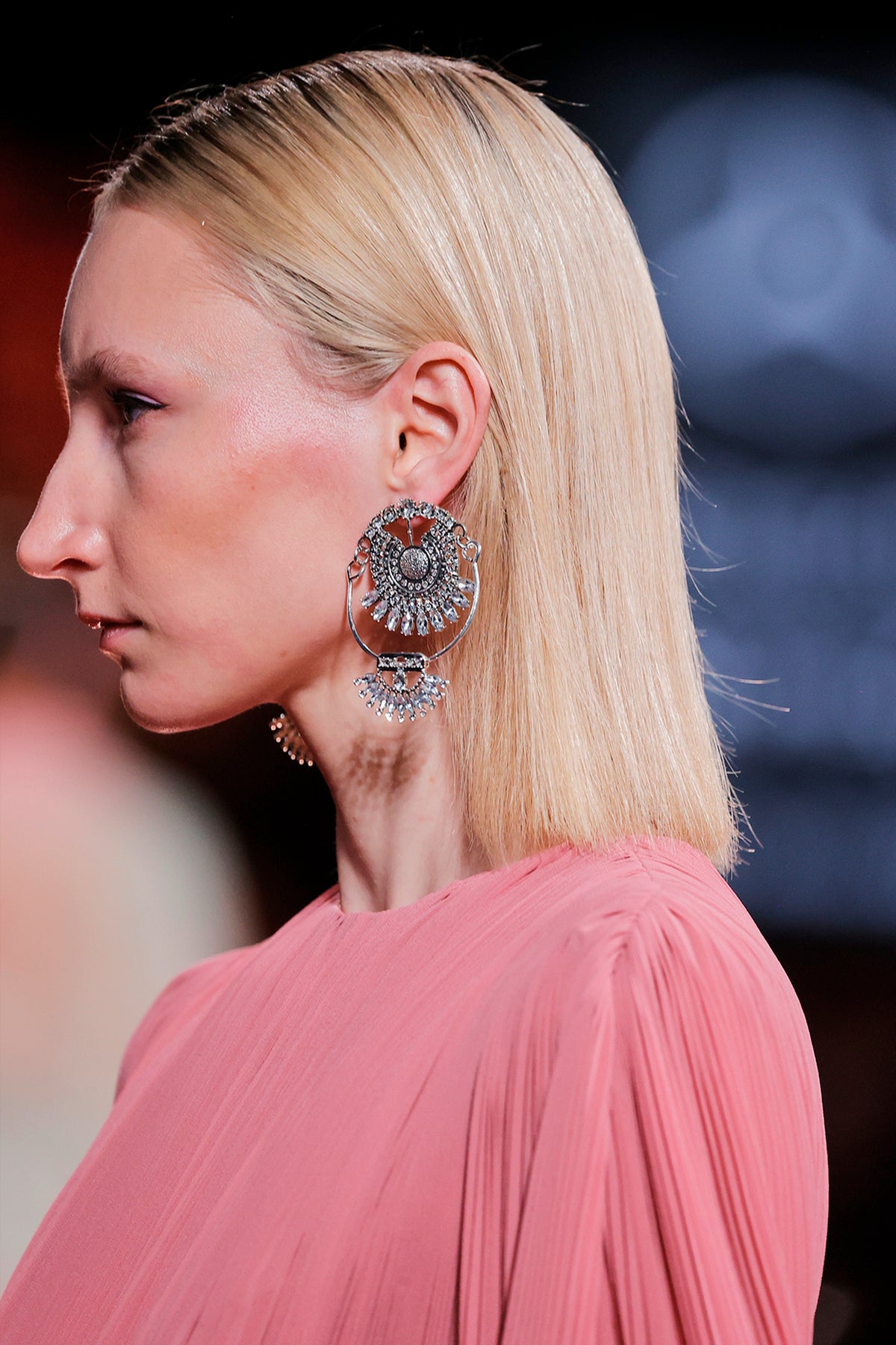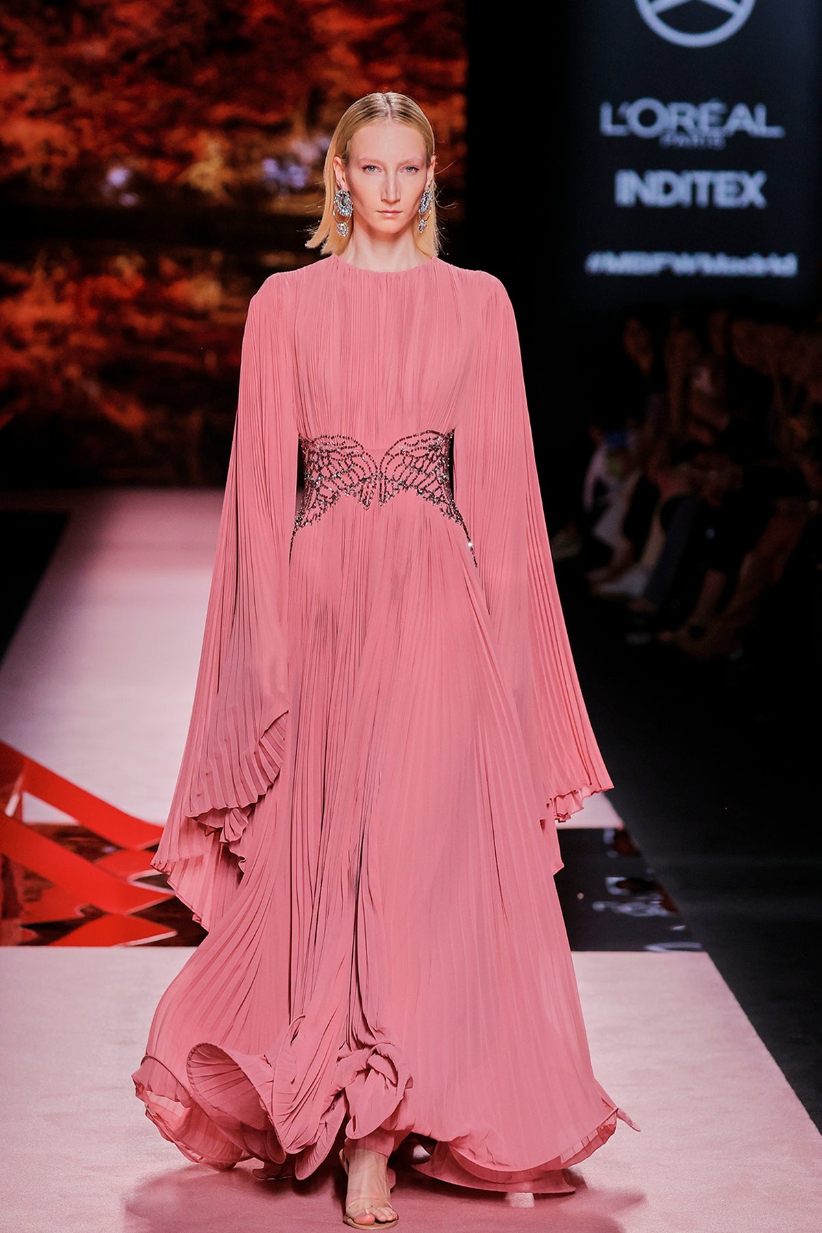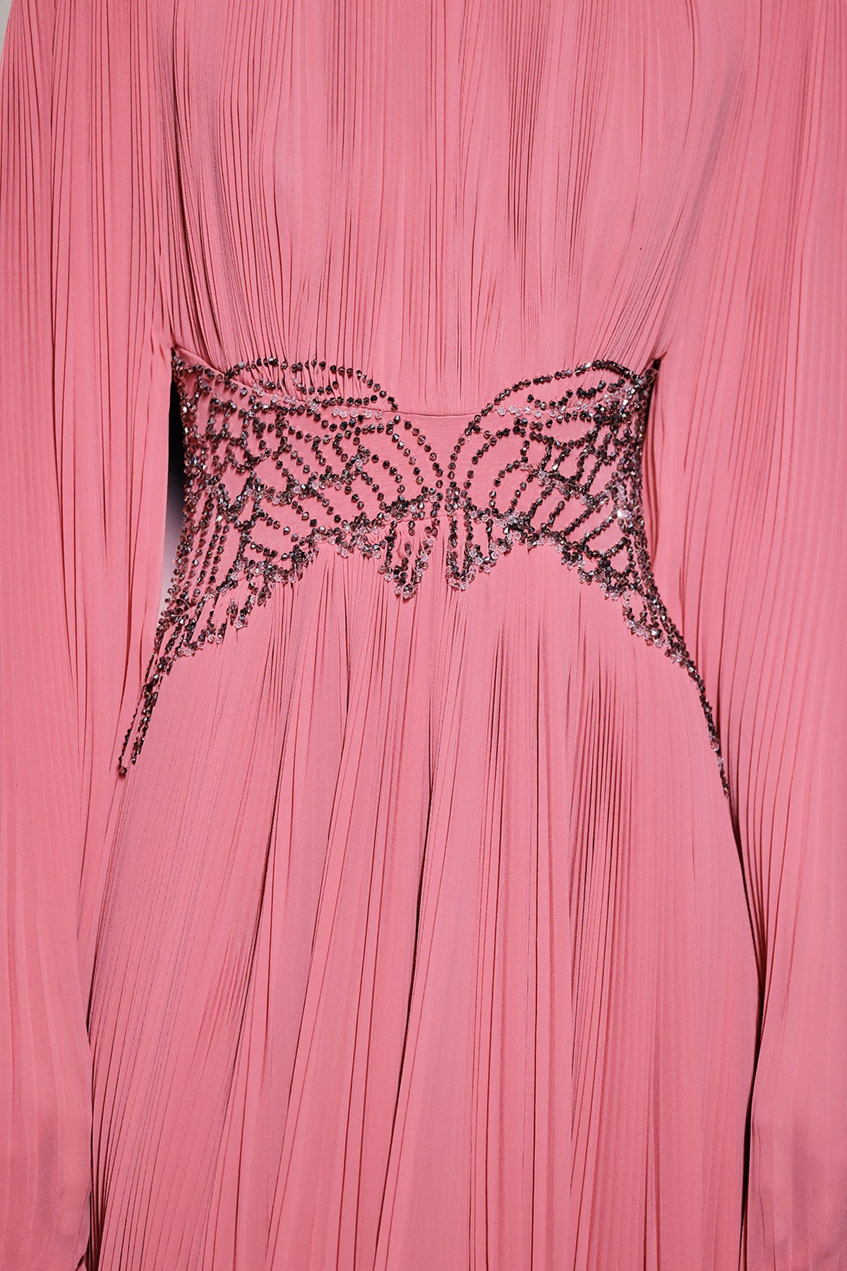 Blush a-line long dress. Featuring a closed neckline with flutter and long sleeves, and chiffon fabric.