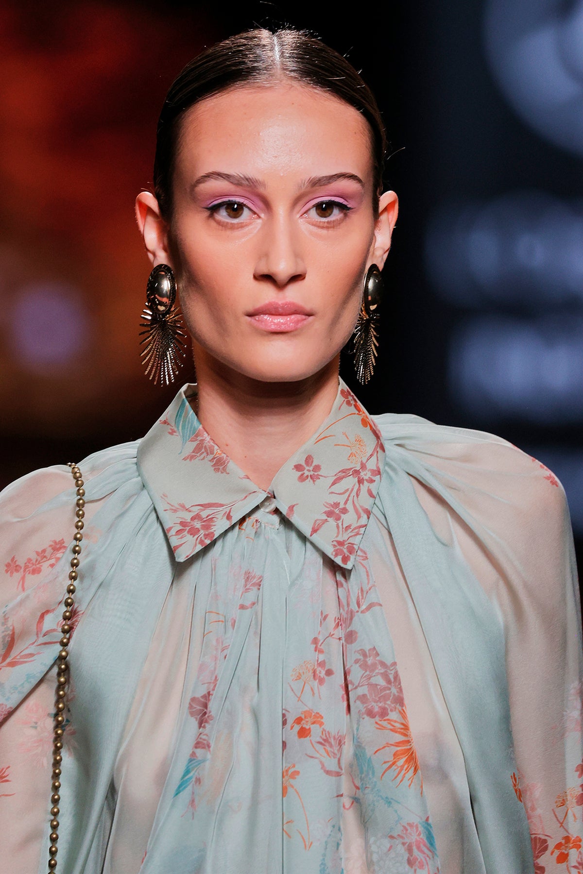 Multicolor chiffon top and skirt short dress. Featuring a closed neckline with lantern and long sleeves.