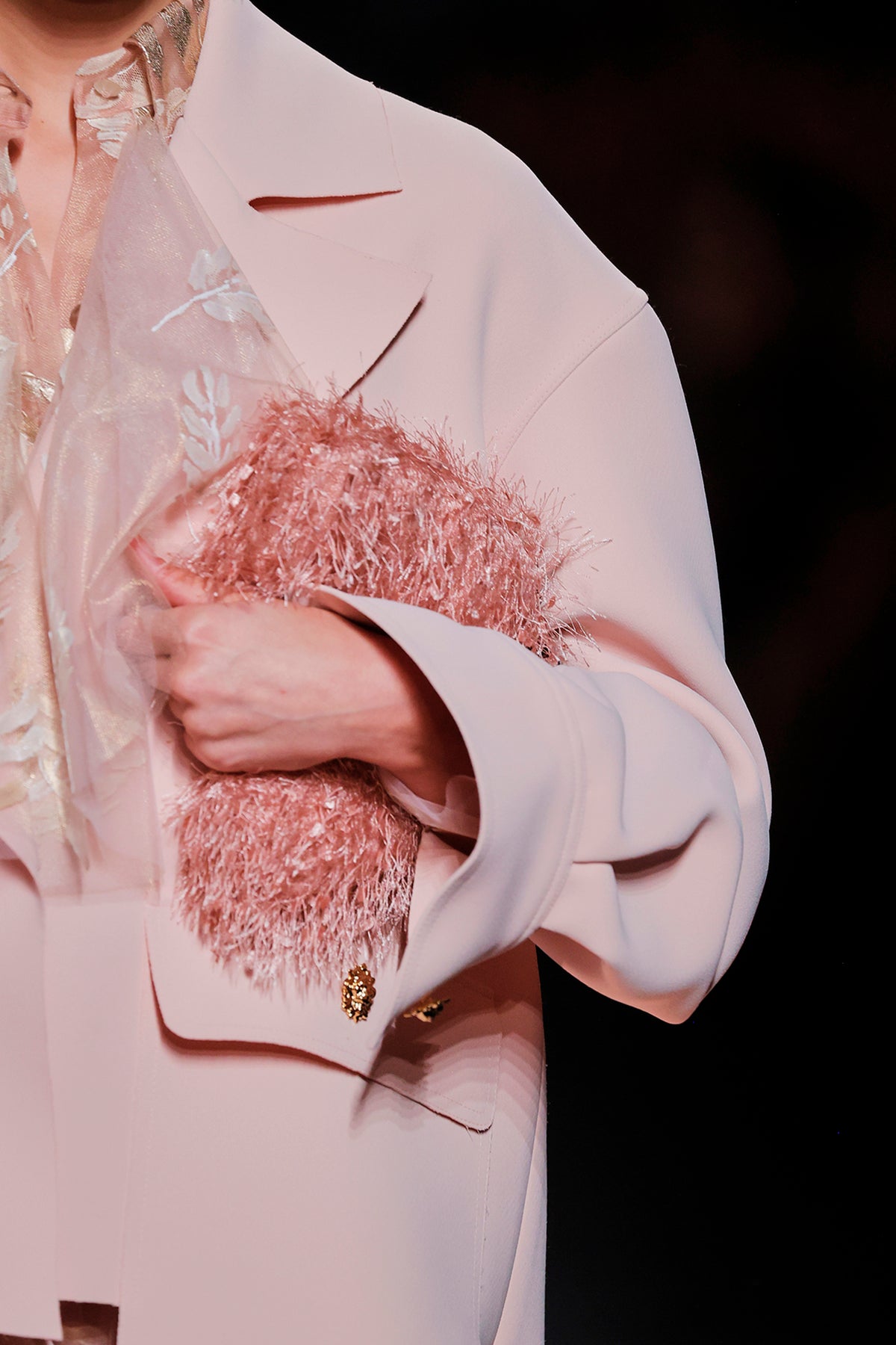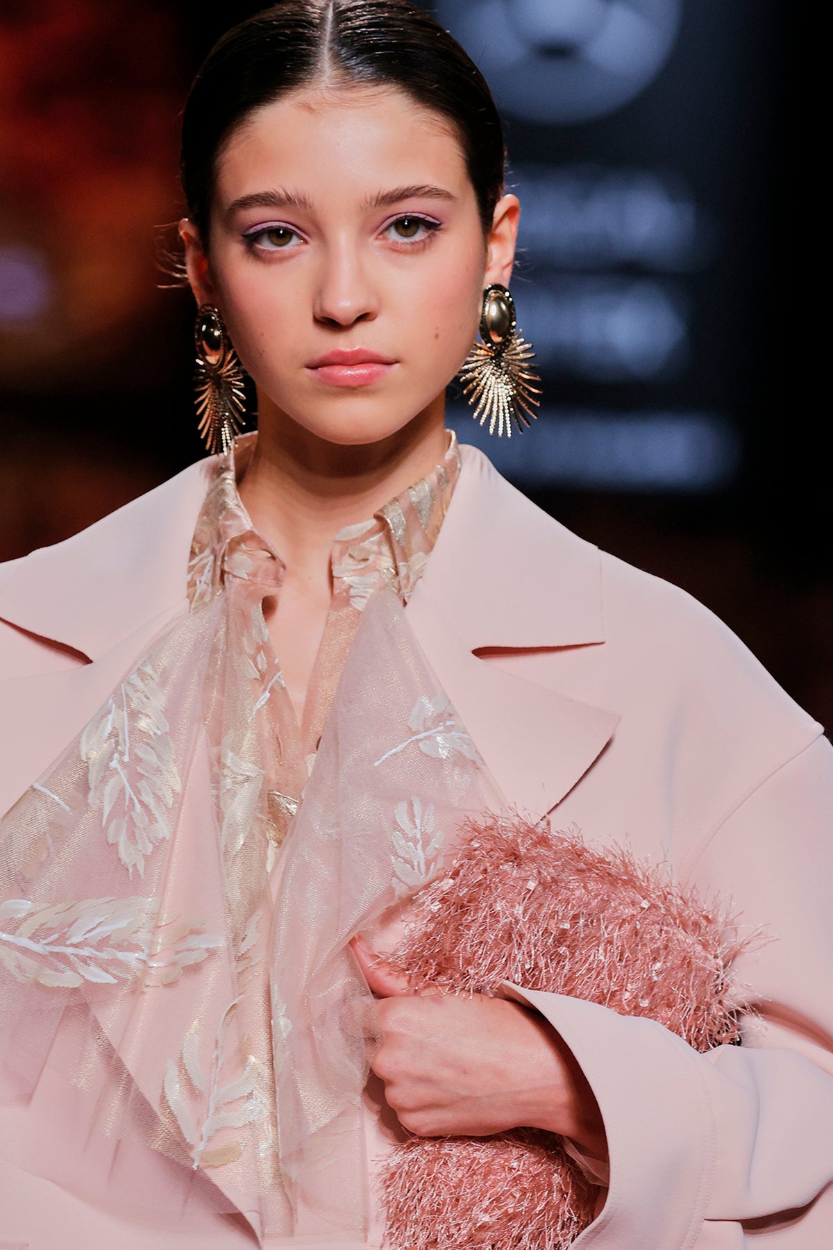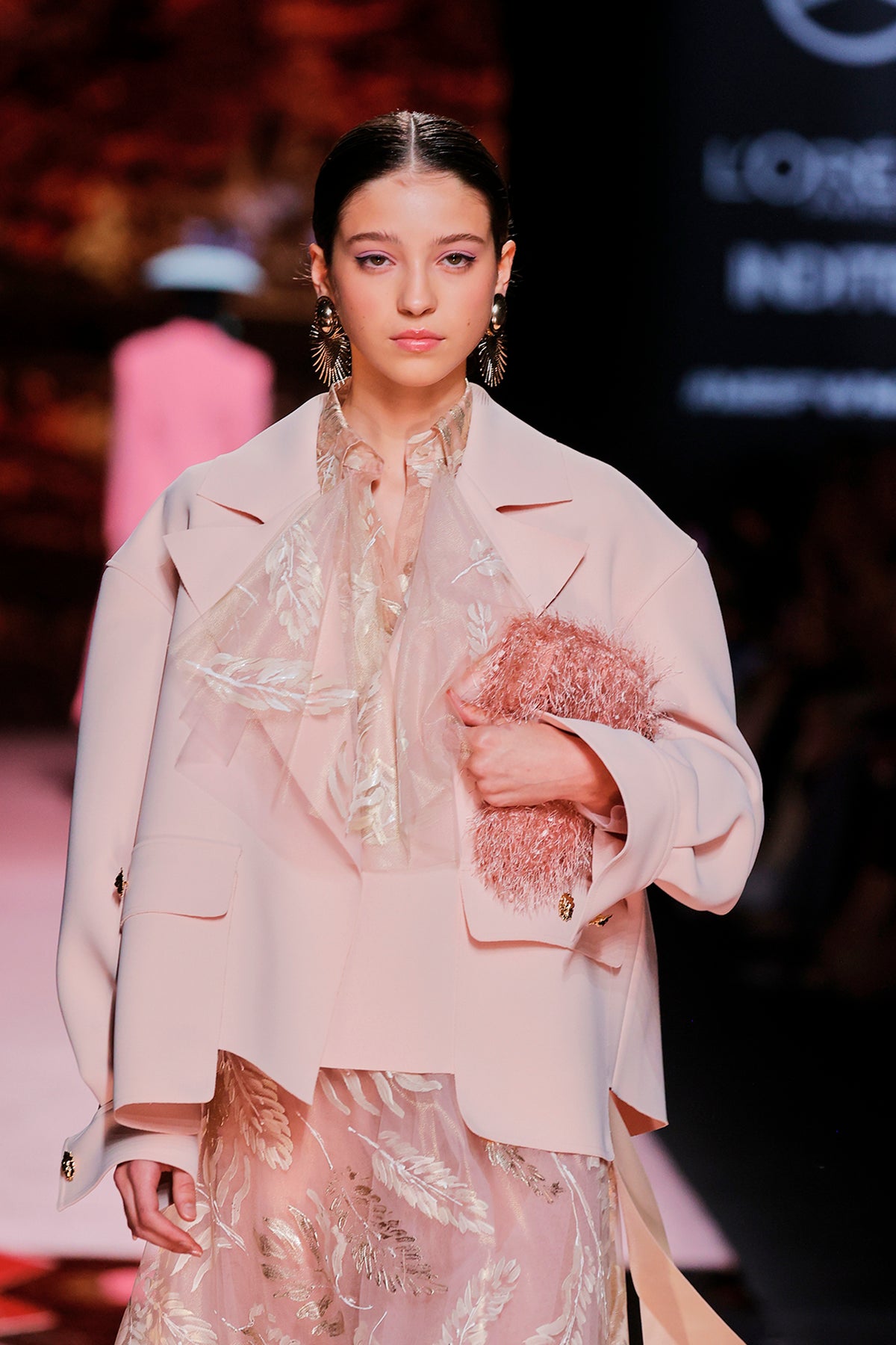 Beige A-line long dress. Featuring a closed neckline with fitted and long sleeves printed fabric.