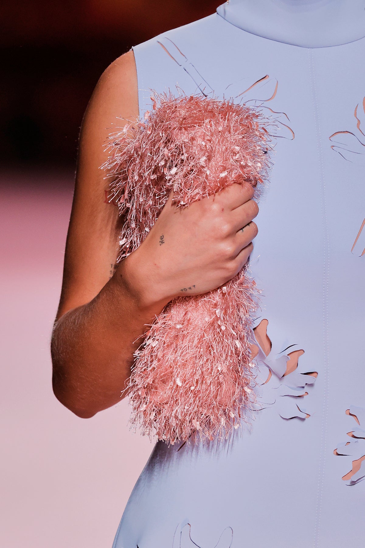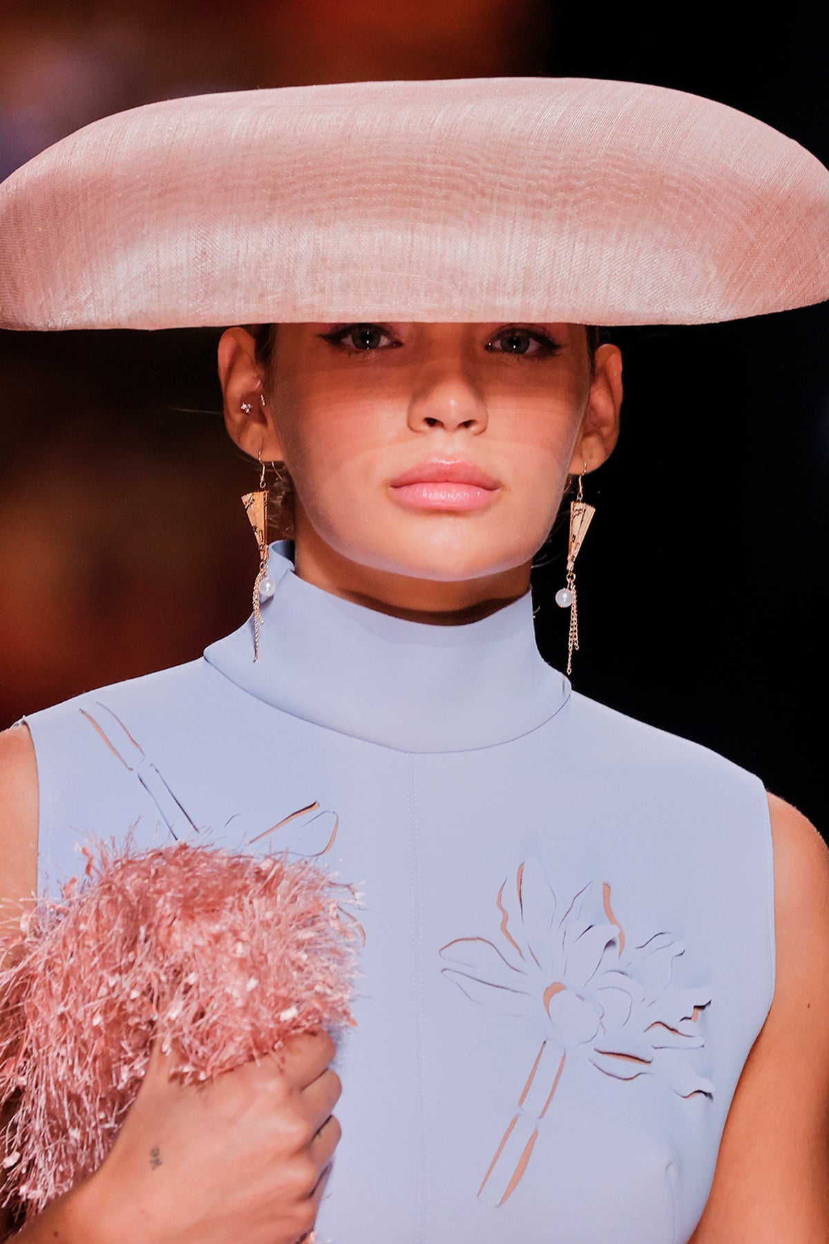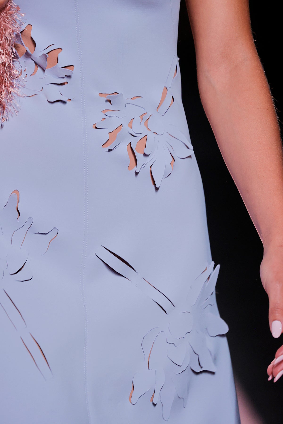 Light blue crepe long dress. Featuring a column with a jewel neckline and sleeveless.