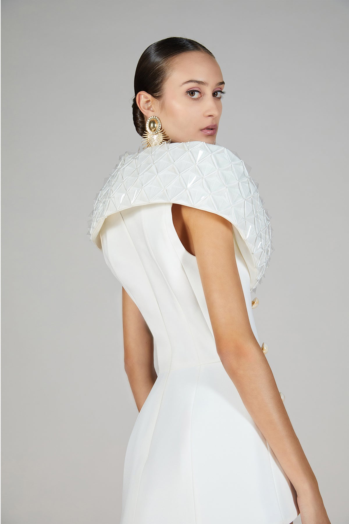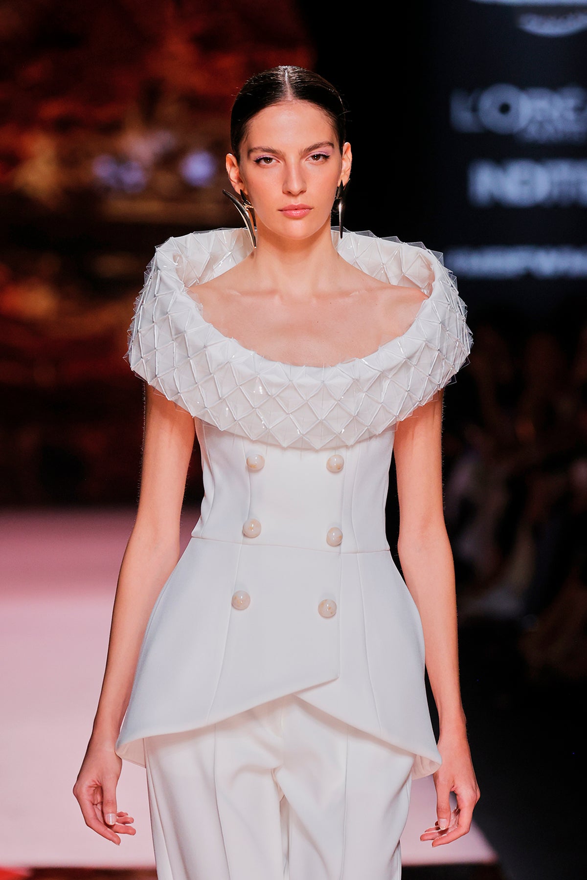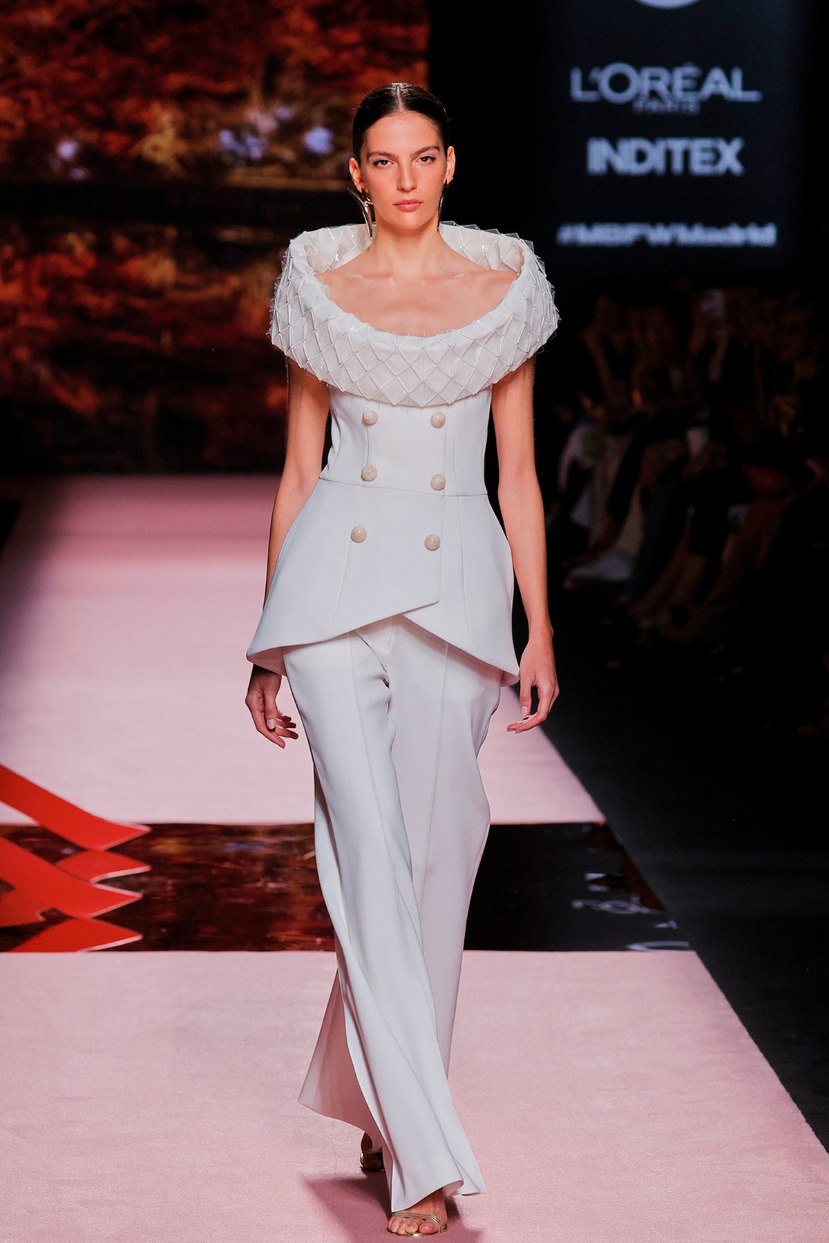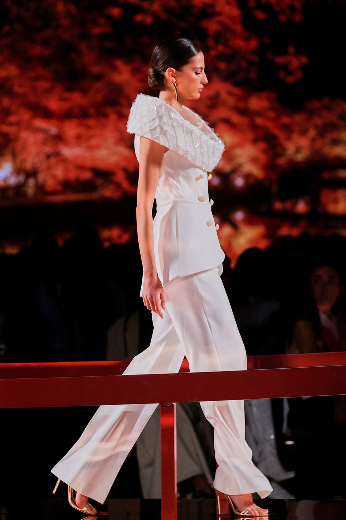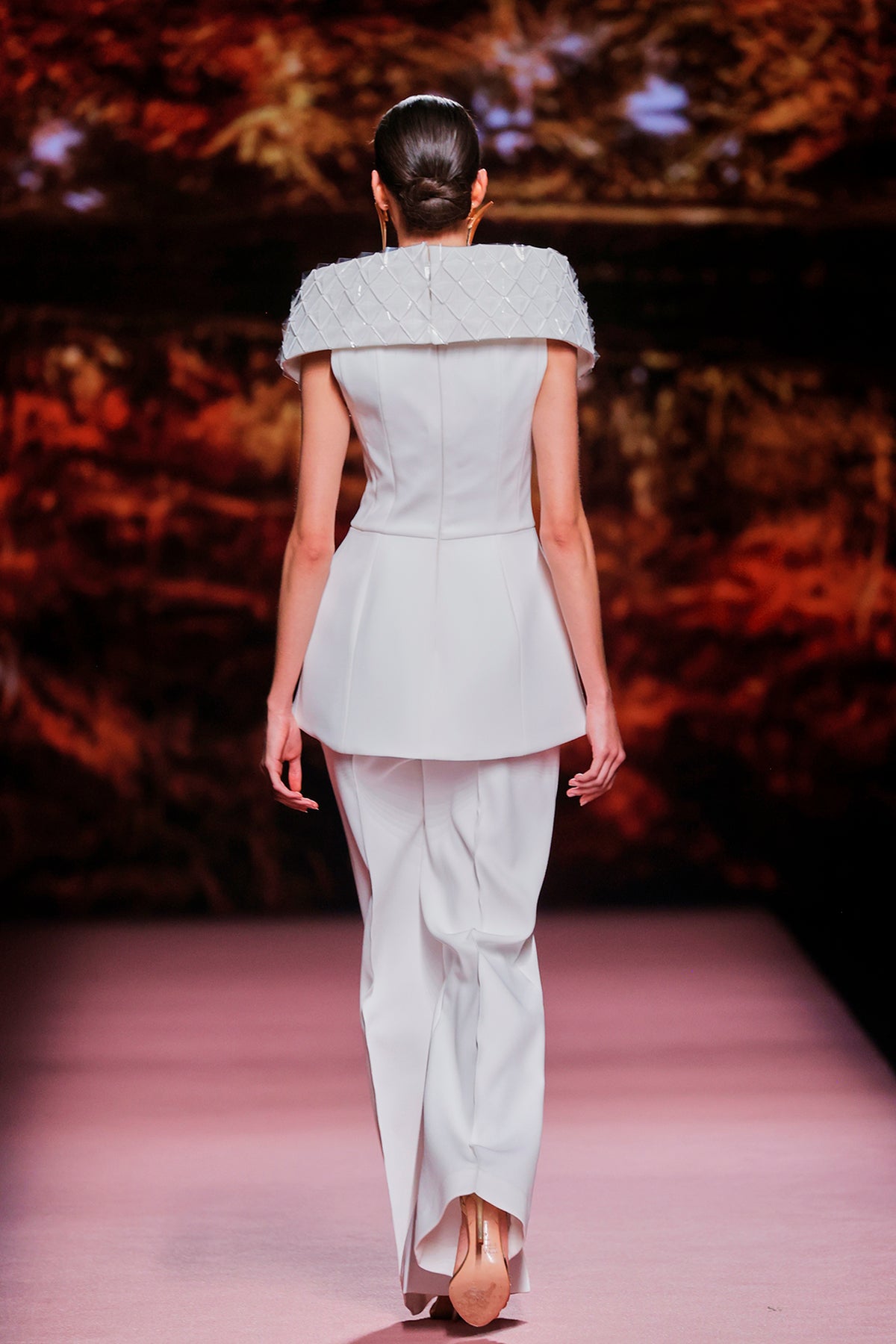 White crepe top and pants. Featuring a long dress with an off-the-shoulder neckline.
