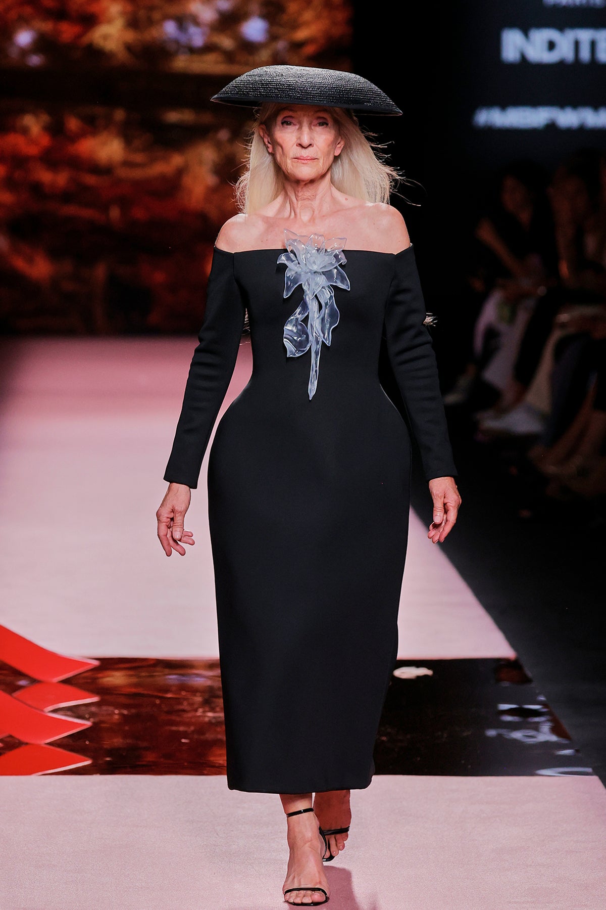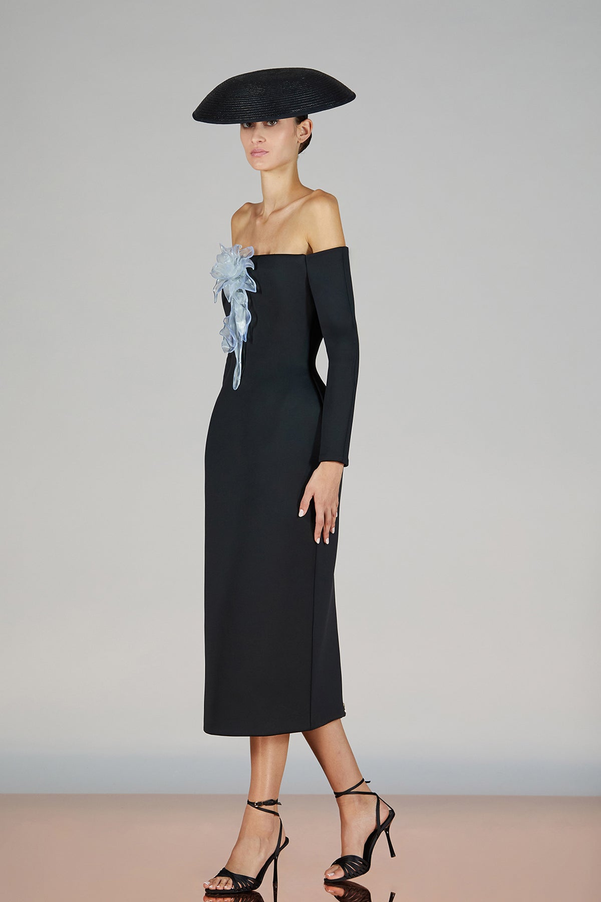 Black satin long dress. Featuring a column silhouette with an off-the-shoulder neckline with fitted and long sleeves.
