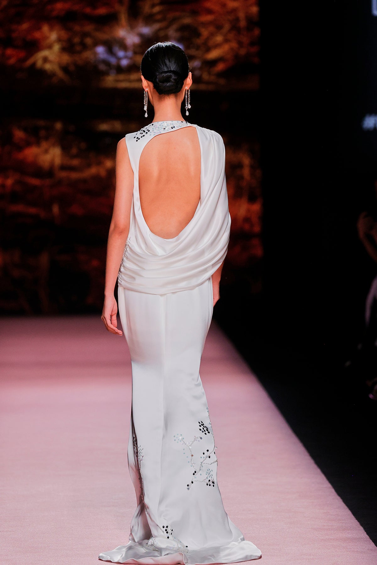 Blue long dress. Featuring a column silhouette with one shoulder and satin.