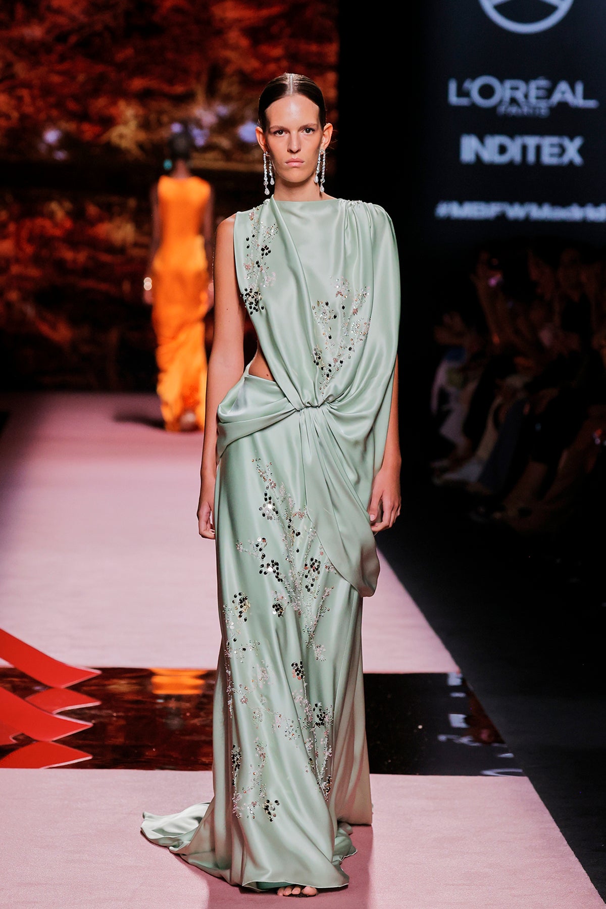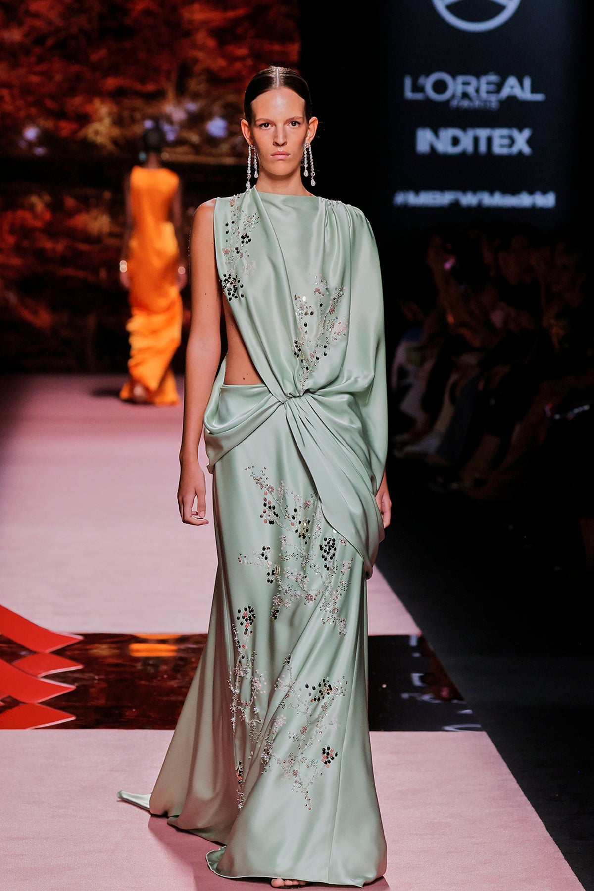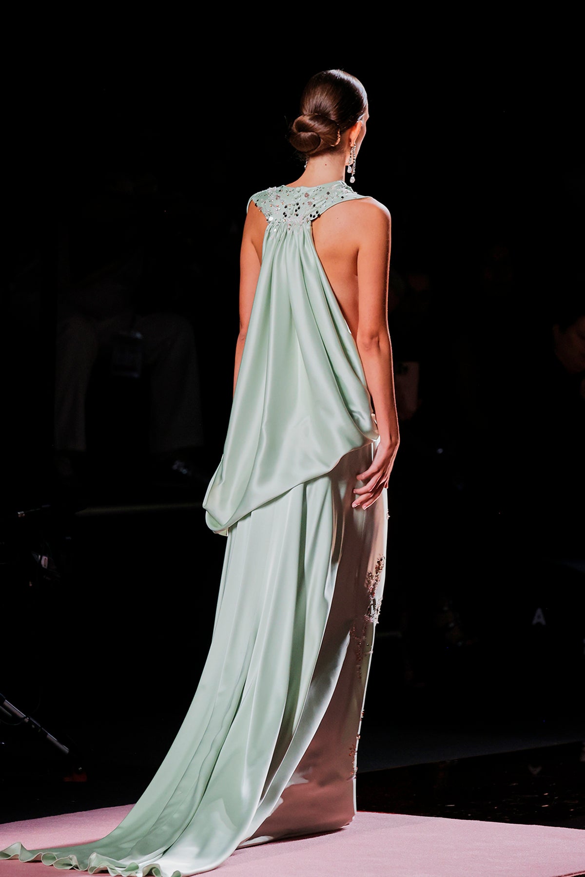Mint column long dress. Featuring a one-sleeve, loose with long sleeves and satin fabric.