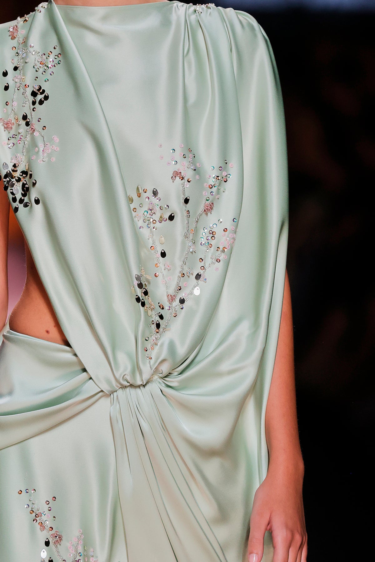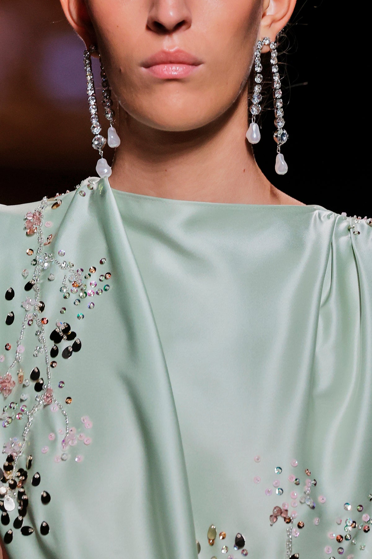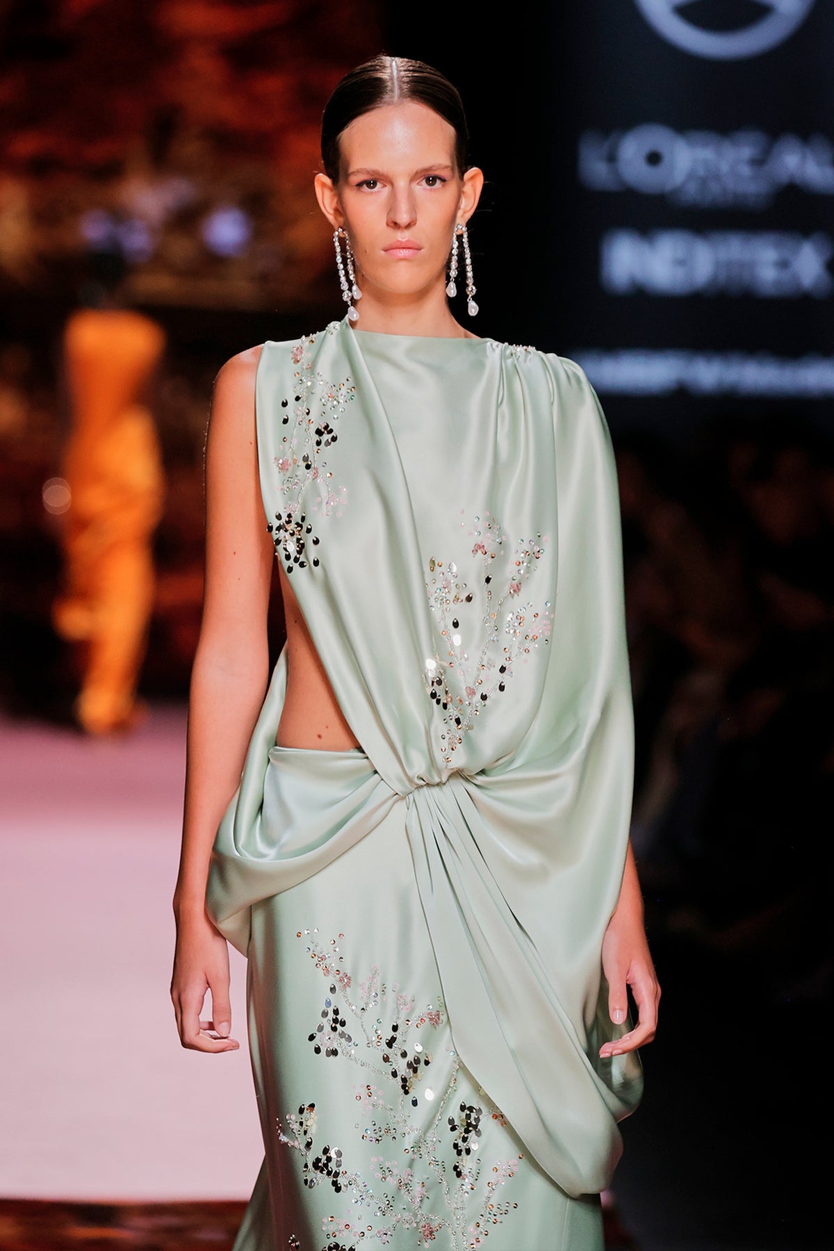 Mint column long dress. Featuring a one-sleeve, loose with long sleeves and satin fabric.