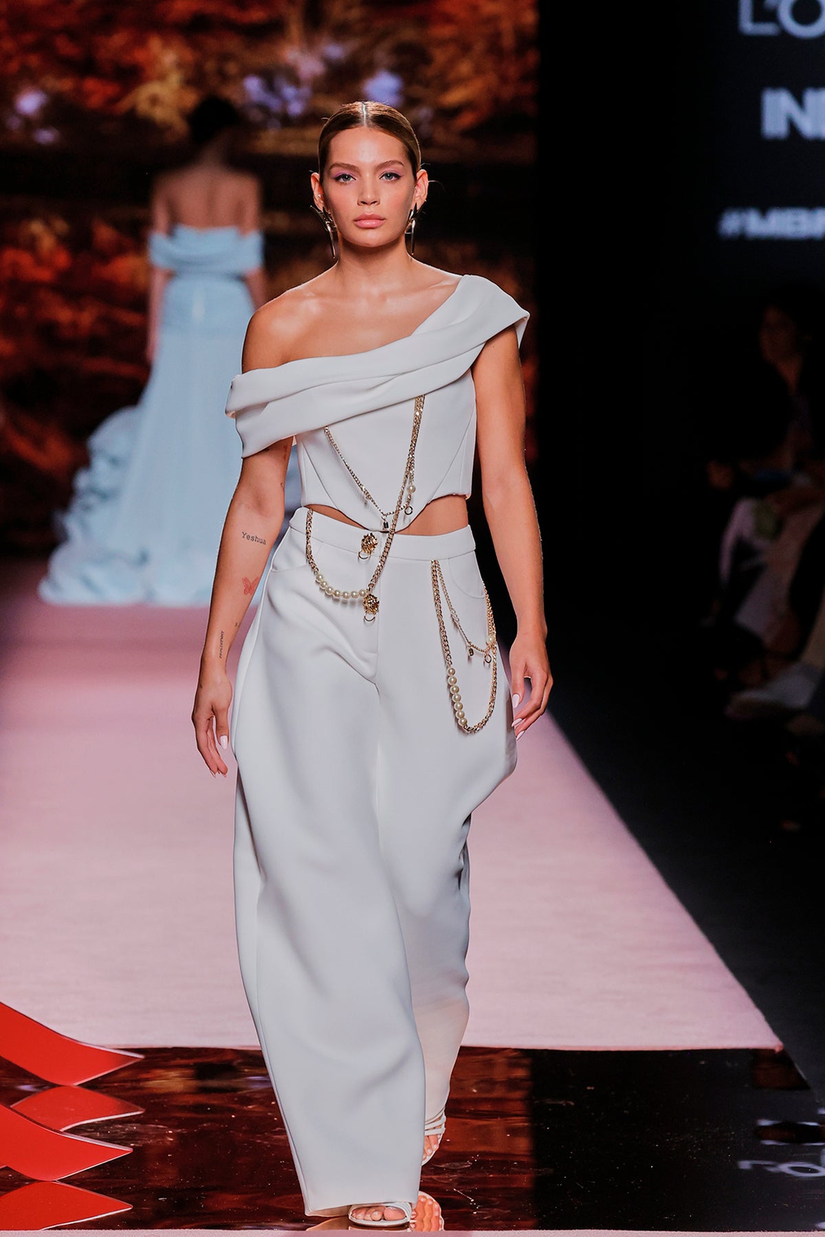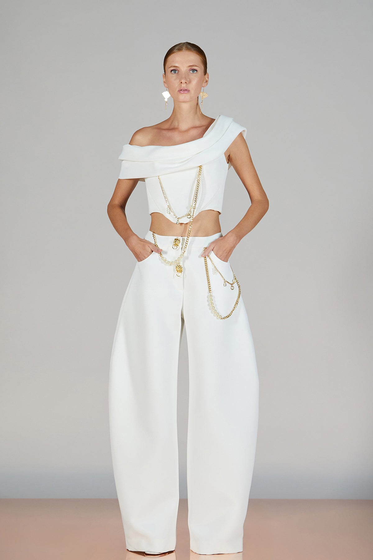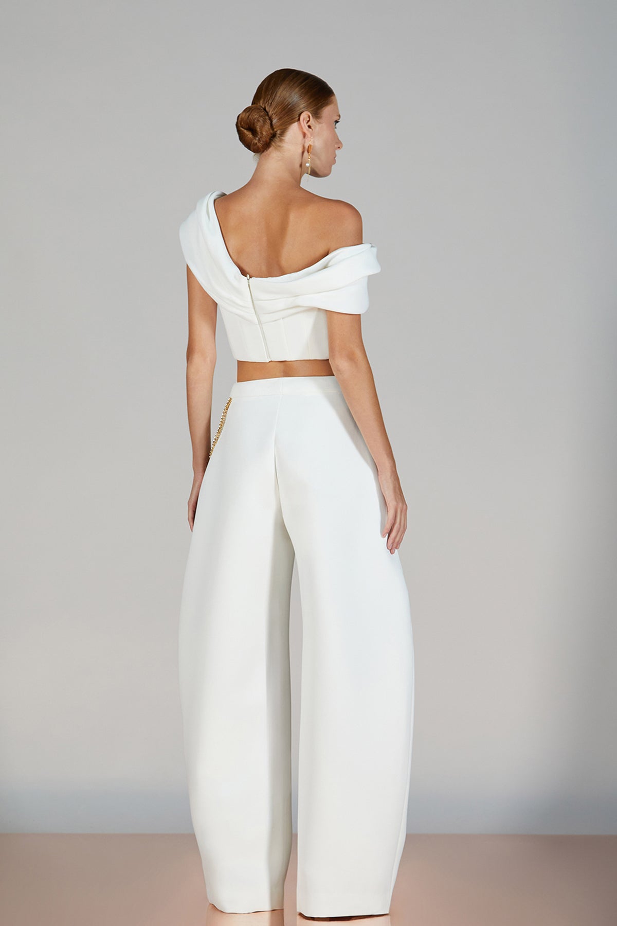 White crepe top and pants. Featuring an open neckline with loose and short sleeves.
