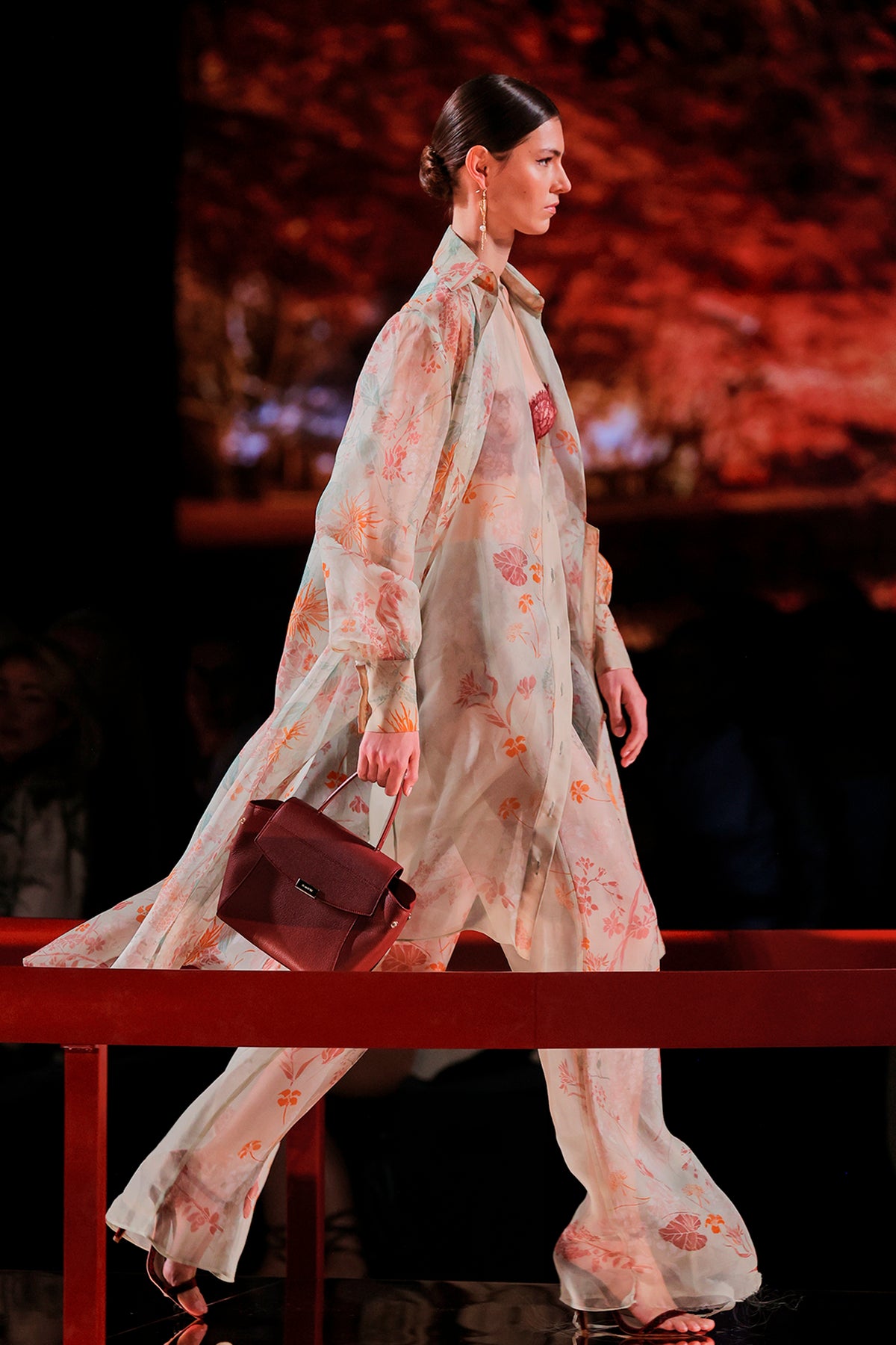 Multicolour printed fabric pantsuit. Featuring an open neckline with loose and long sleeves.