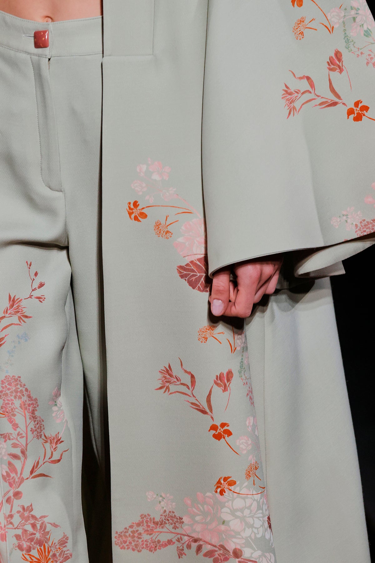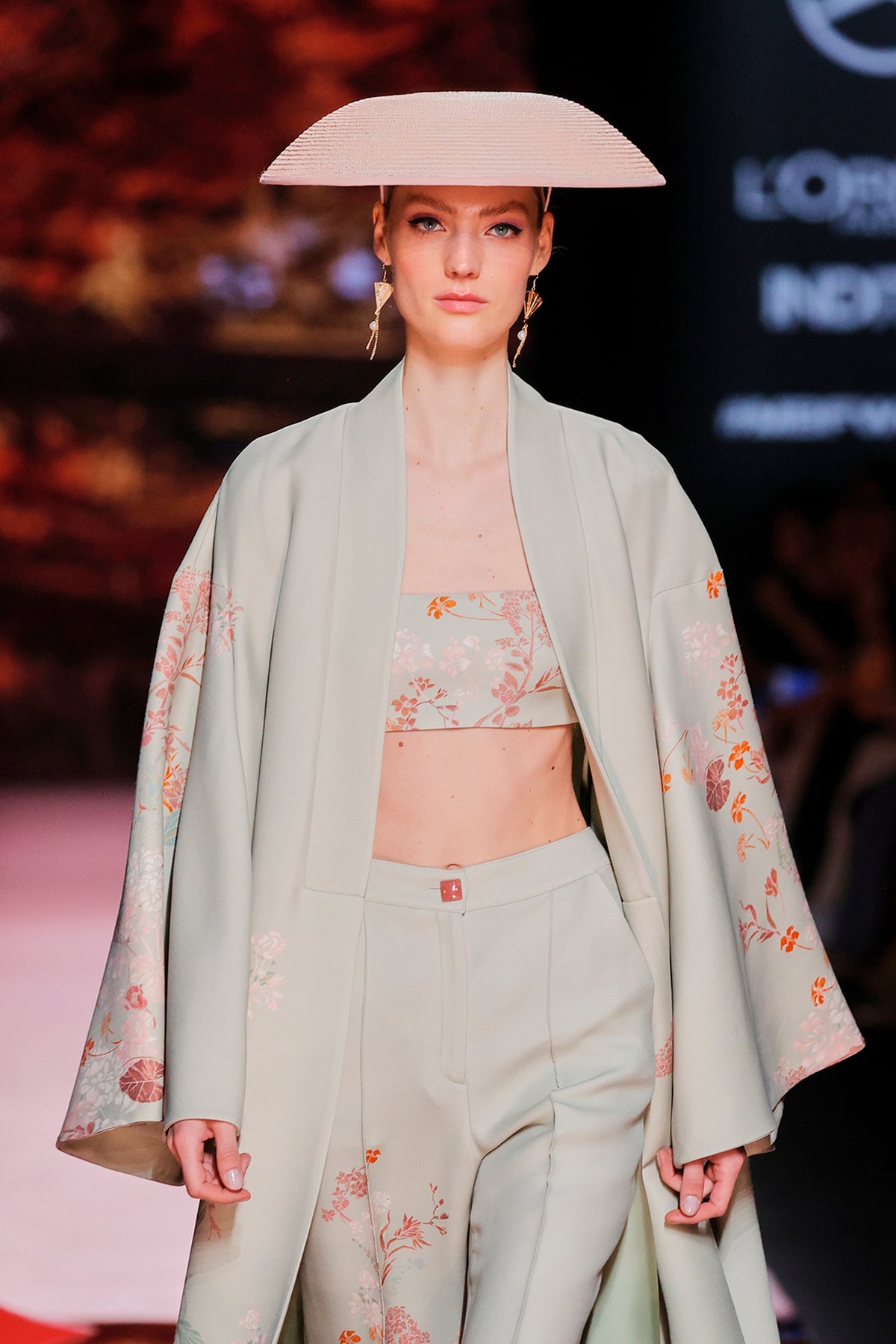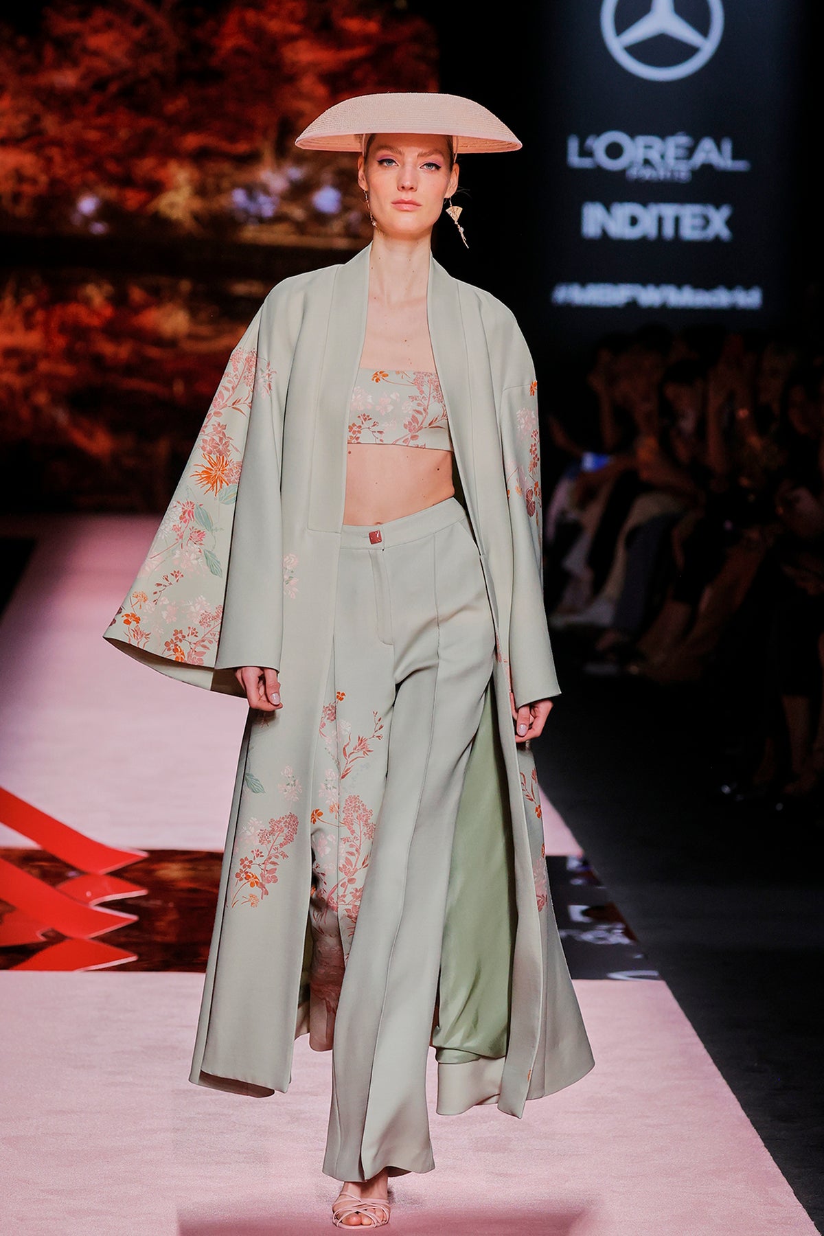 Multicolor top and long pants dress. Featuring a V-neckline with long bell sleeves and satin fabrics.