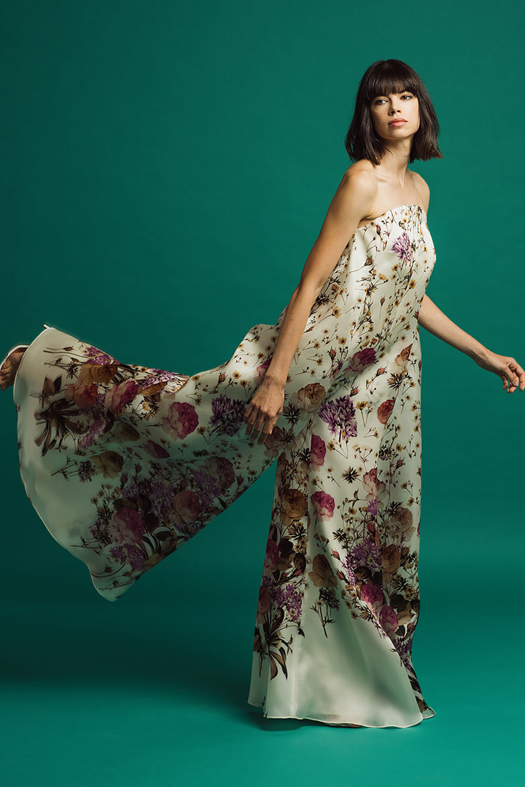Multicolored printed strapless loose flared jumpsuit. Featuring a straight neckline, and a loose fit from neckline to hemline. Complemented with wide-legged pants.
