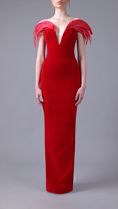 Strapless Velvet Dress with Feathers