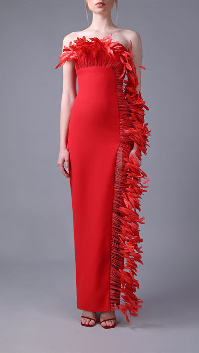 Strapless Crepe Dress with Feathers