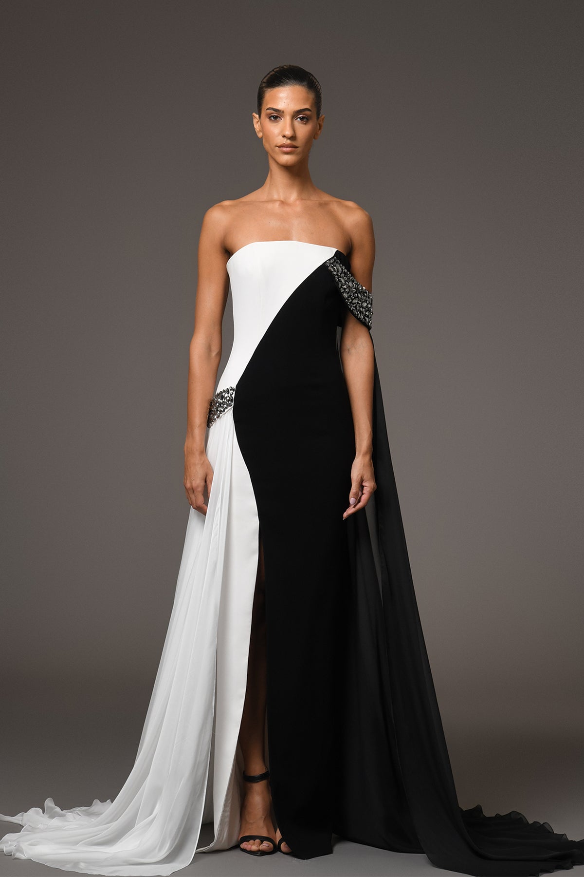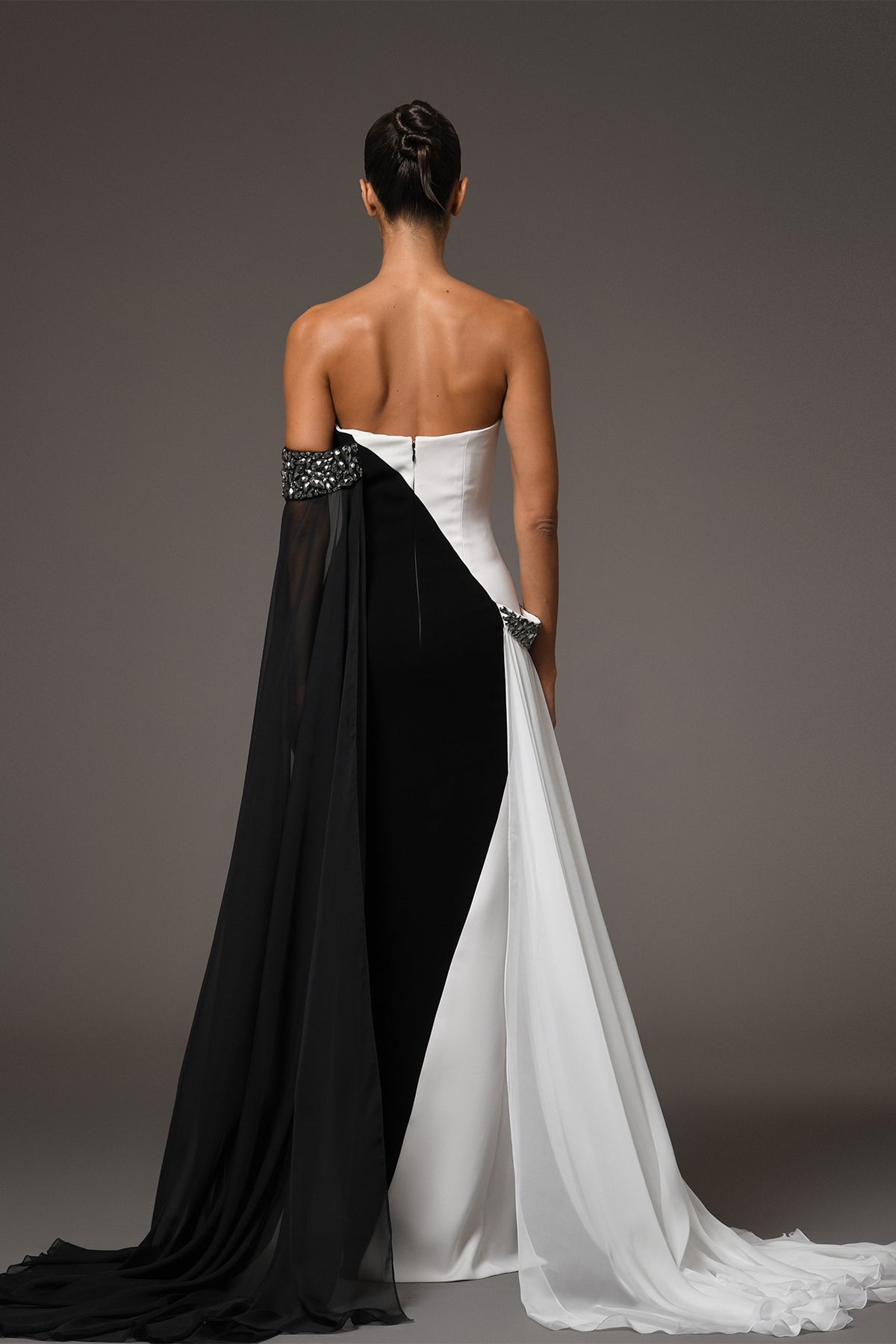 Black and white strapless crêpe long dress. Featuring a chiffon and embroidery detailing and center back zipper.