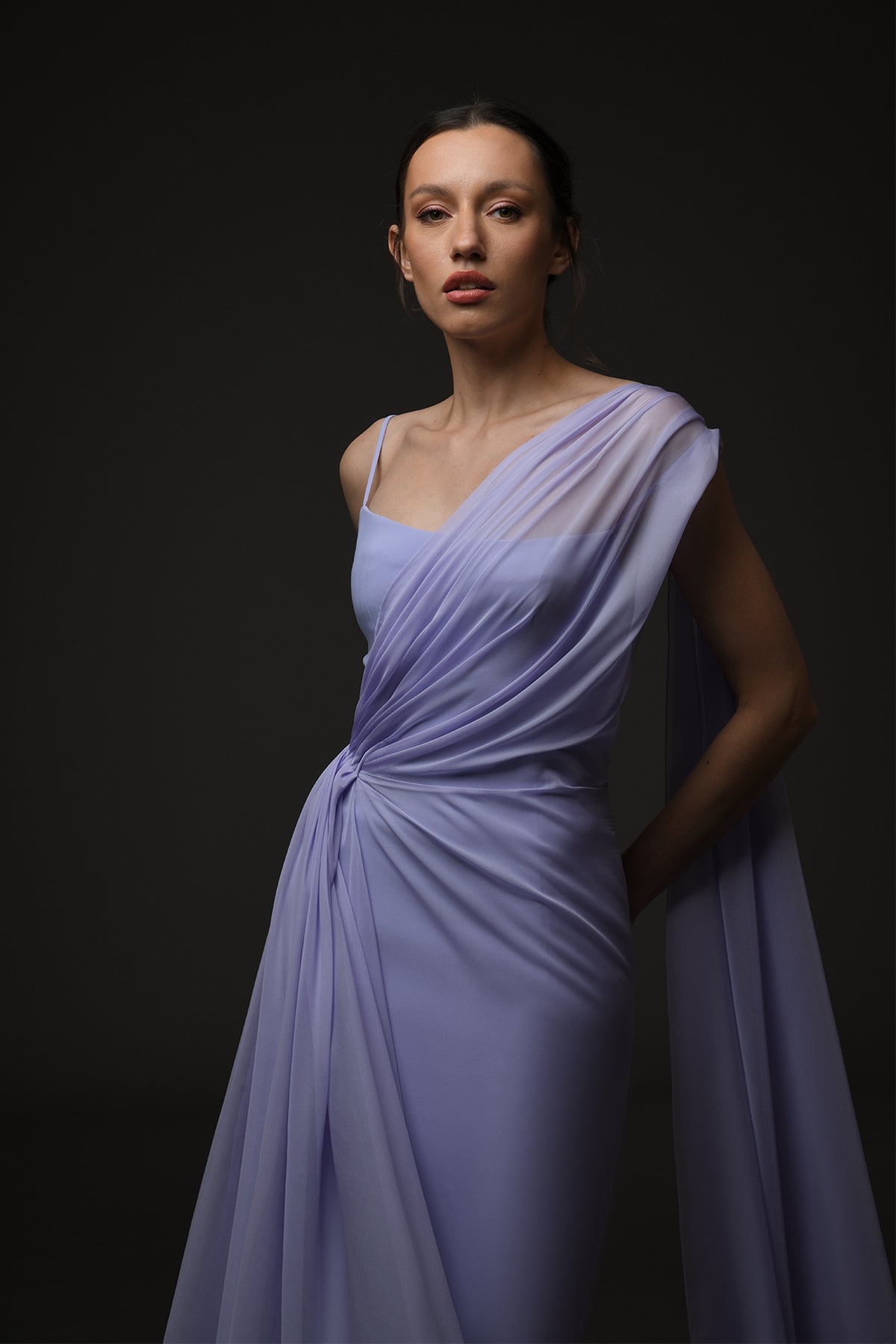 Lilac crêpe long dress. Featuring a one side chiffon and asymmetric, draping and back slit.