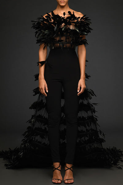 Off-The-Shoulder Jumpsuit with Feathers and Overskirt