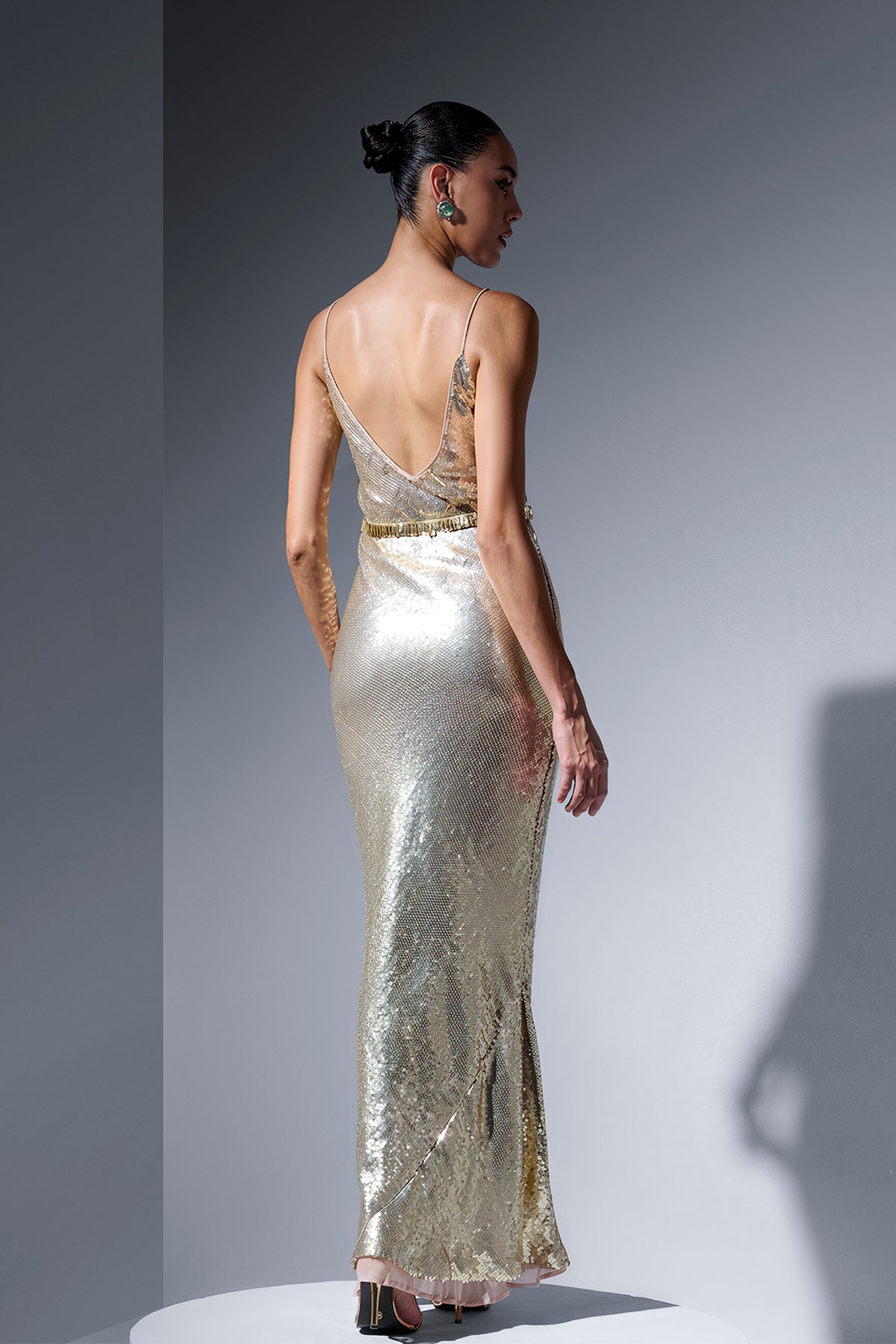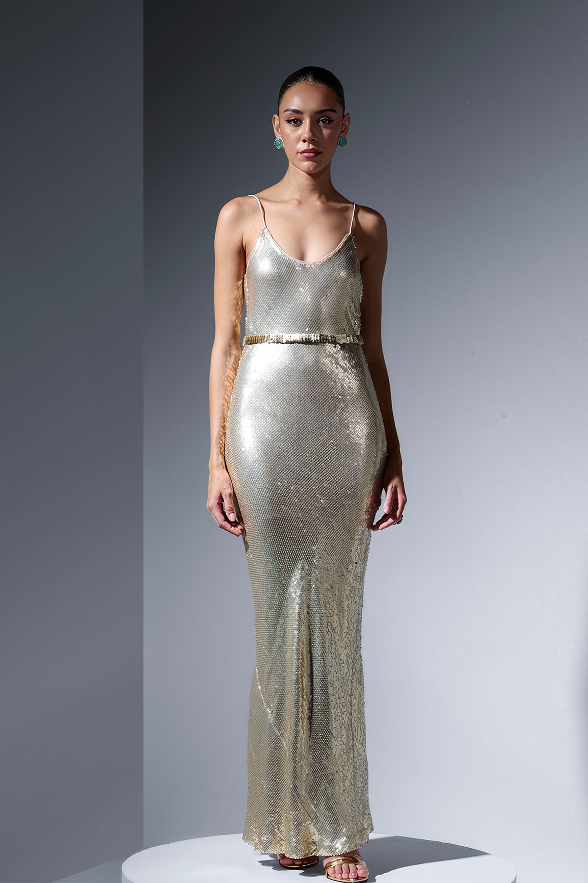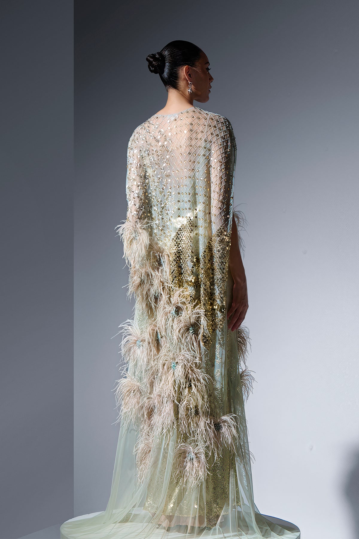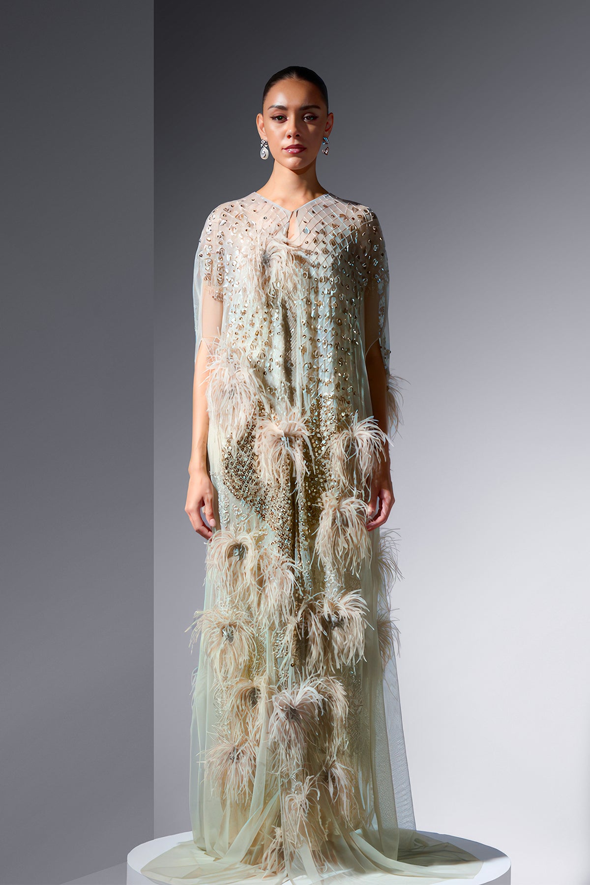 Mint soft mesh dress. Featuring cape sequin embroidery that creates a mesmerizing shimmer with delicate feathers along the cape.