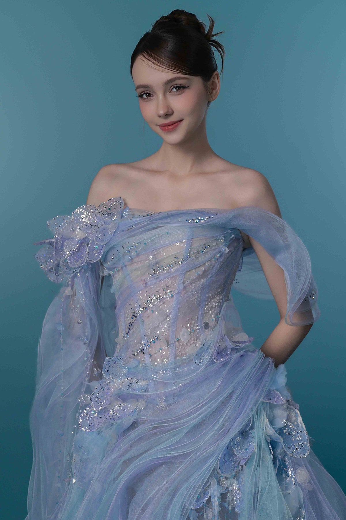 Multi tulle floor-length dress. Featuring an off-the-shoulder neckline with a fitted and appears somewhat sheer or illusion. Complemented with a sparkling sequins, crystals, delicate floral with a cape on the right side.
