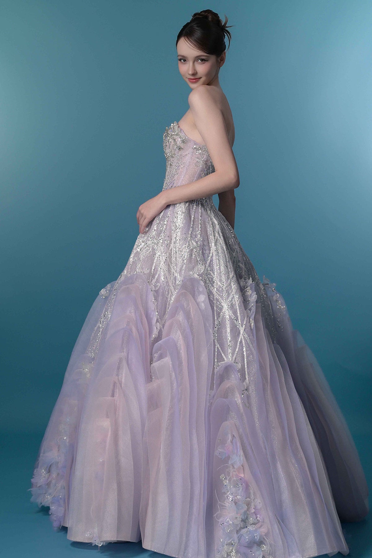 Pale lilac a-line long dress. Featuring a strapless neckline with a fitted bodice that cinches at the natural waistline. Complemented with a 3D floral appliqués in soft pastel shades of blue, pink and purple.