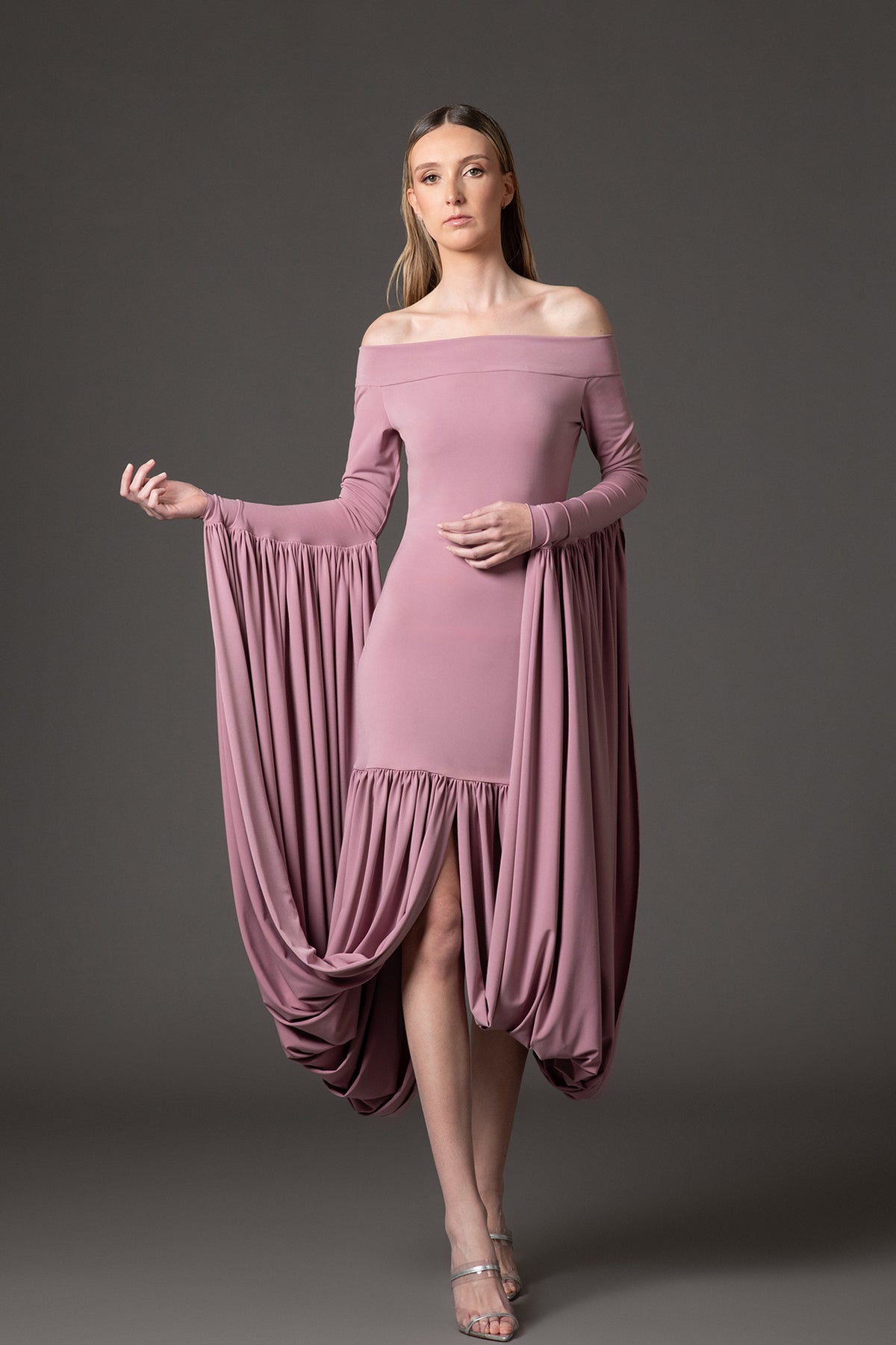 Vintage rose midi dress. Featuring an off-the-shoulder vintage rose short jersey dress.