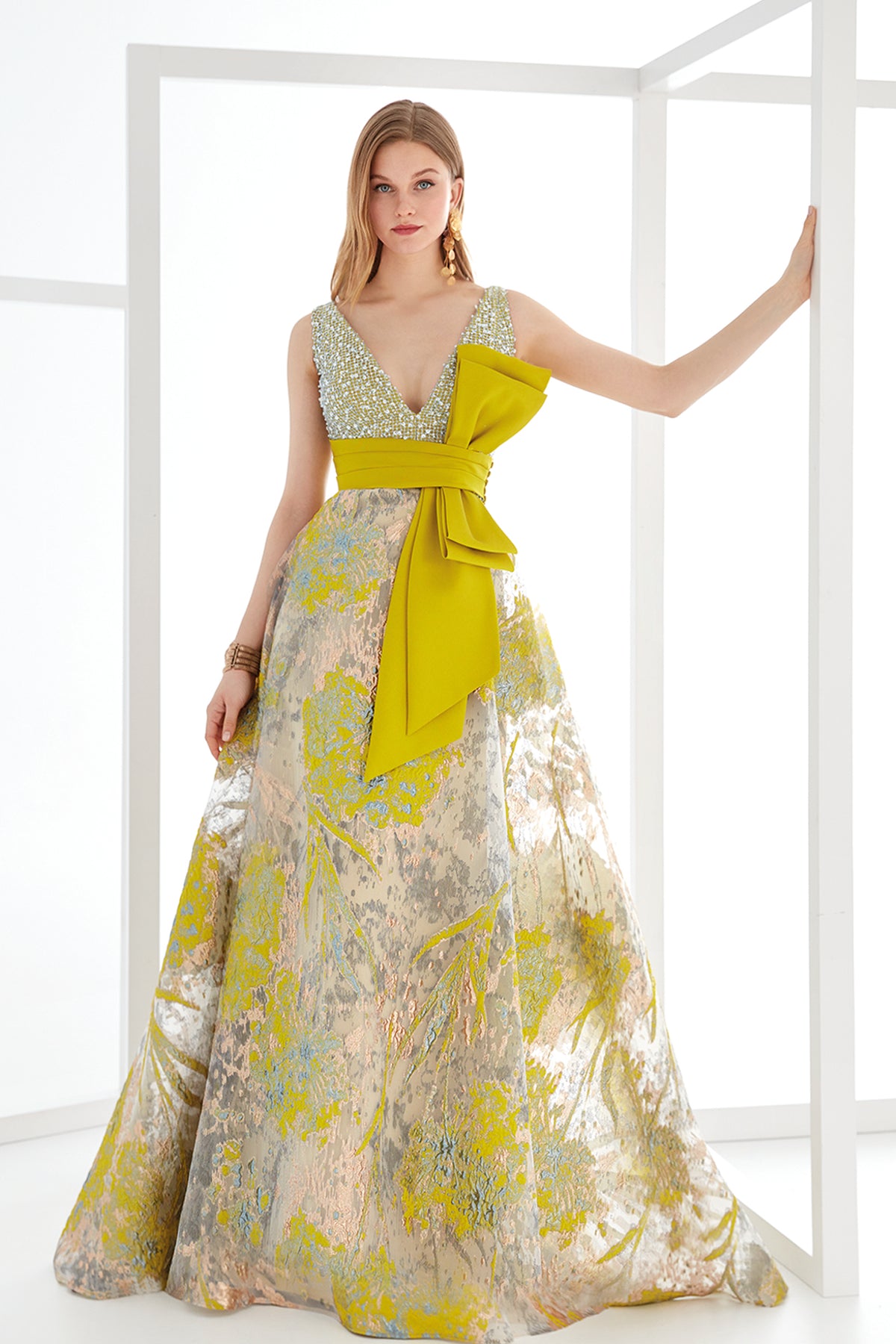Yellow A-line long dress. Featuring a deep V-neckline that flatters the décolletage, with an asymmetric oversized ruffle that sits on one shoulder.