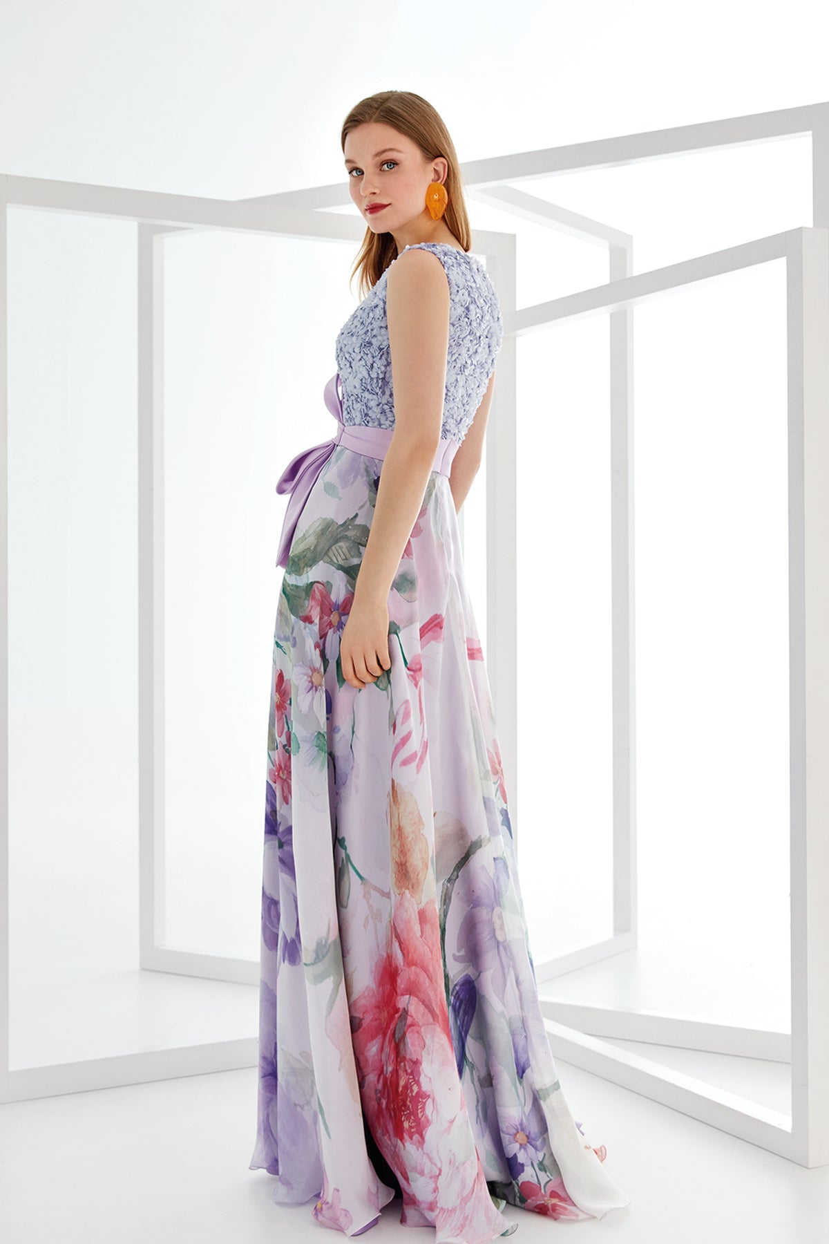 Pale lavender chiffon dress. Featuring an A-line with a fitted bodice that flows into a full, graceful skirt. Complemented with a sweetheart V-neckline formed by cross-draped bodice panels. Completed with a wide waist panel cinched with a large bow belt that sits at the natural waist.