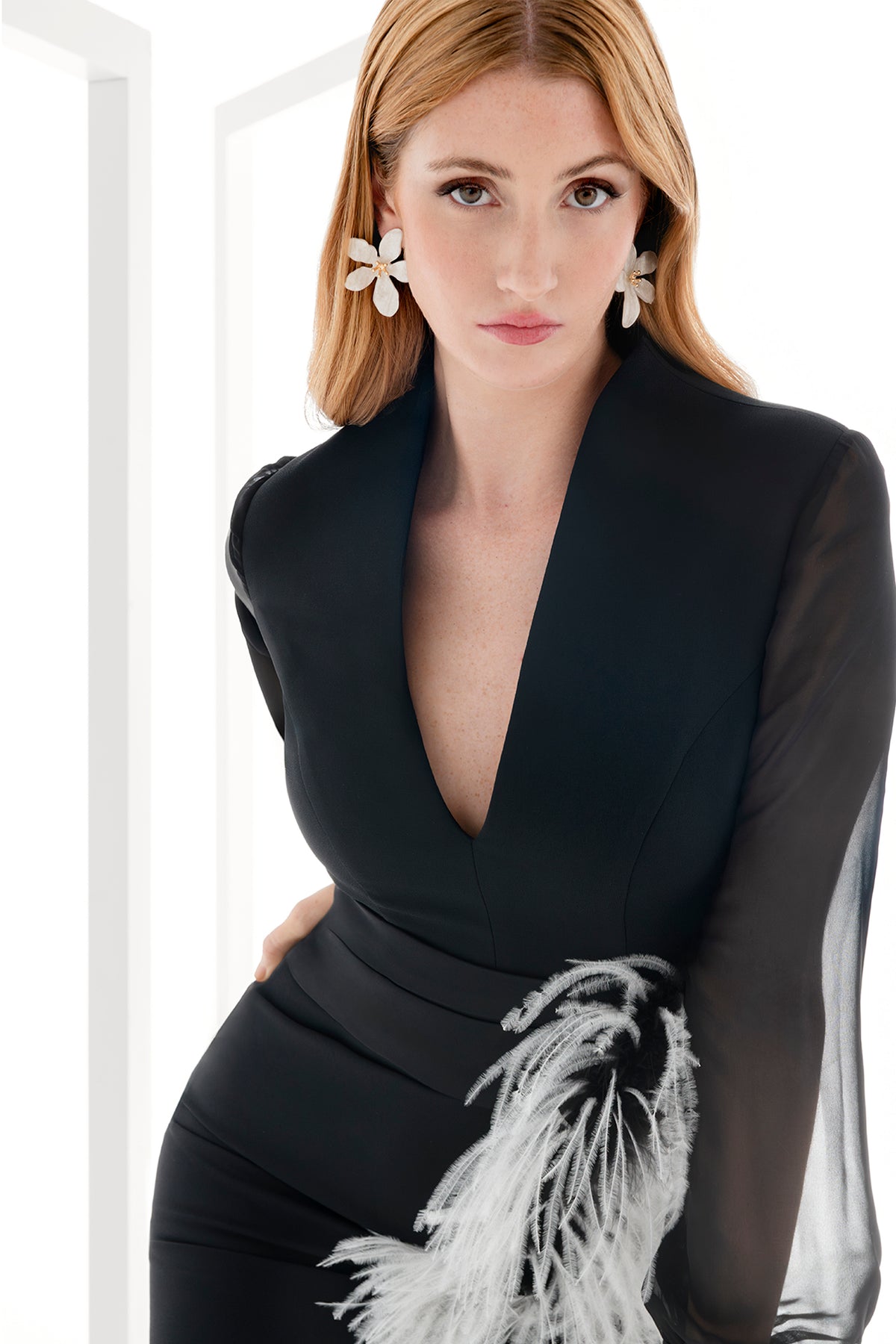 Black long dress with white geometric panels. Featuring a floor-length column silhouette crafted from a smooth, matte fabric that drapes with quiet gravity. Complemented with cape-inspired detail at the waist and shoulders, and the slit at the front of the skirt begins mid-thigh, revealing a glimpse of leg with every step.