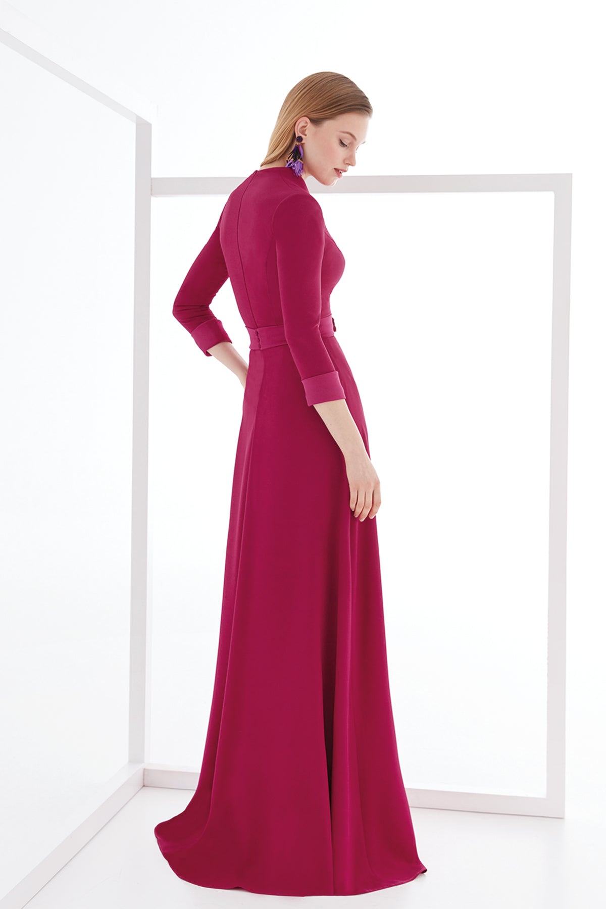 Fuchsia flowy satin long dress. Featuring a fitted bodice that nips at the waist and falls into a full floor-skimming skirt with fluid, sculpted drapes. Complemented with a deep V-neck created by a wrapped bodice. Completed with three-quarter-length sleeves and a belt.